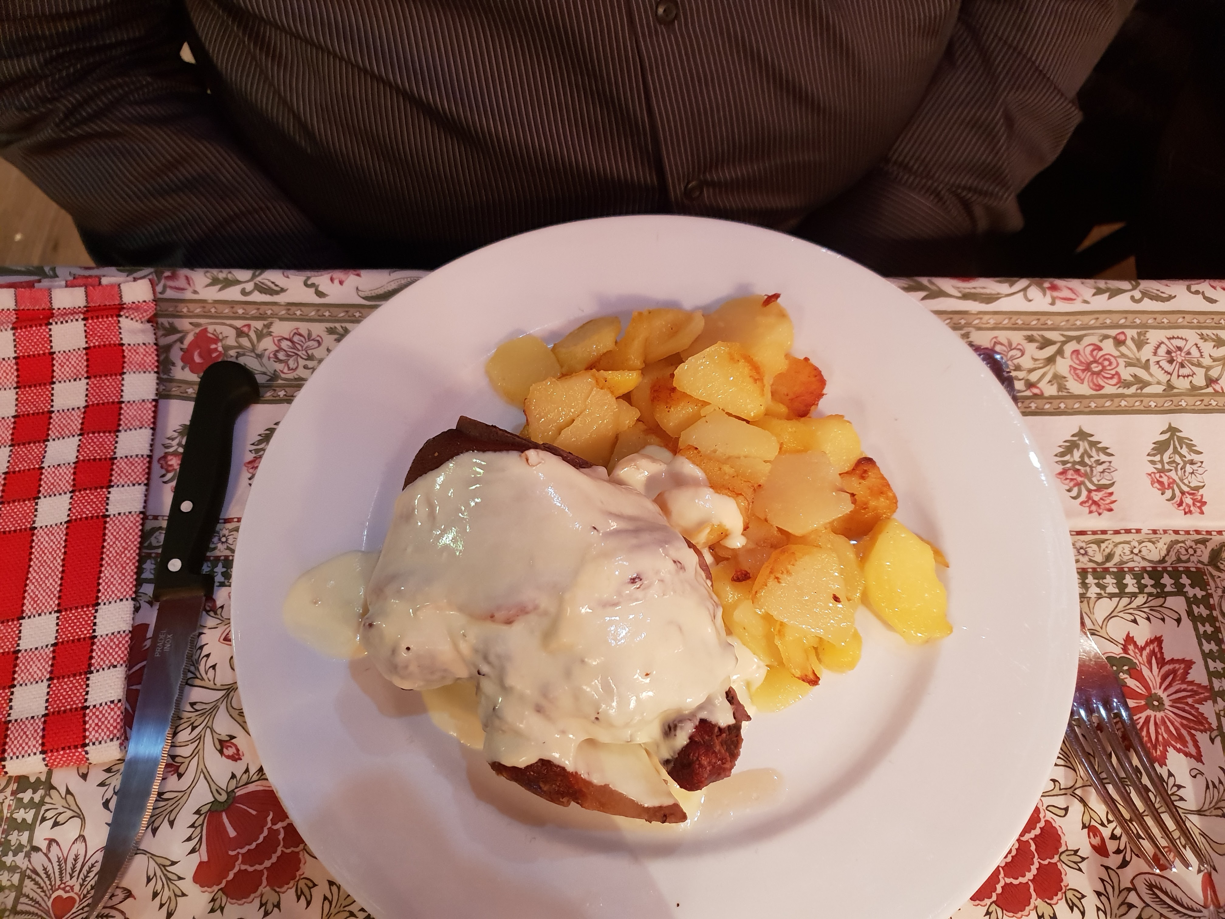 Nous cherchions un restaurant avec les spécialités du coin. Nous n'avons pas été déçu. Cordon bleu maison et fondue munster. Restaurant dans une rue piétonne, très agréable en terrasse. Serveuse super agréable et serviable ! Bon rapport qualité/prix.