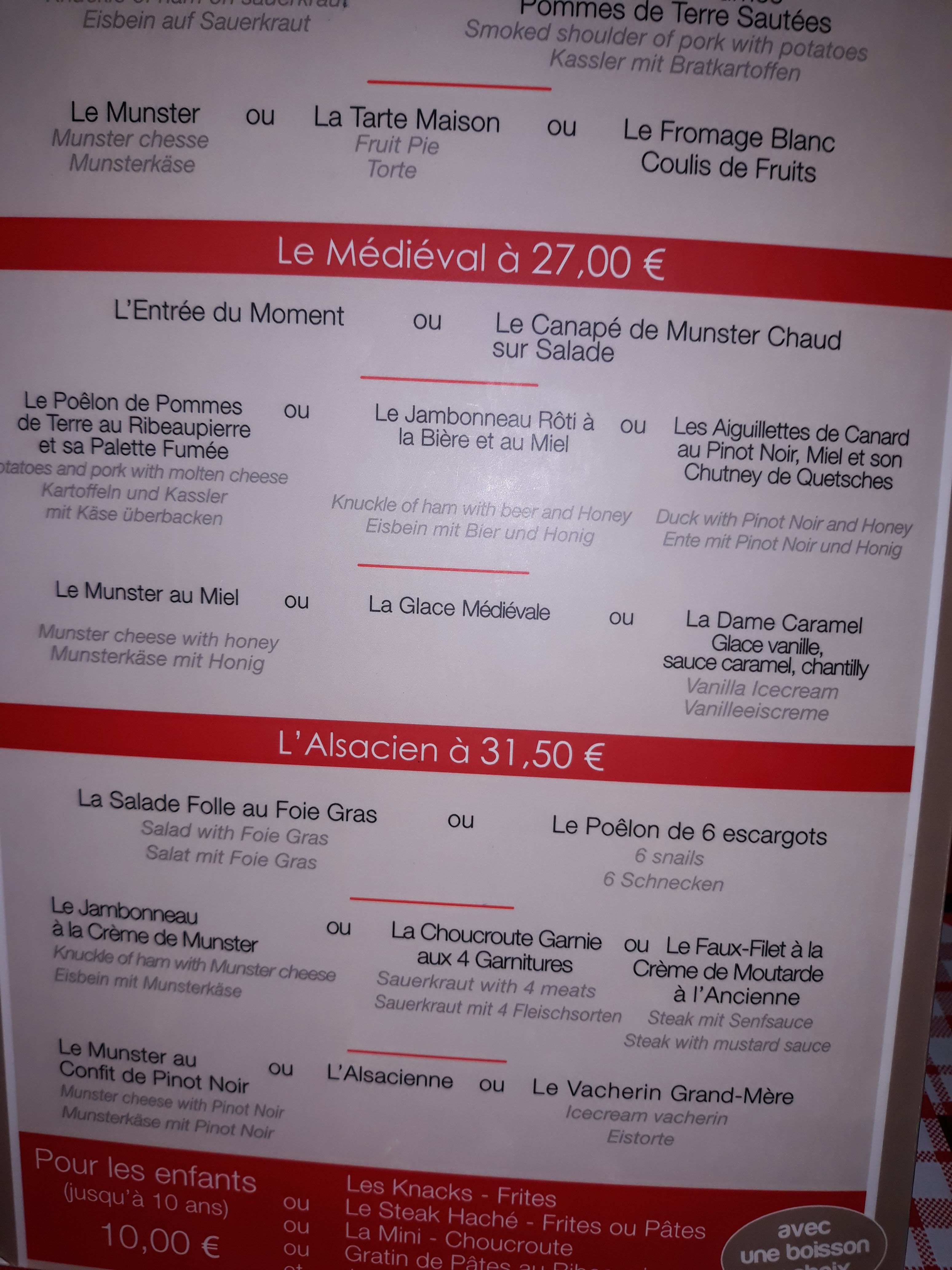 Incontournable si vous passez par Ribeauvillé. De l entrée au dessert, nous avons pris le menu à 33€, les escargots excellents, chouchroute et jambonneau une tuerie. Service parfait merci à toute l équipe.