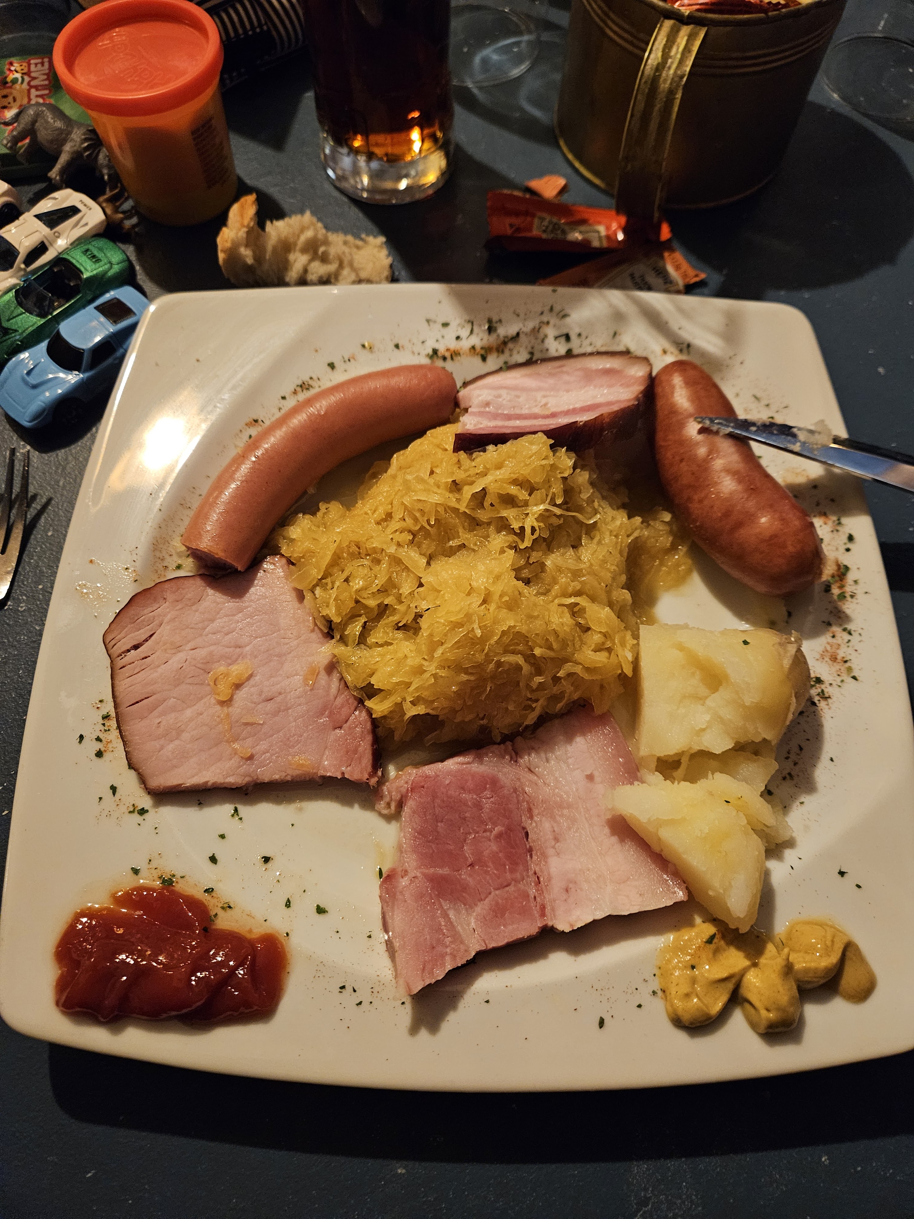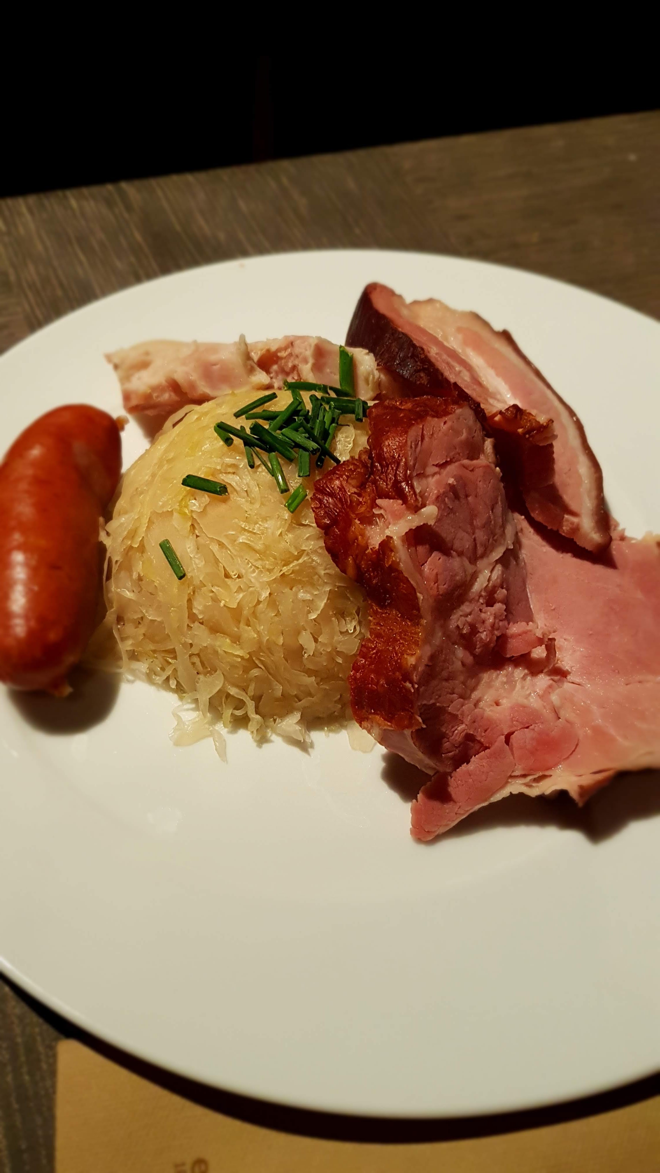 Nous n'avions pas réservé mais le patron nous a trouvé une petite table de deux 😀 Il y avait en effet un peu d'attente mais cela semble normal (période de marché de Noël). De plus en début de repas le patron prévient que le temps d'attente risque d'être un peu long du coup il n'y a pas de Surprises Choucroute très bonne et jambonneau très beau également !