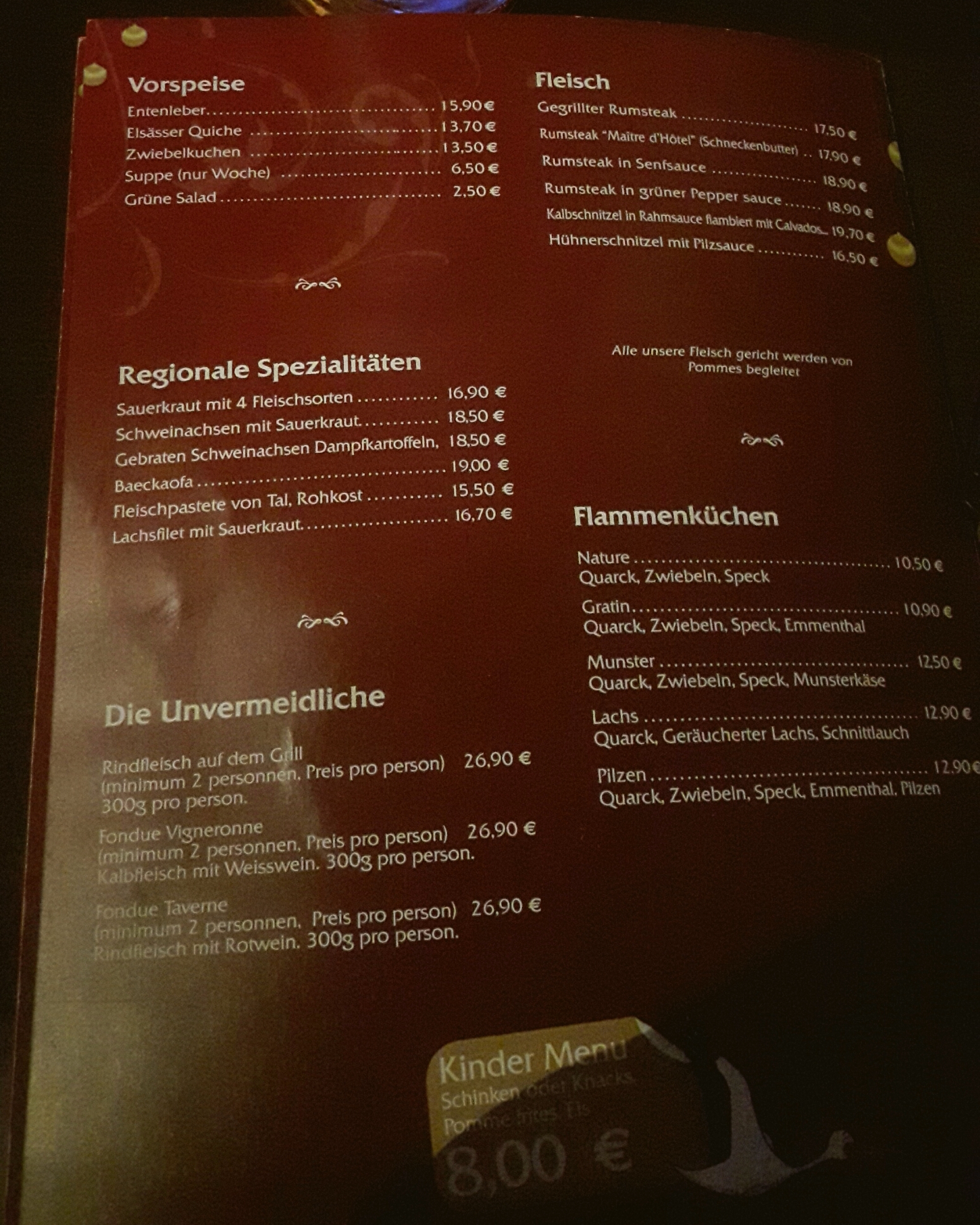 A fuir de toute urgence! Nous avons eu l’honneur de partager un moment de Noël dans cette belle région, mais nous repartons très déçu de notre aspect culinaire d’Alsace. Pas sympathique du tout, à la chaîne vous avez même pas finit de manger qu’on vient vous retirer les assiettes, vous faisant comprendre qu’il fallait partir! Le prix ne s’accorde pas du tout avec la qualité de service, hyper cher pour peu de quantité. On s’est pas du tout bien senti, c’est limite dans l’irrespect du client. (Bousculée par le personnel, car manque de place) Dommage….