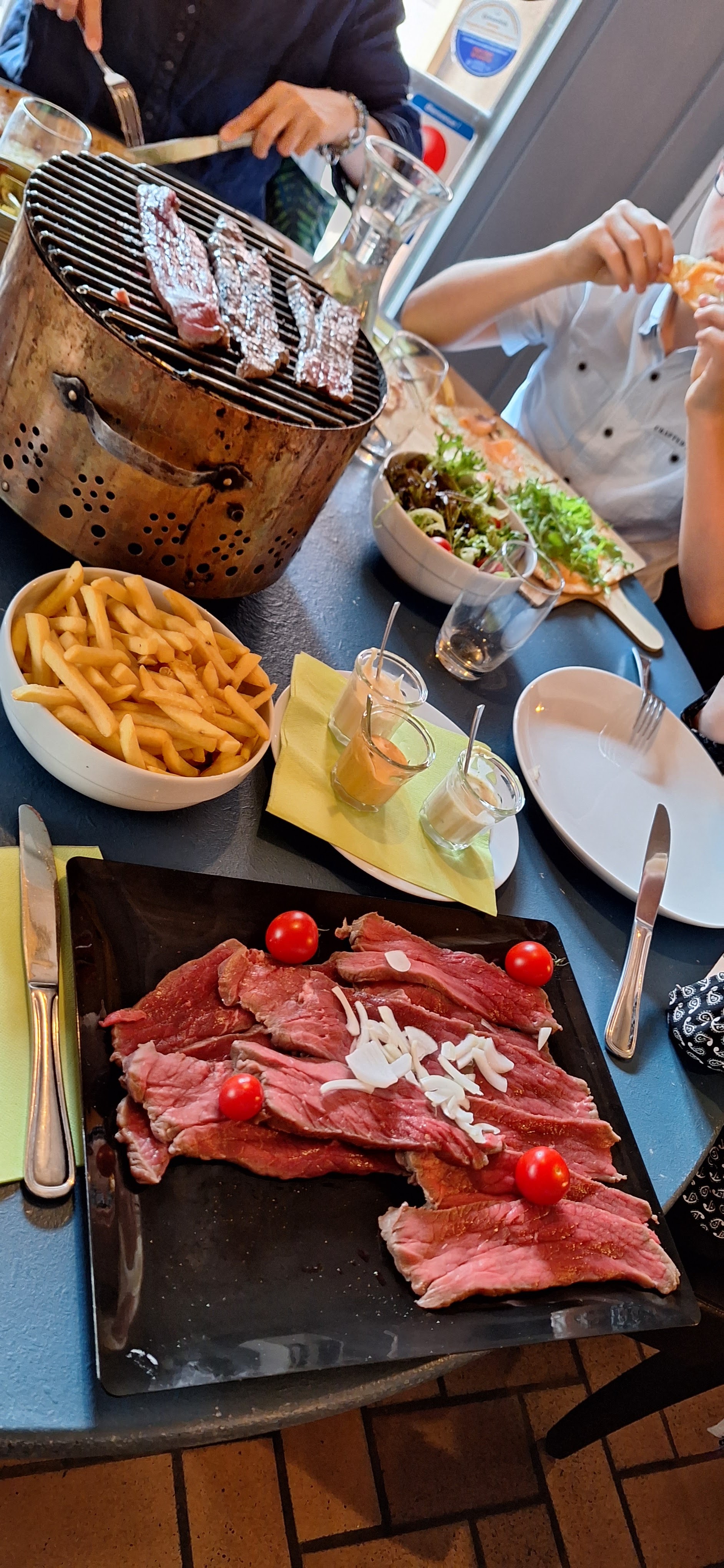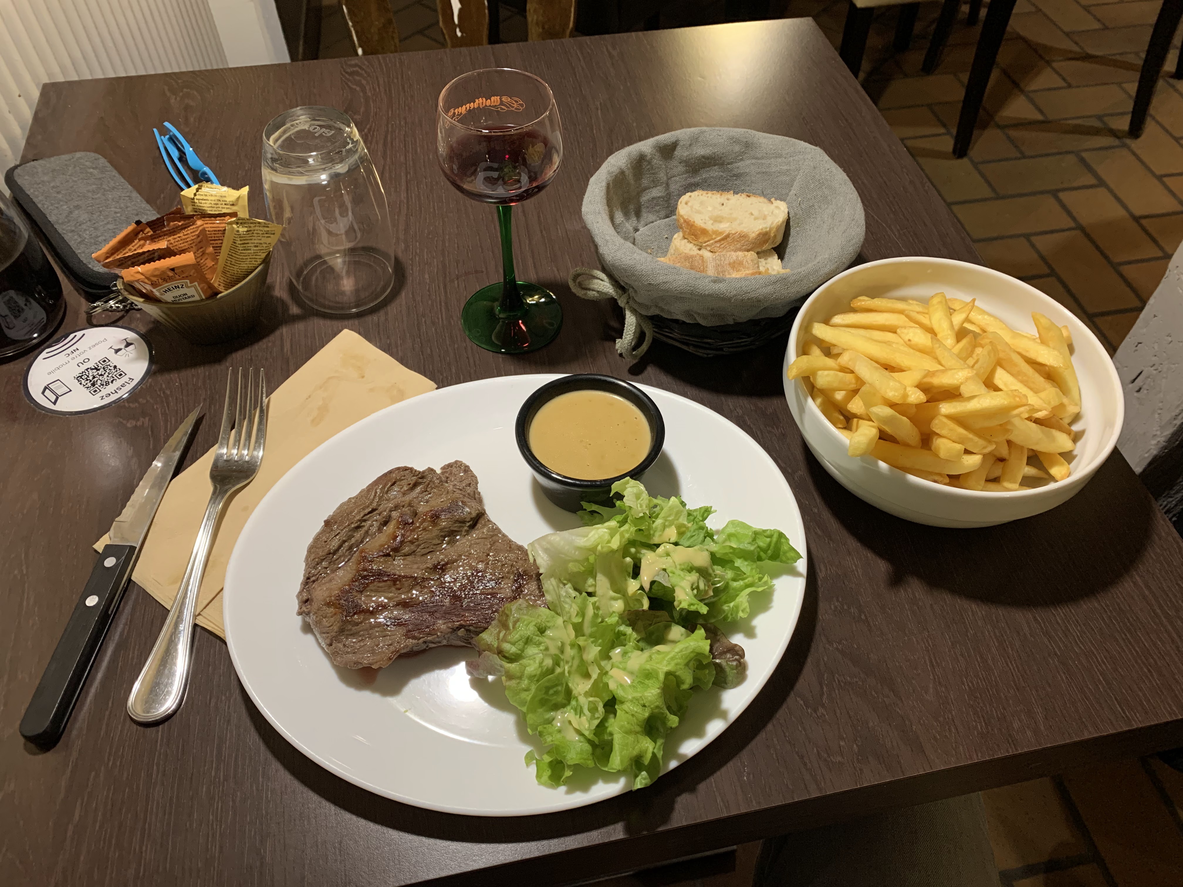 Rumsteack trop cuit, frites surgelées servient 10 minutes après la viande, bouteille de vin vendu 32euros40 alors que de qualité plus que moyenne. De plus le service n'est pas des plus sympathique. Vous pouvez aisément trouver mieux aux alentours.