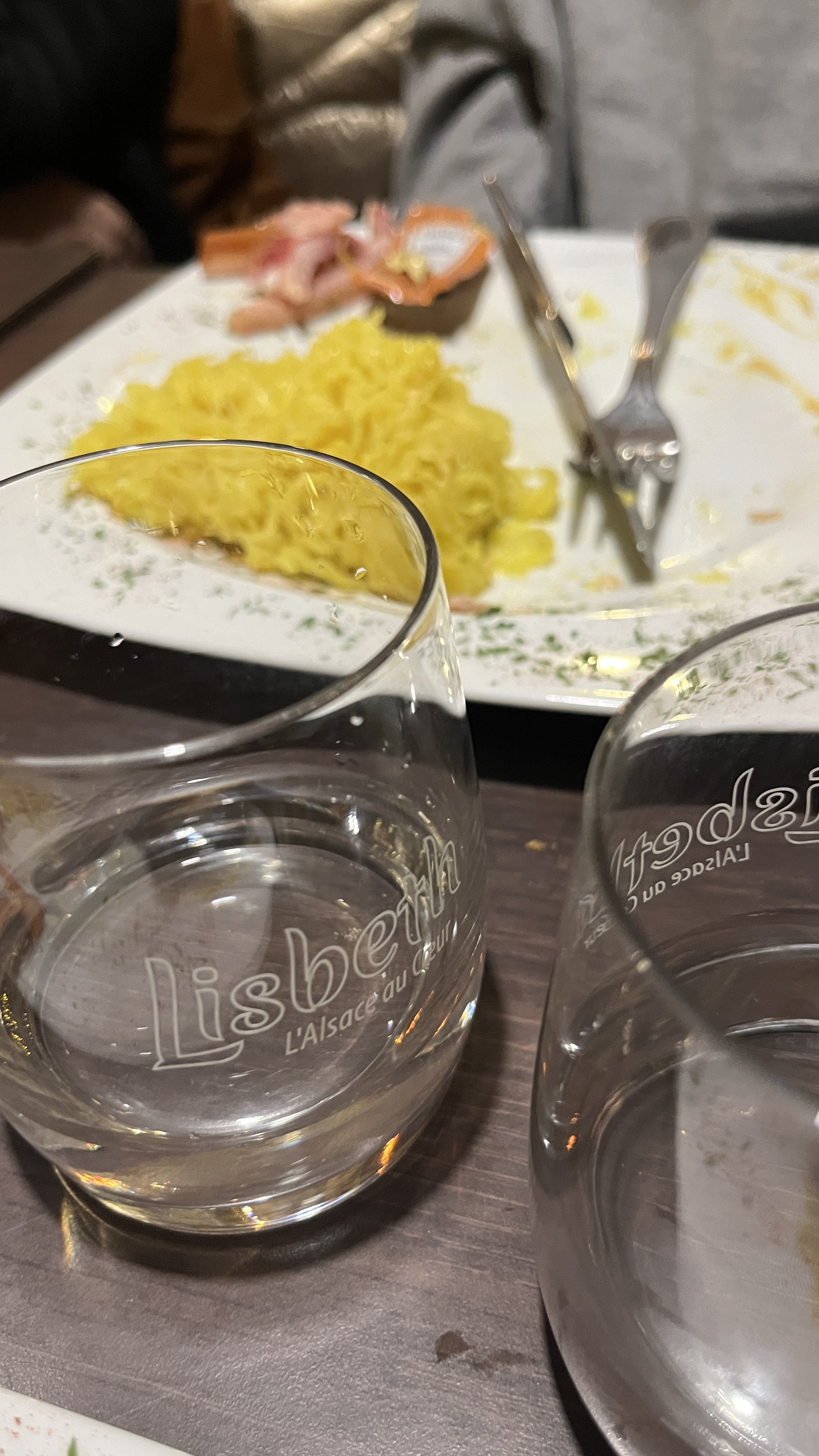 Nous sommes arrivés à cinq personnes, plats : 4 spatzel munster et un backeofa Portions Plat enfants, pas de carafe d'eau pas de pain à table, apéro servi en même temps que les plats... Pas de vin, Pas de dessert... Addition 140€ A fuir....