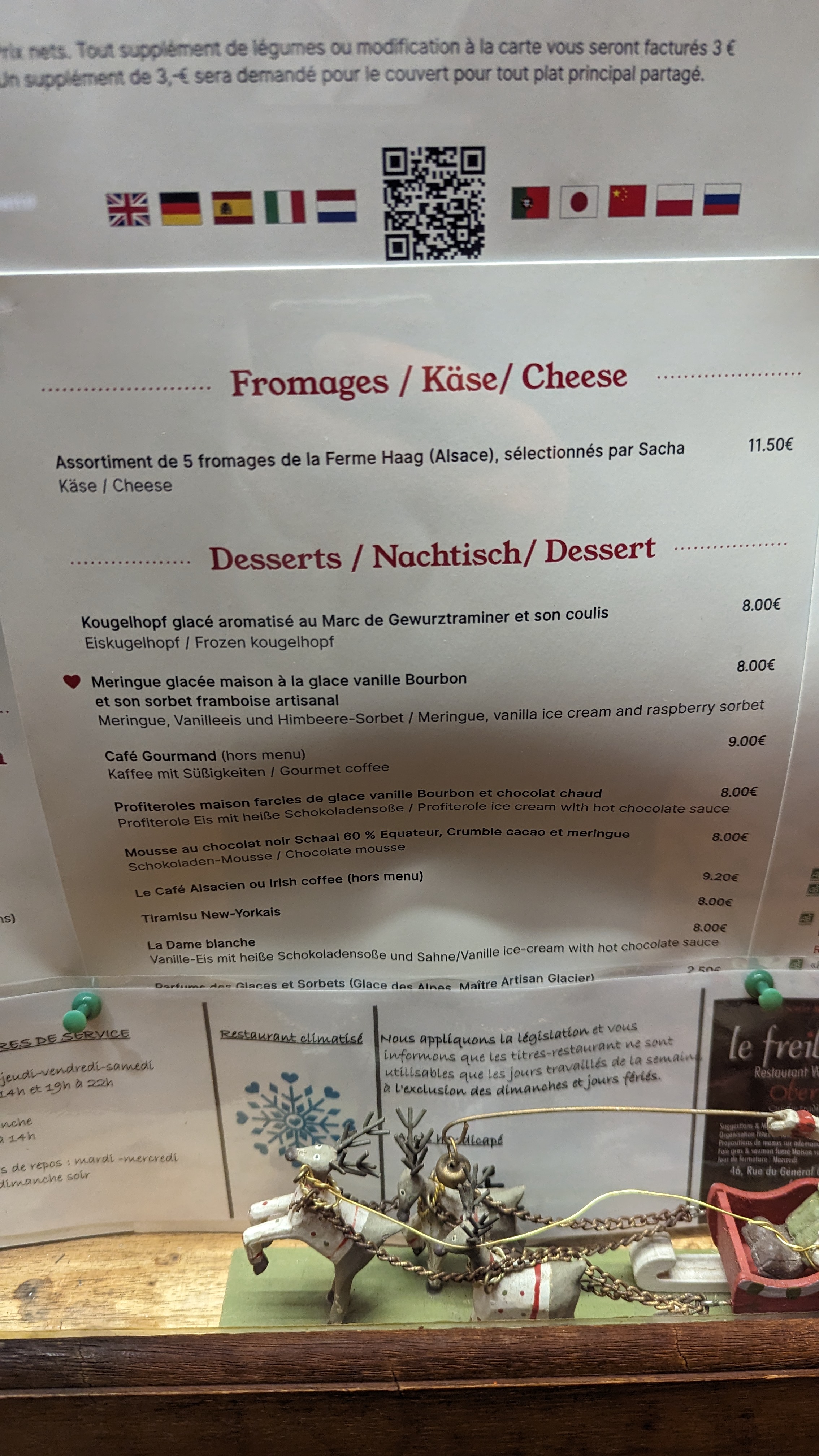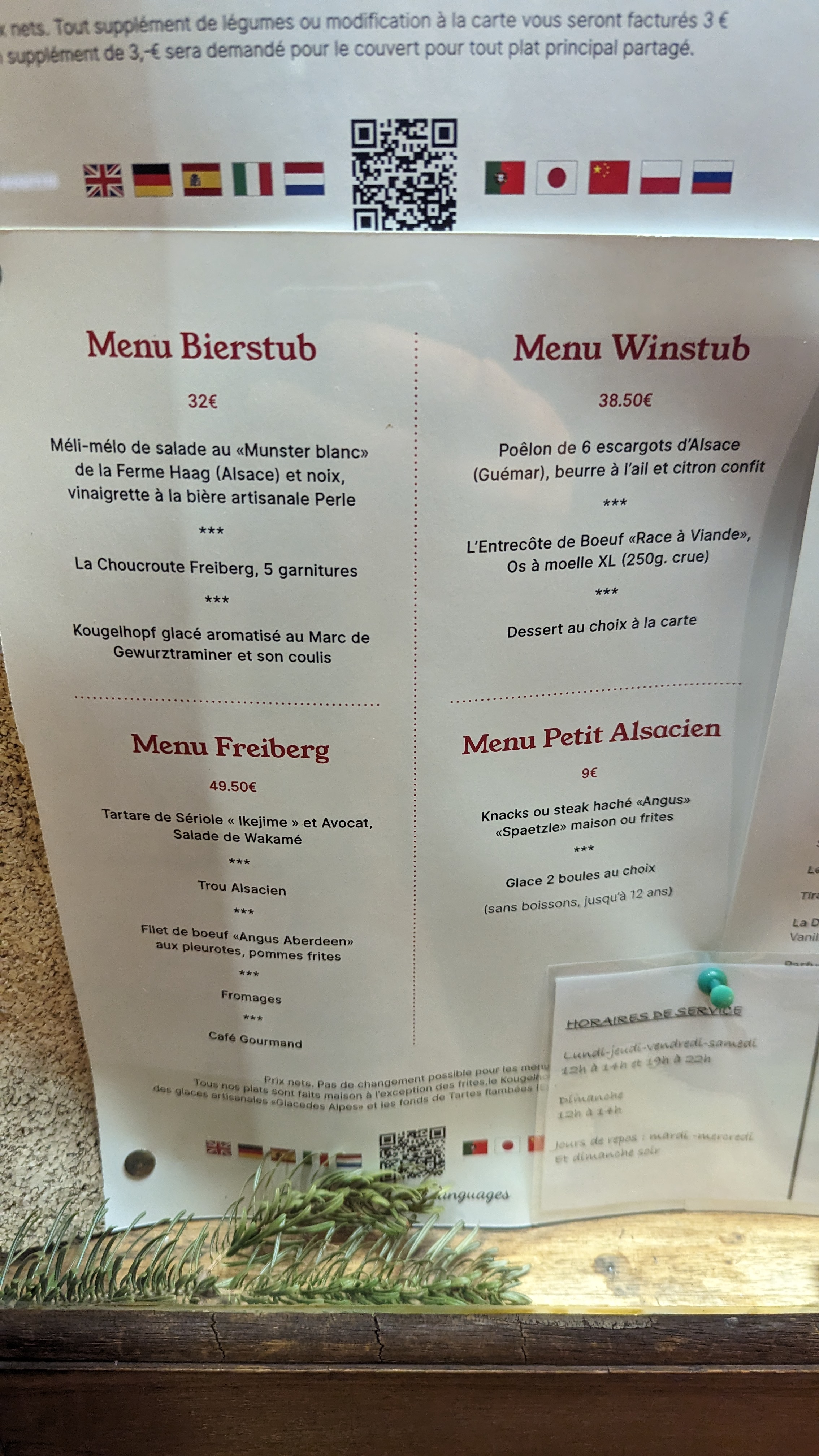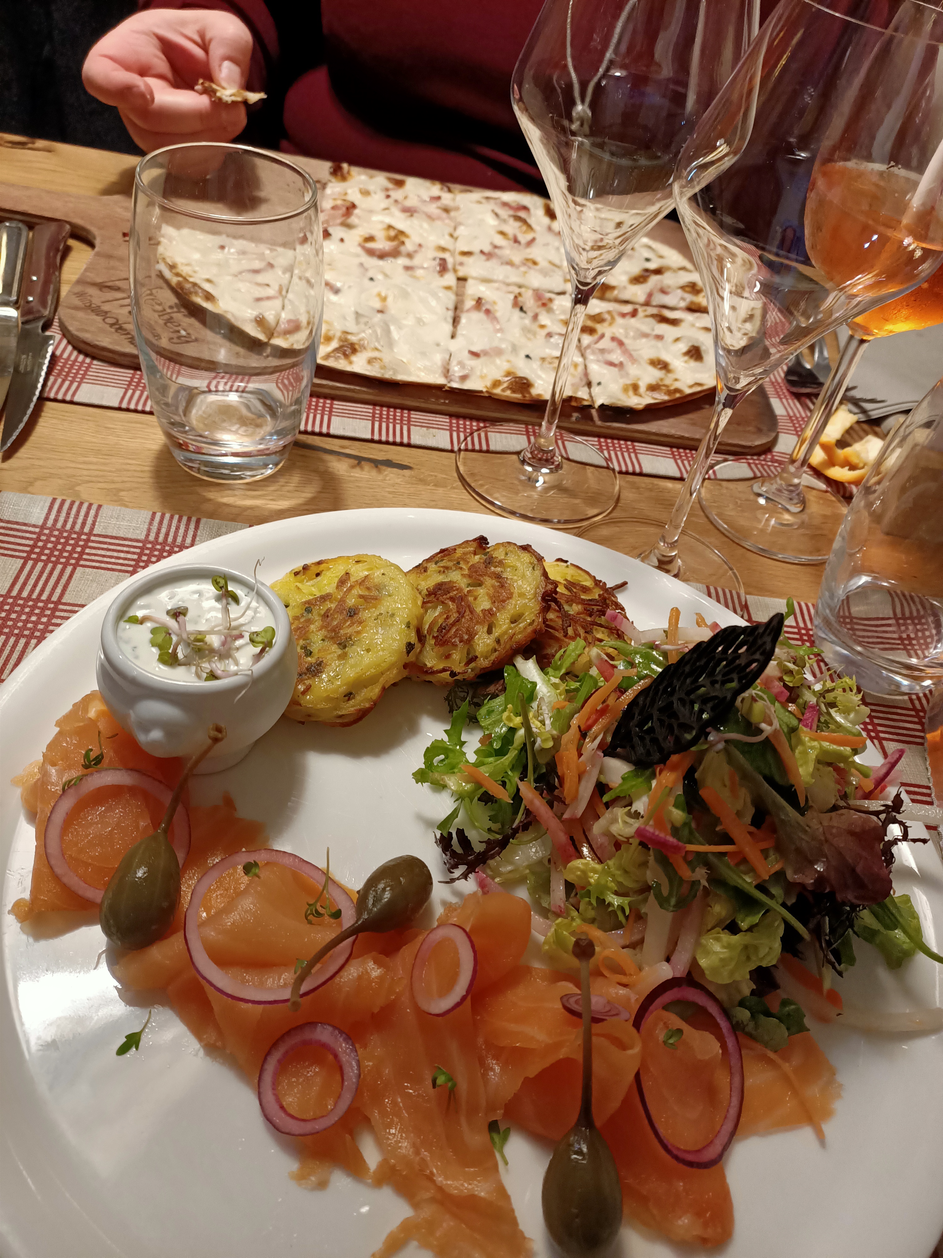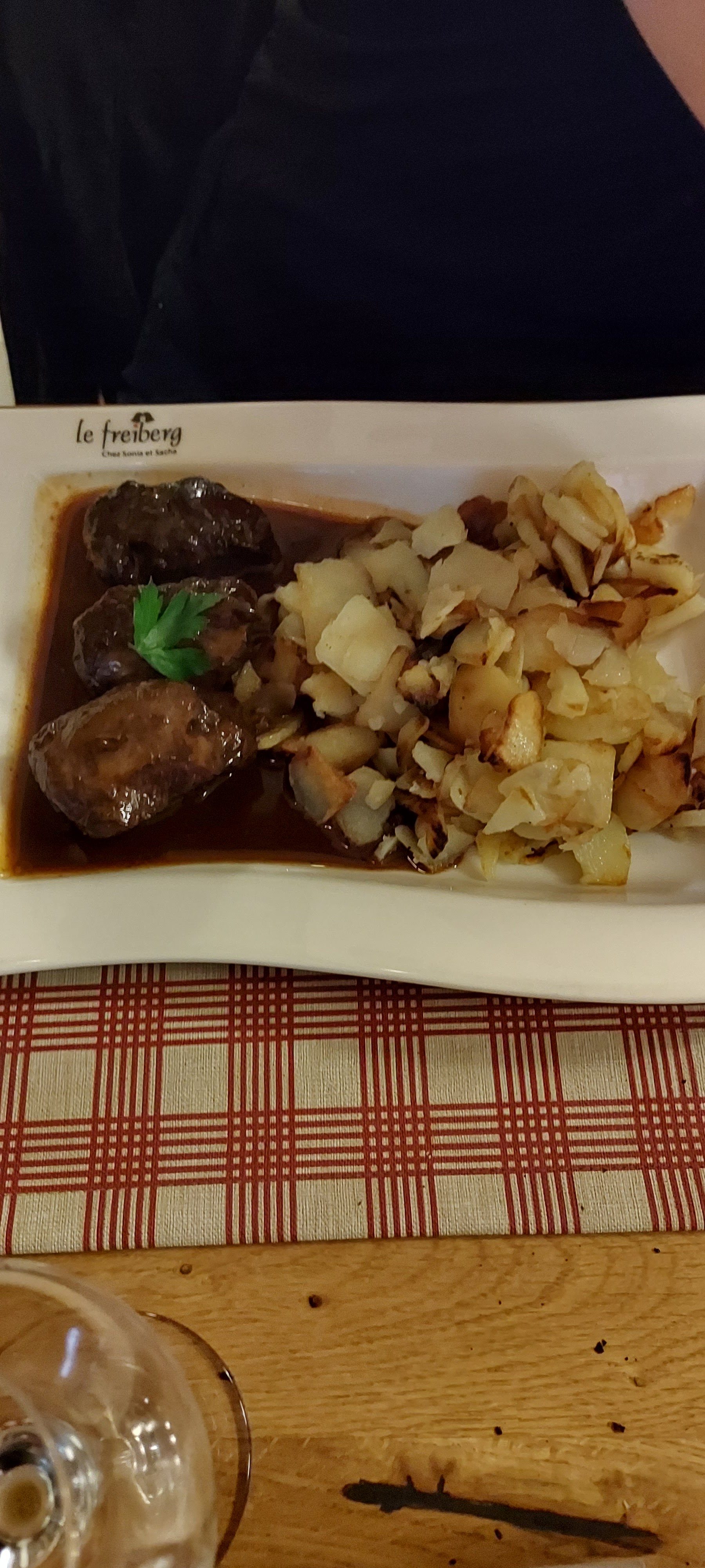 c’est un restaurant avec une cuisine généreuse, de bons plats, un service enjoué et agréable 😊 ! Nous avons découvert le vin klevener de la région, donc merci pour ce conseil ! Et j’ajoute que le tiramisu était délicieux mais aurait pu avoir quelques cerises kirsch en plus !