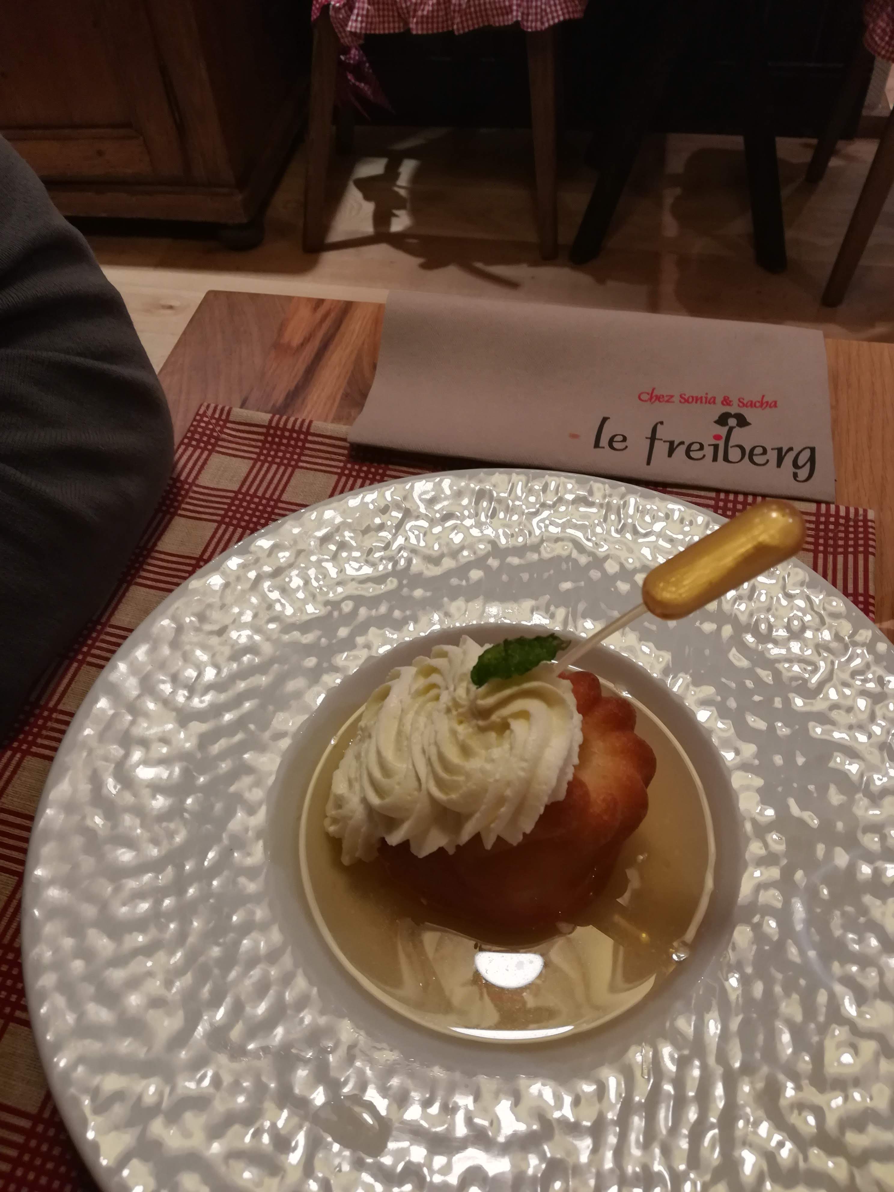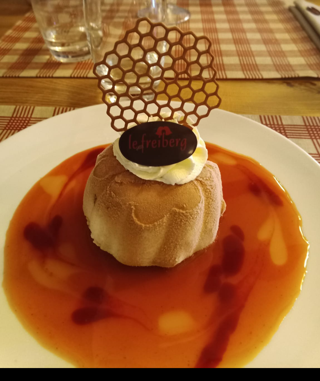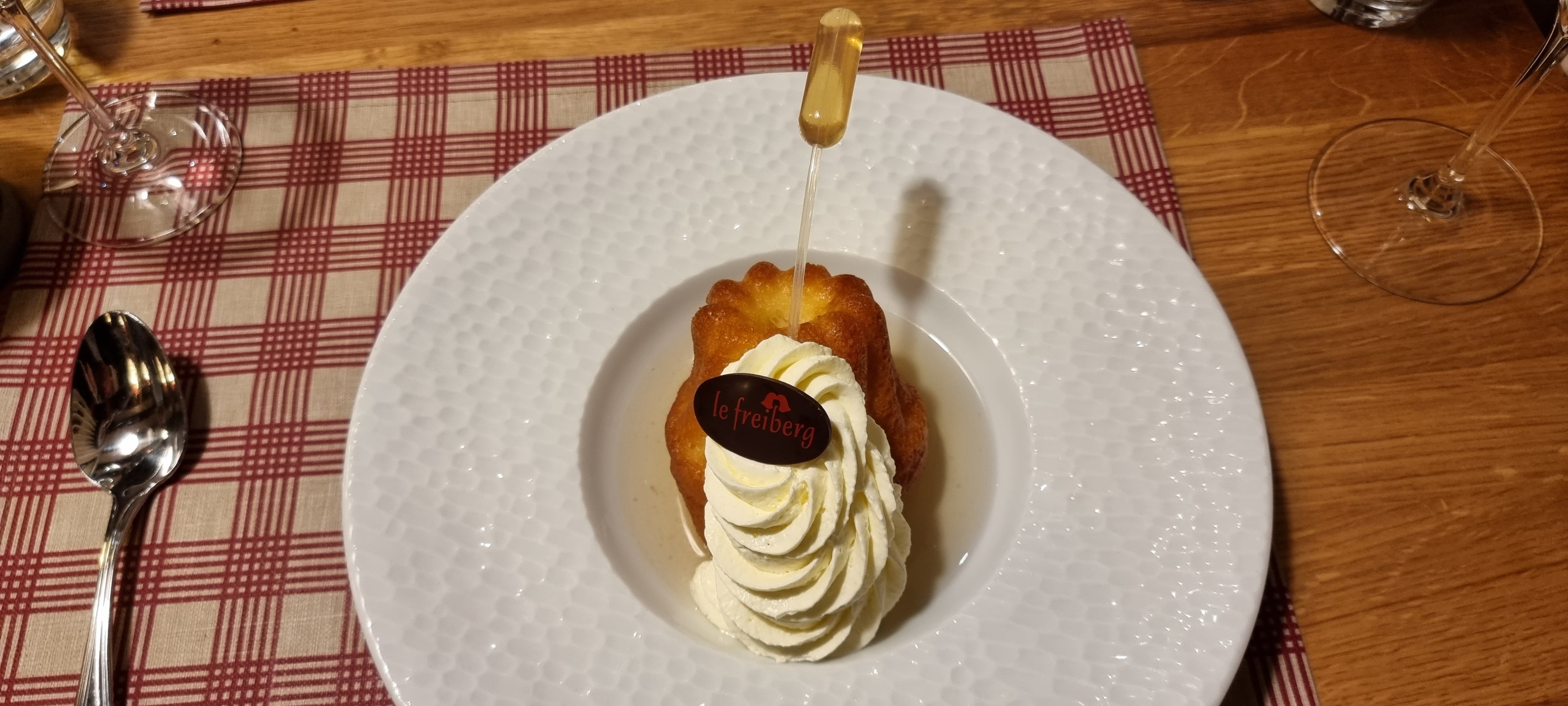 Une Winstub très accueillante, un intérieur pittoresque et une carte très alléchante. Un super point c'est cette vue sur le travail en cuisine car la dite cuisine a des cloisons vitrées permettant entre autres aux clients d'admirer le travail de dressage des plats qui vont arriver sur leur table. Ma compagne et moi-même avons commandé une bouchée à la reine impériale (Vol au vent). C'est un plat succulent que je connaissais déjà bien sûr mais que j'ai trouvé nettement supérieur au Freiberg. Tout est fait maison dans ce plat. La sauce est exquise. L'originalité réside dans les petits morceaux de poulet présents dans la garniture de la bouchée. La bouchée déjà bien garnie est servie avec des pâtes alsaciennes qui se marient très bien avec l'ensemble bouchée et sauce aux champignons. Je recommande aux amateurs. En dessert j'ai commandé une meringue glacée (deux boules de glace, vanille bourbon et framboise, servies entre deux meringues dressées de part et d'autre des boules de glace, le tout surmonté d'une chantilly maison fantastique). Ma compagne a commandé une île flottante tout aussi succulente. Nous sommes sortis enchantés de notre visite au Freiberg et assurément nous y retournerons pour découvrir les autres plats présents sur la carte. Nous recommandons cette Winstub. Un conseil cependant, l'endroit plaît beaucoup, je vous conseille vivement de réserver avant de venir 👍😊. (août 2020) De retour à Obernai en juillet 2021, immanquablement nous sommes retournés au Freiberg et avons re-découvert la bouchée à la reine qui est toujours aussi bonne. Nous avons testé un autre dessert, le croustillant aux framboises et crème fouettée à la vanille. Il se présente comme un mille-feuilles fait de fines feuilles de gâteau florentin avec des framboises, garnies chacune de Coulis de framboise, et superposées avec de la crème fouettée à la vanille. Le tout était surmonté d'une fleur de menthe fraîche, une saveur qui vaut le détour et relève le goût des framboises. Un dessert savoureux et pour autant très léger. Le dessert de ma compagne était une crème brûlée à la vanille et chocolat Ivoire. Délicieuse. Je conseille également. Le restaurant le Freiberg est une valeur sûre 👍😊