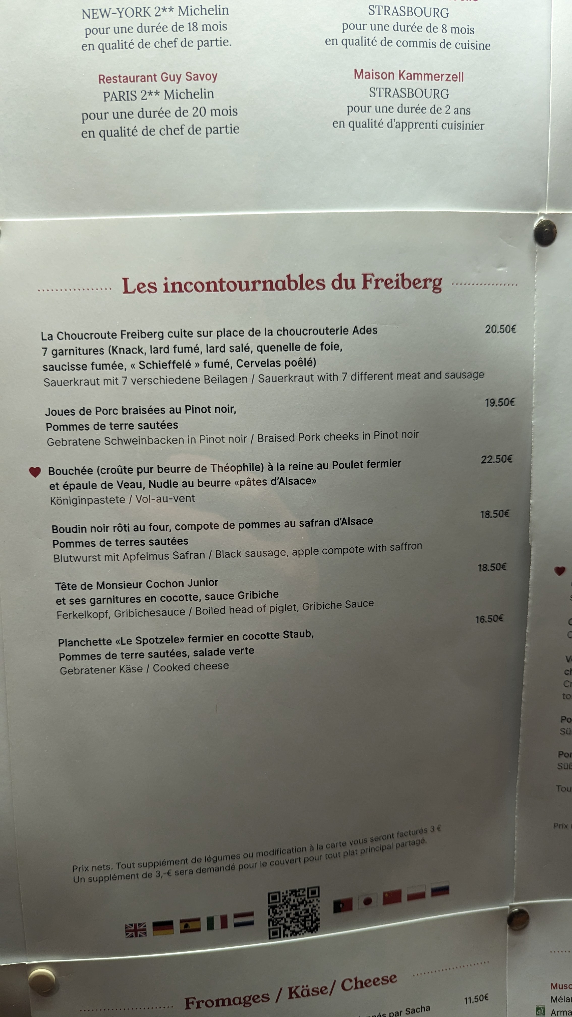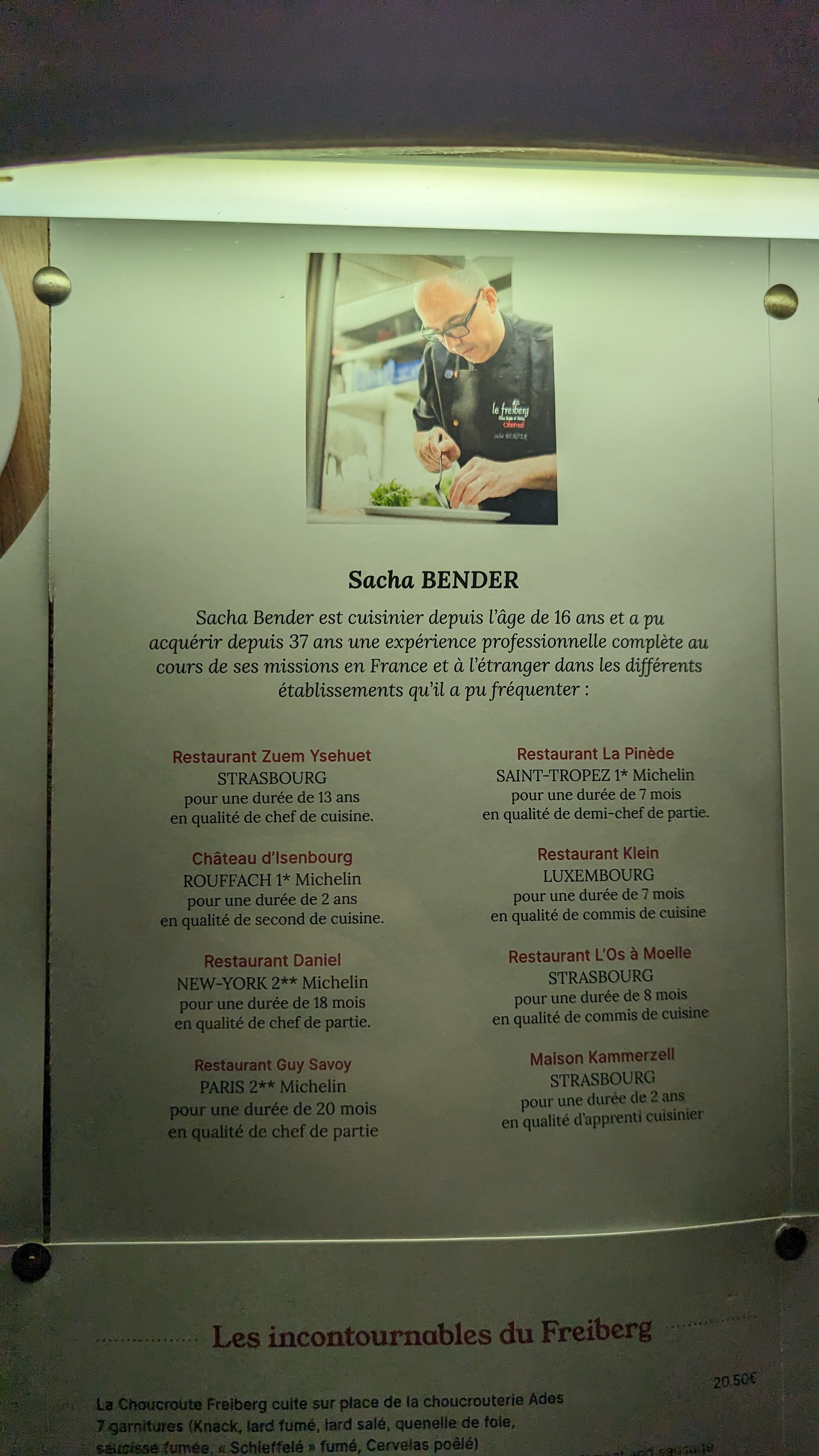 J'ai rarement passé un aussi bon moment. Déjà, maître restaurateur et autant dire que ce n'est pas usurpé. C'était délicieux. On a bien pensé a faire honneur a ce qu'est une winstub, c'est a dire un bar a vin, et on a consommé, et c'était bon ! Les conseils des seveurs étaient pertinents pour un bon accord mets et vin, quel plaisir ! Même la déco, c'était original tout en restant dans le thème tradi alsace j'ai faillis craquer pour un cadre accroché hahaha En tout cas le freiberg c'est un grand oui, merci pour les travaux les couz ❤