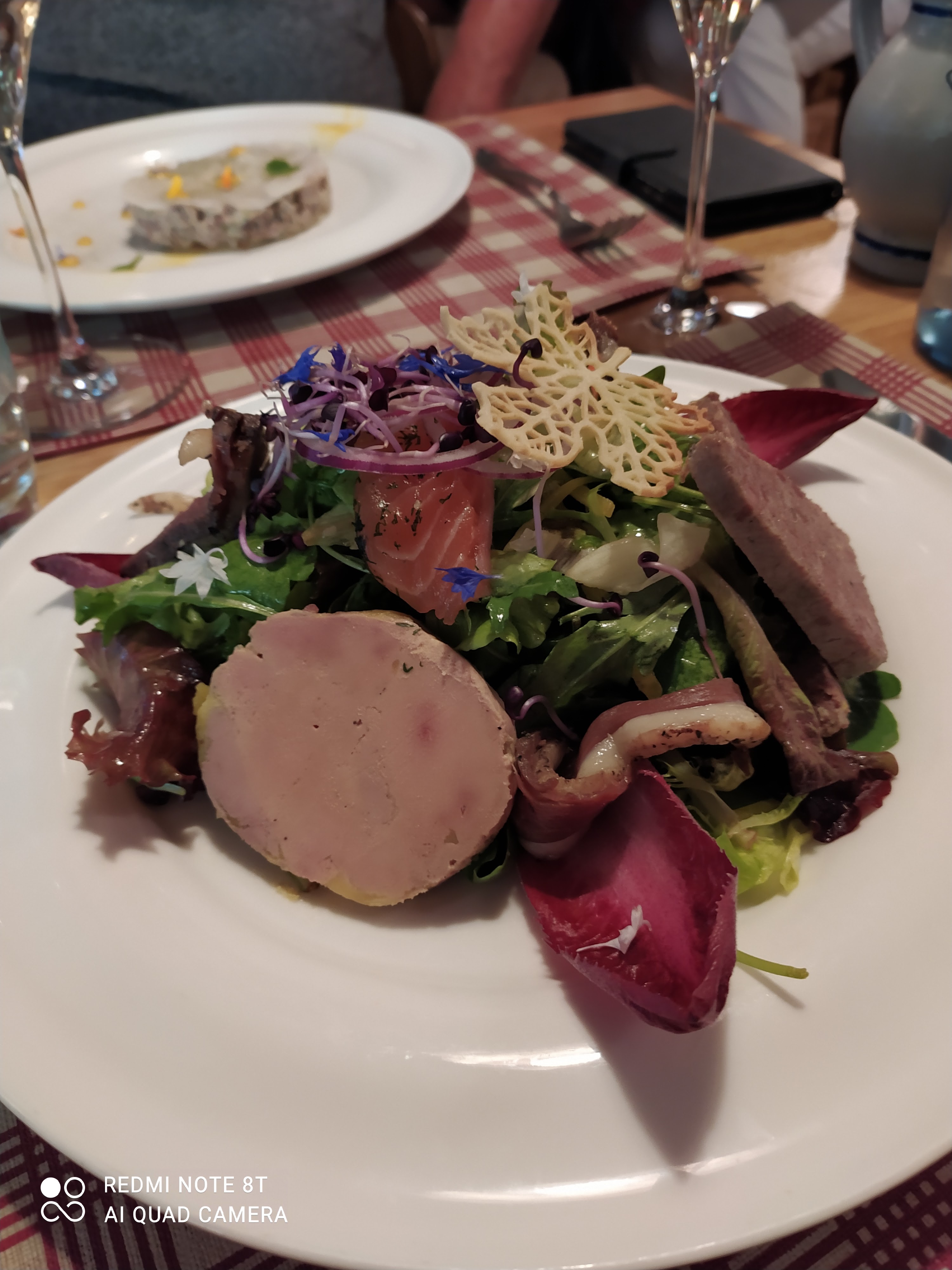Nous y avons mangé ce midi.C est un endroit très bruyant,il n y a pas de terrasse. C étais bon mais pas copieux du tout. J ai pris la salade gourmande à 18 euros ,il y a un tout petit morceau de foie gras ,deux petite tranche de magret et un tout petit filet de saumon et beaucoup beaucoup beaucoup de salade verte. Je n y retournerai pas