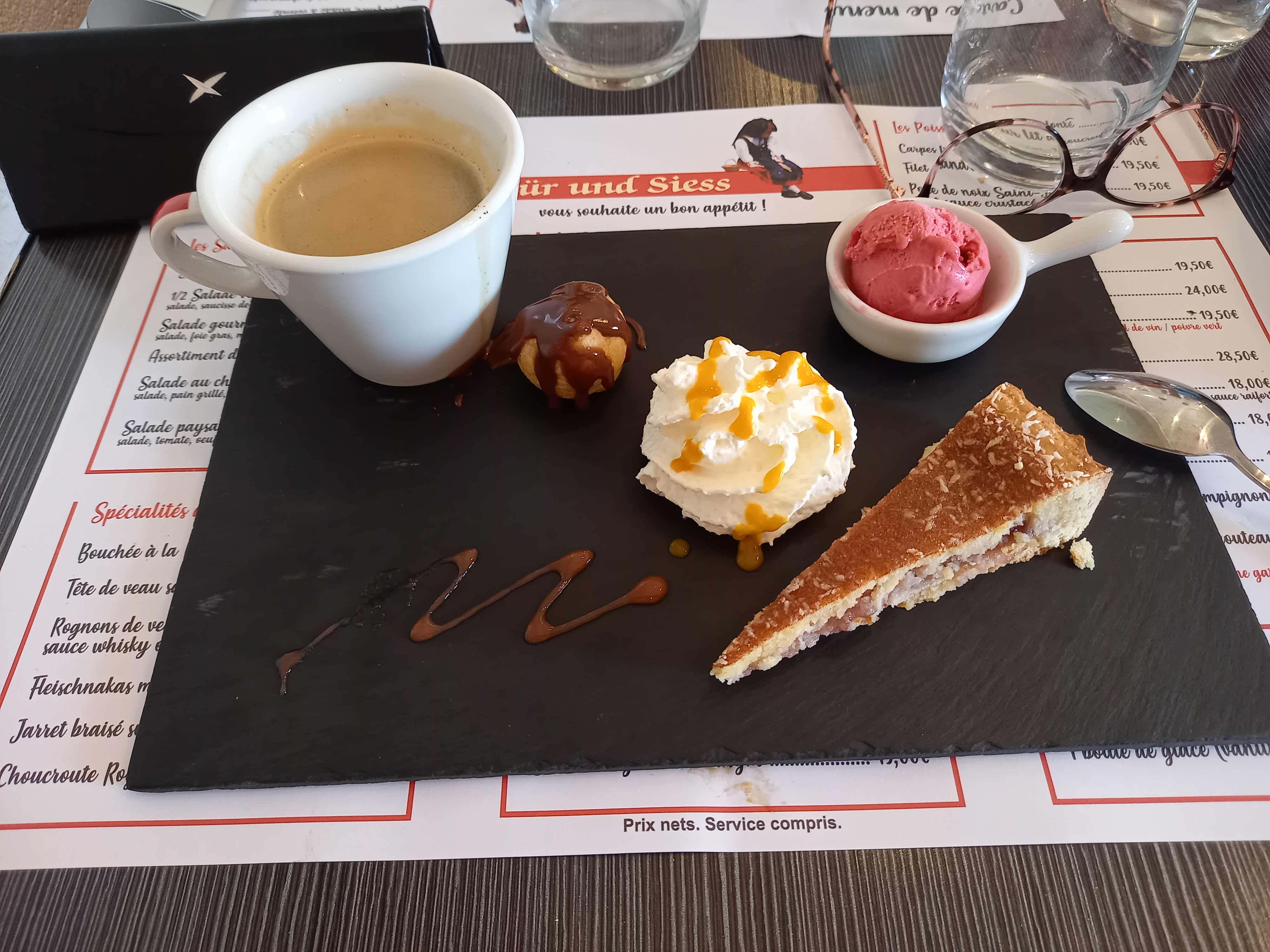 Le jarret de porc sauce munster et le café gourmand étaient au top ce soir. J'ai écouté les commentaires des autres convives de notre table : tout le monde a apprécié. Repas et service très bien, ambiance agréable, tout le monde y trouve son compte.Le passage du patron a été apprécié aussi 👏👏👍