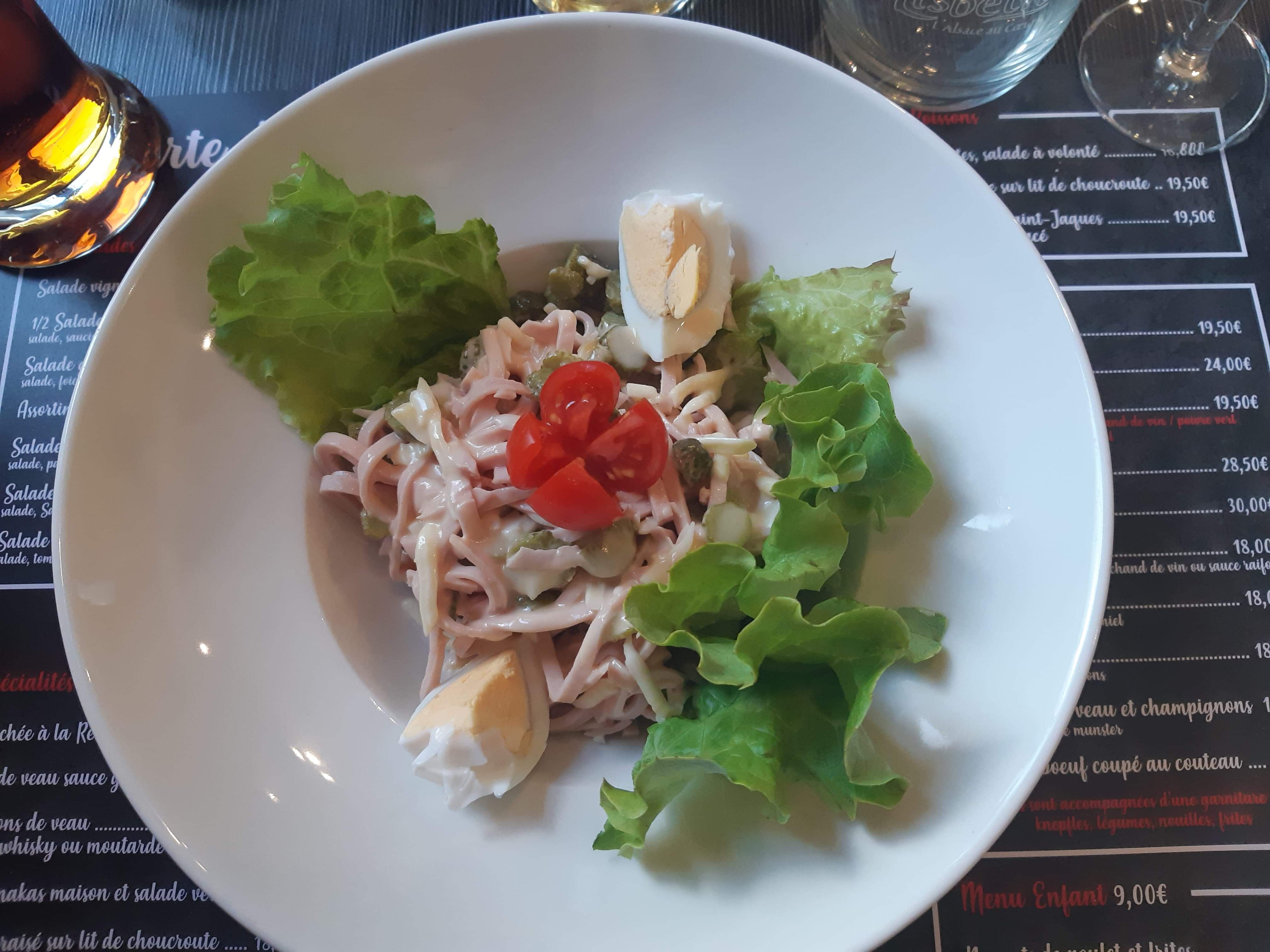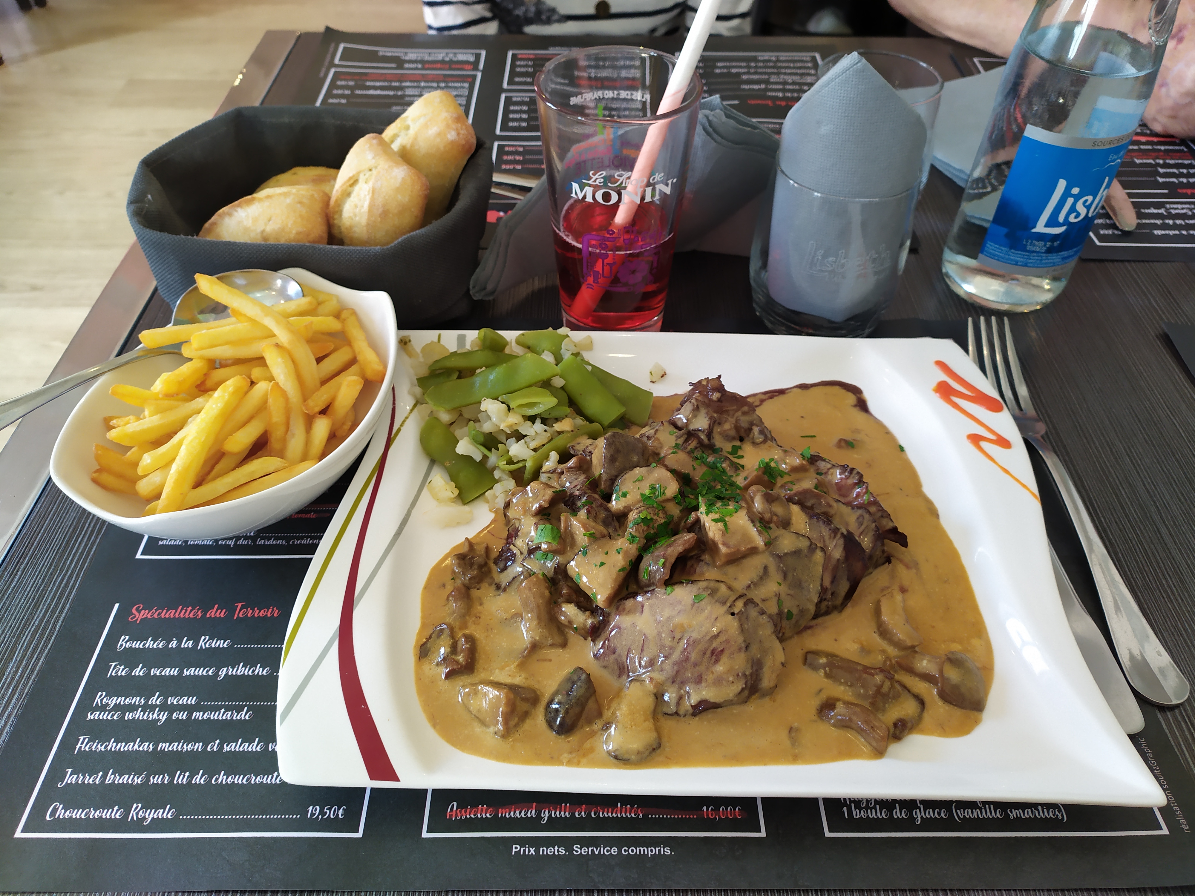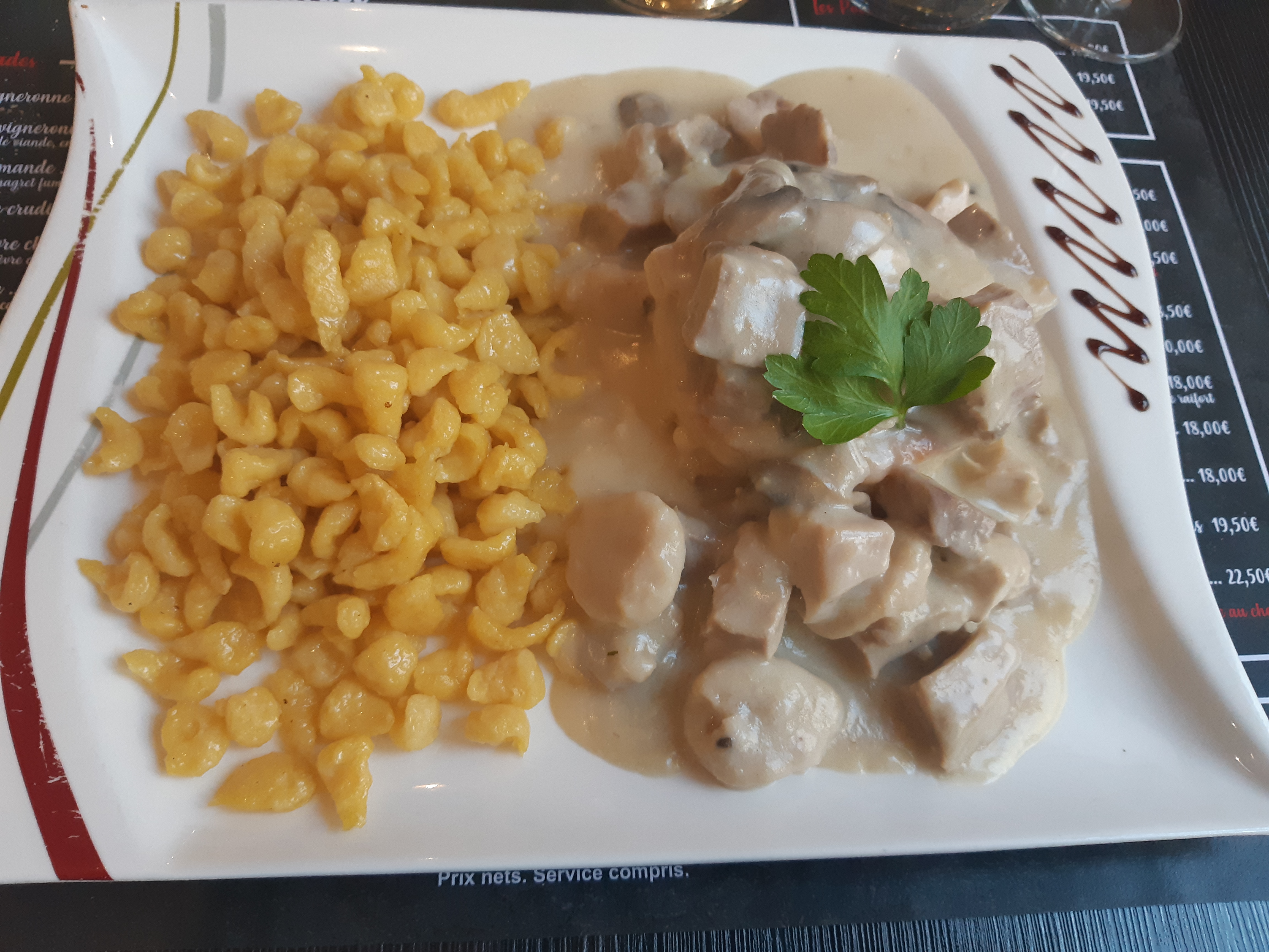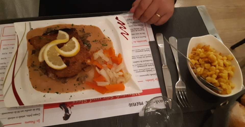 Repas bon dans l'ensemble. mais attention à la propreté des assiettes. Le rebord des assiettes était très sale ainsi que le ramequin de spaetzle. cela est inadmissible.