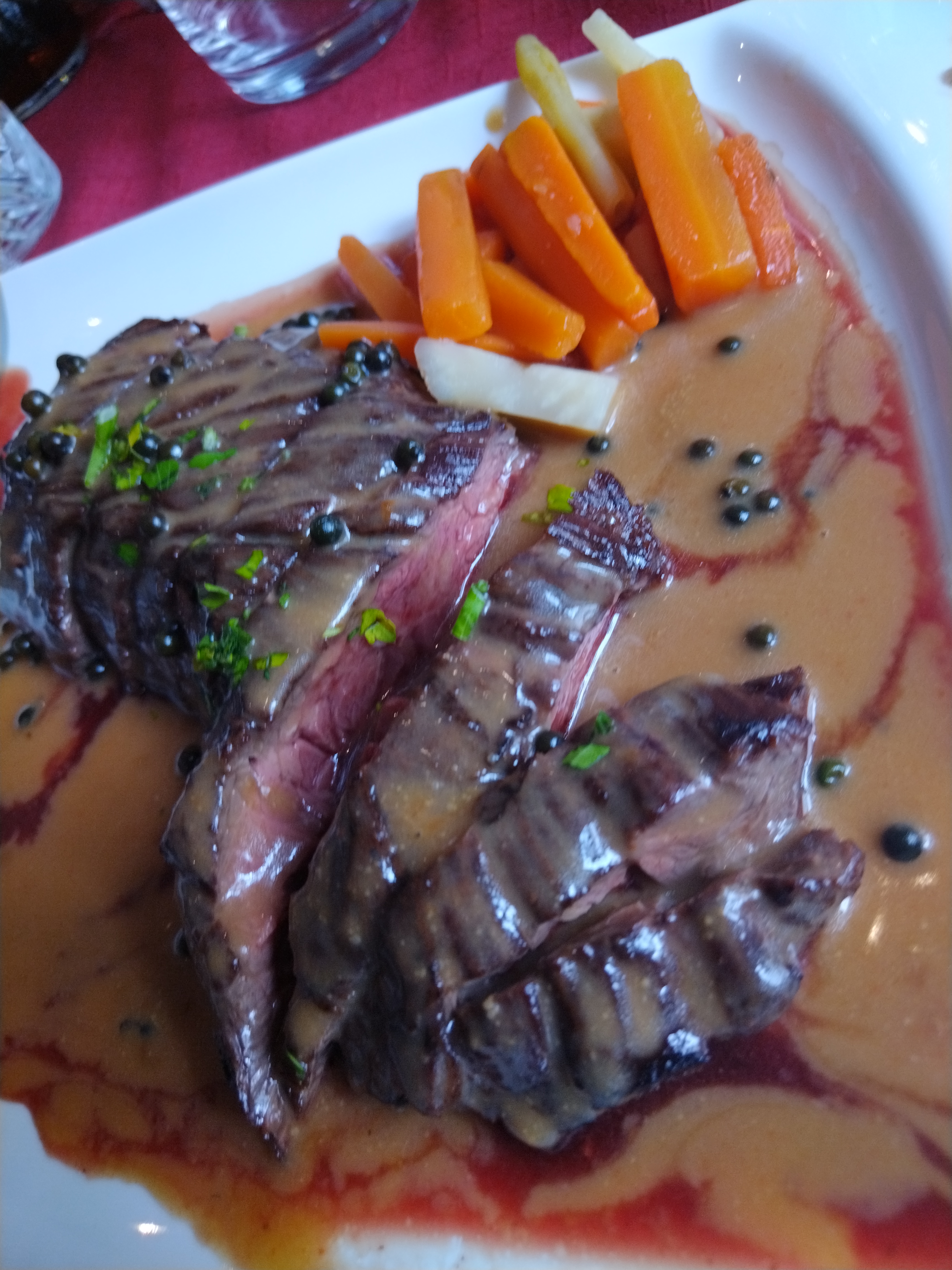 Très bonne noix de bœuf sauce au poivre avec frites et légumes