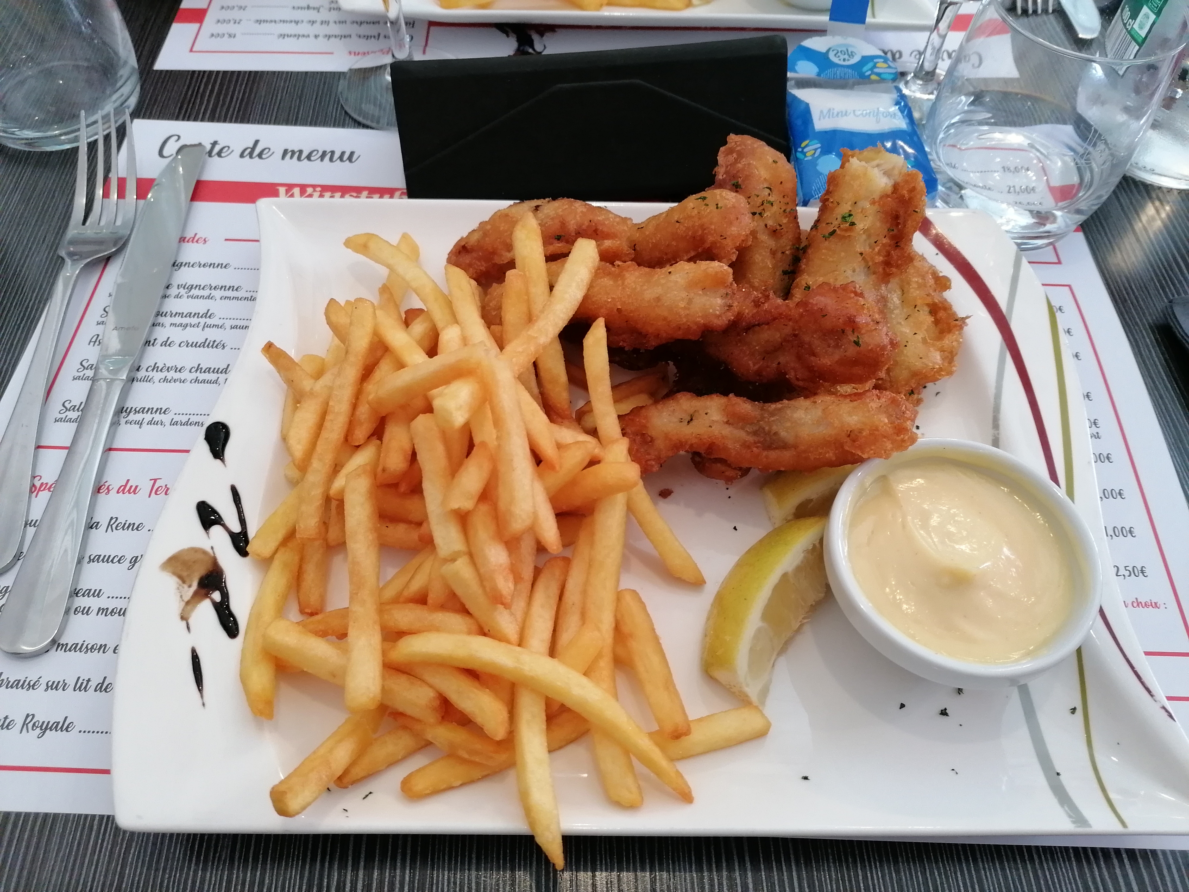 Nous avons pris les carpes frites (la pâte est vraiment goûteuse et va bien avec les carpes )Une petite mayonnaise frites et salade accompagnent le plat pour un prix de~ 18 euros L endroit est simple et le personnel à votre disposition