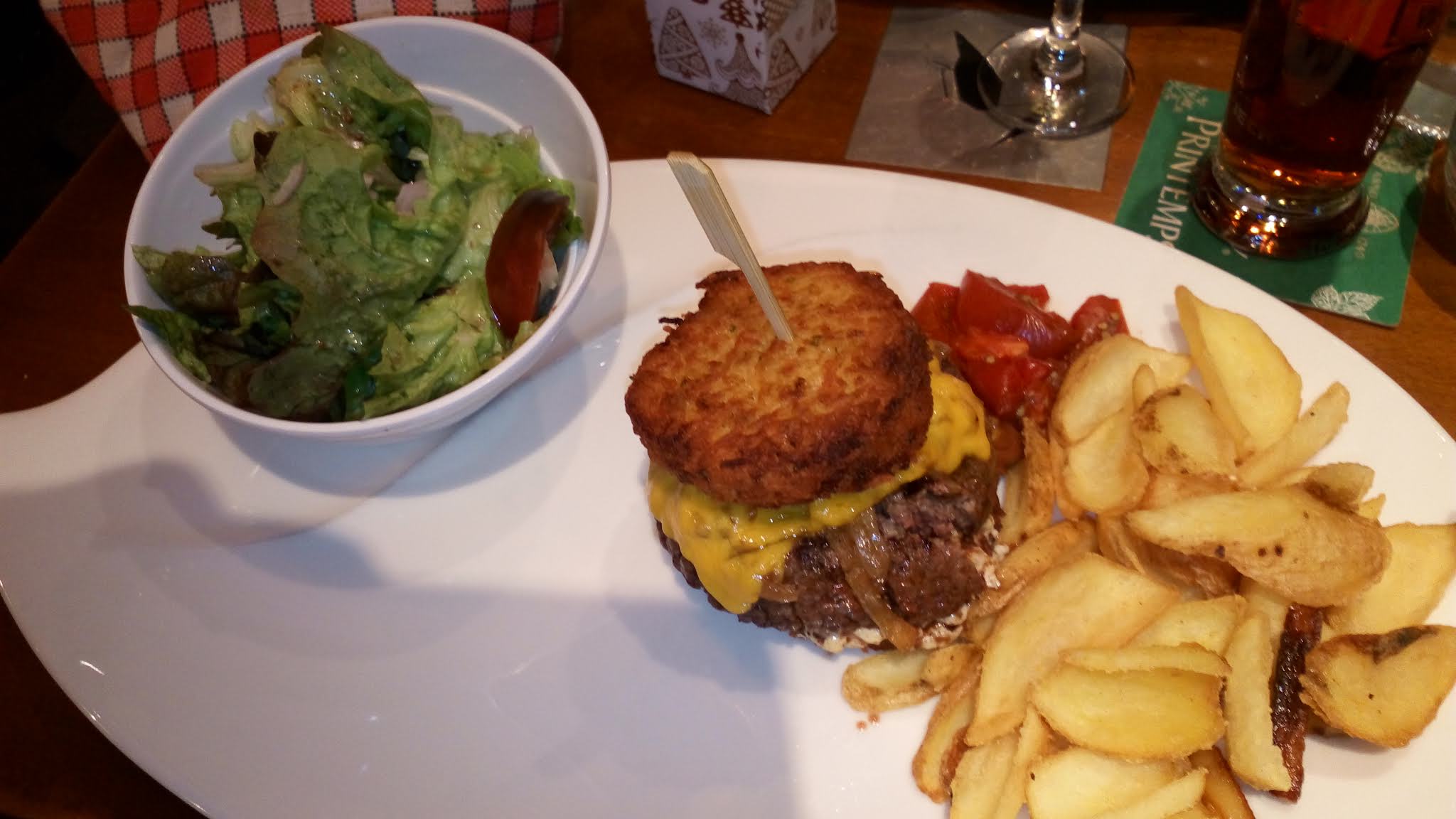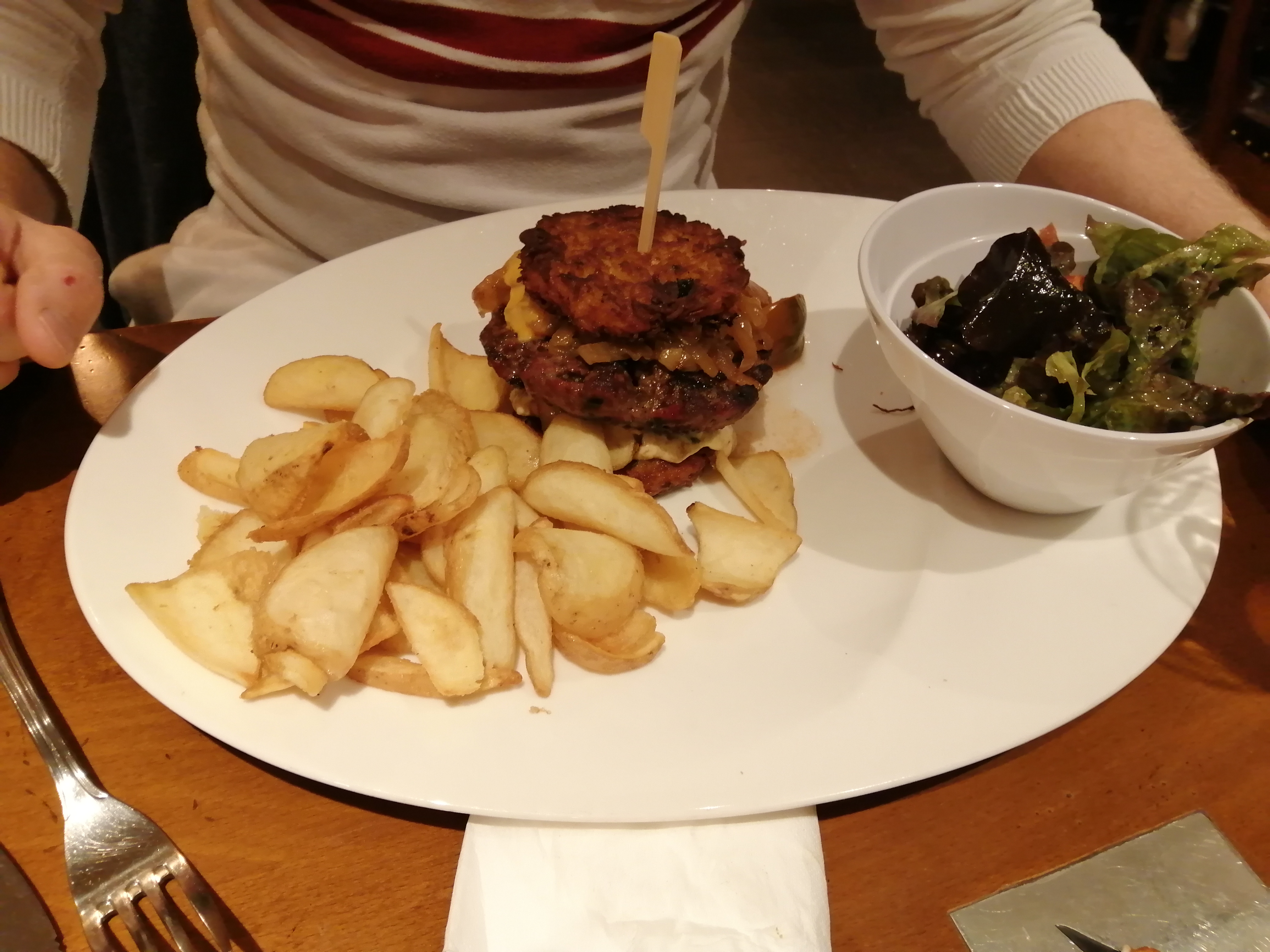 Réservation pour 20h30, nous avons notre table 20 min après l'heure, alors que nous avions de l'avance. Ceci s'excuse néanmoins avec la date de venue qui engendre un rush important le soir. Nous étions 2, et nous avons été servis avec au minimum 5-10 min d'intervalle. Je demande le burger, fait de galette de pommes de terre, l'une d'elle est cramée (au moins elle croustille). La deuxième (celle du dessous) est néanmoins très bonne. La viande était niquel. Les pommes frites également. Le restaurant a proposé une petite ambiance sympathique avec une chanteuse.