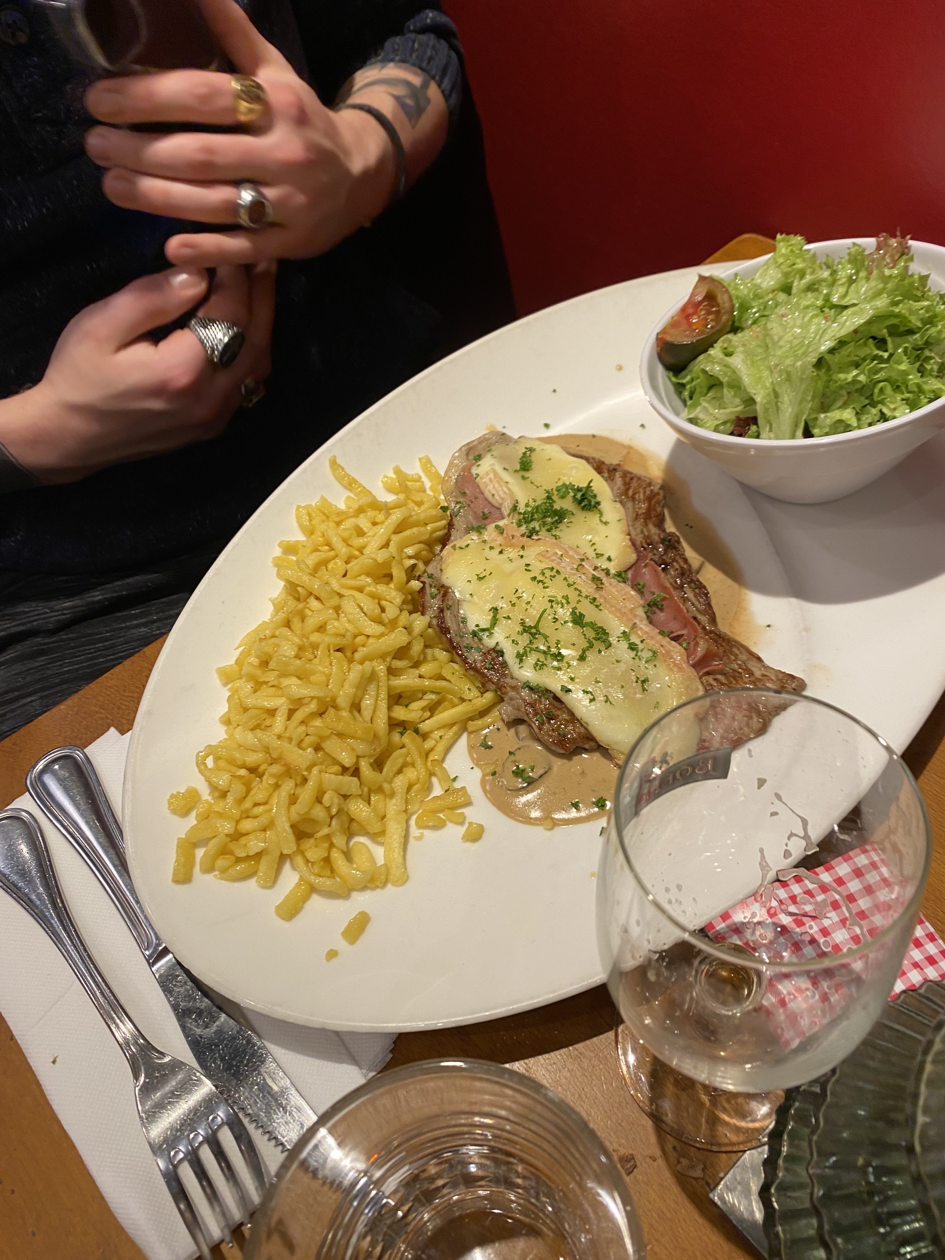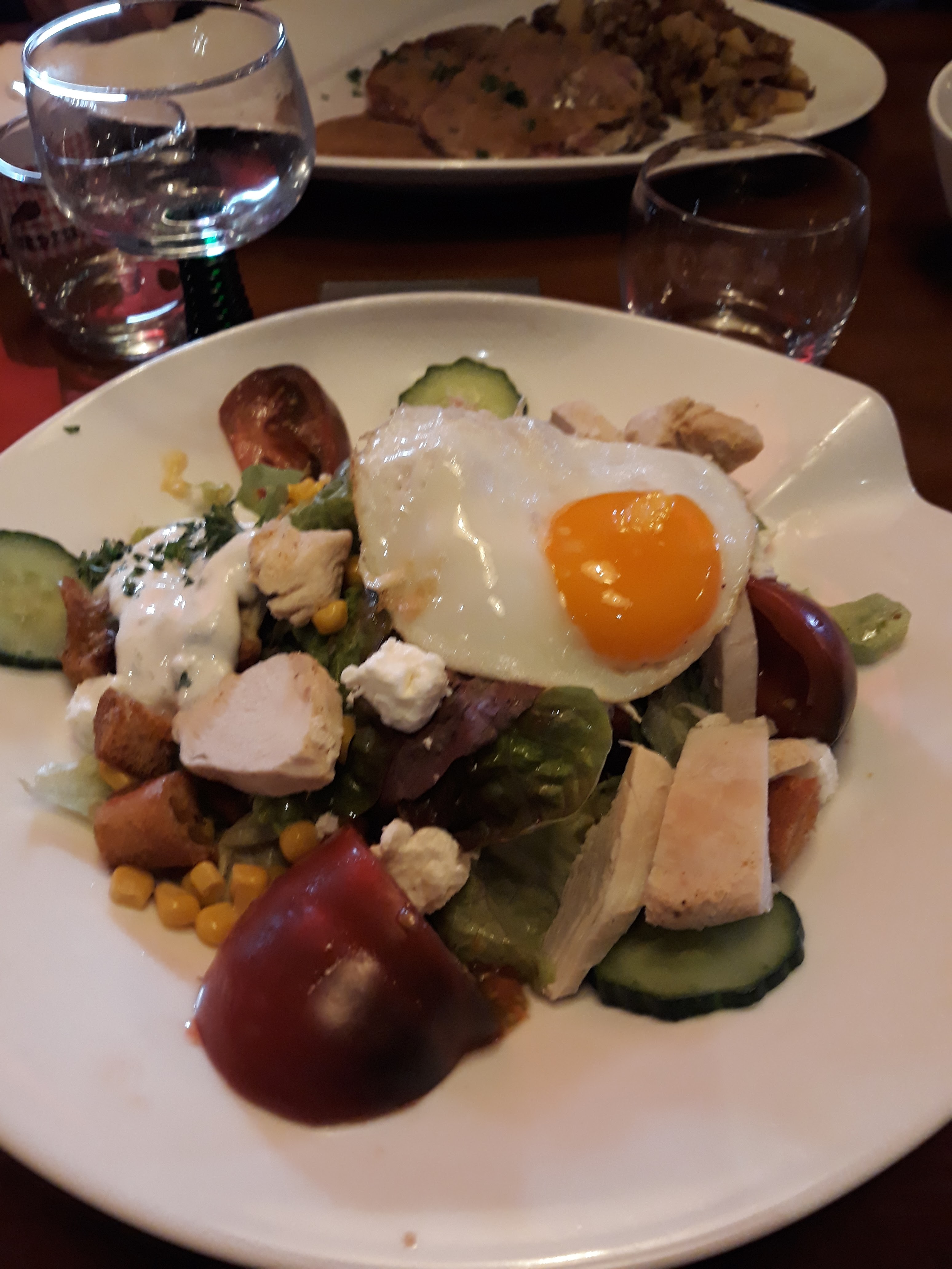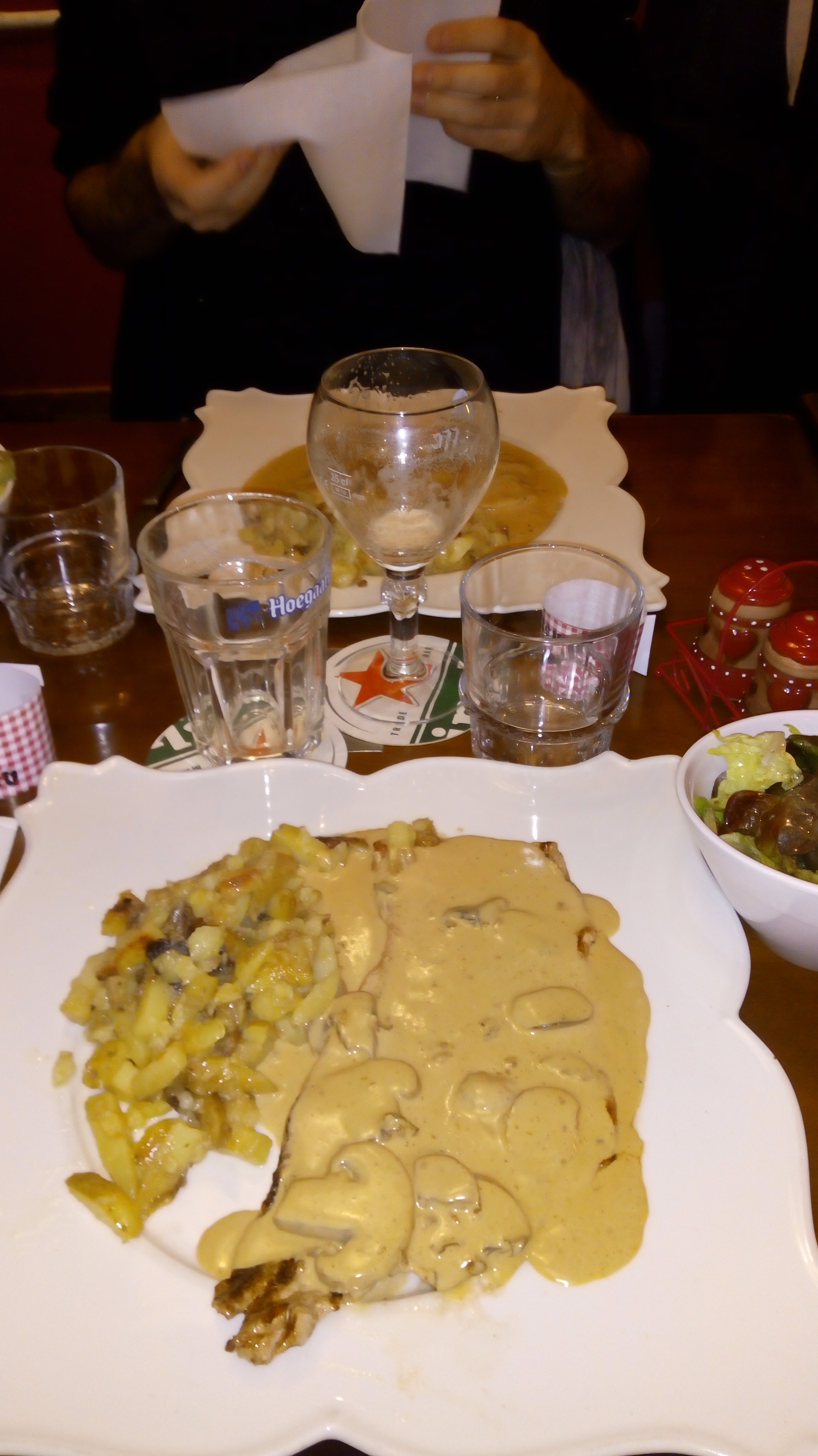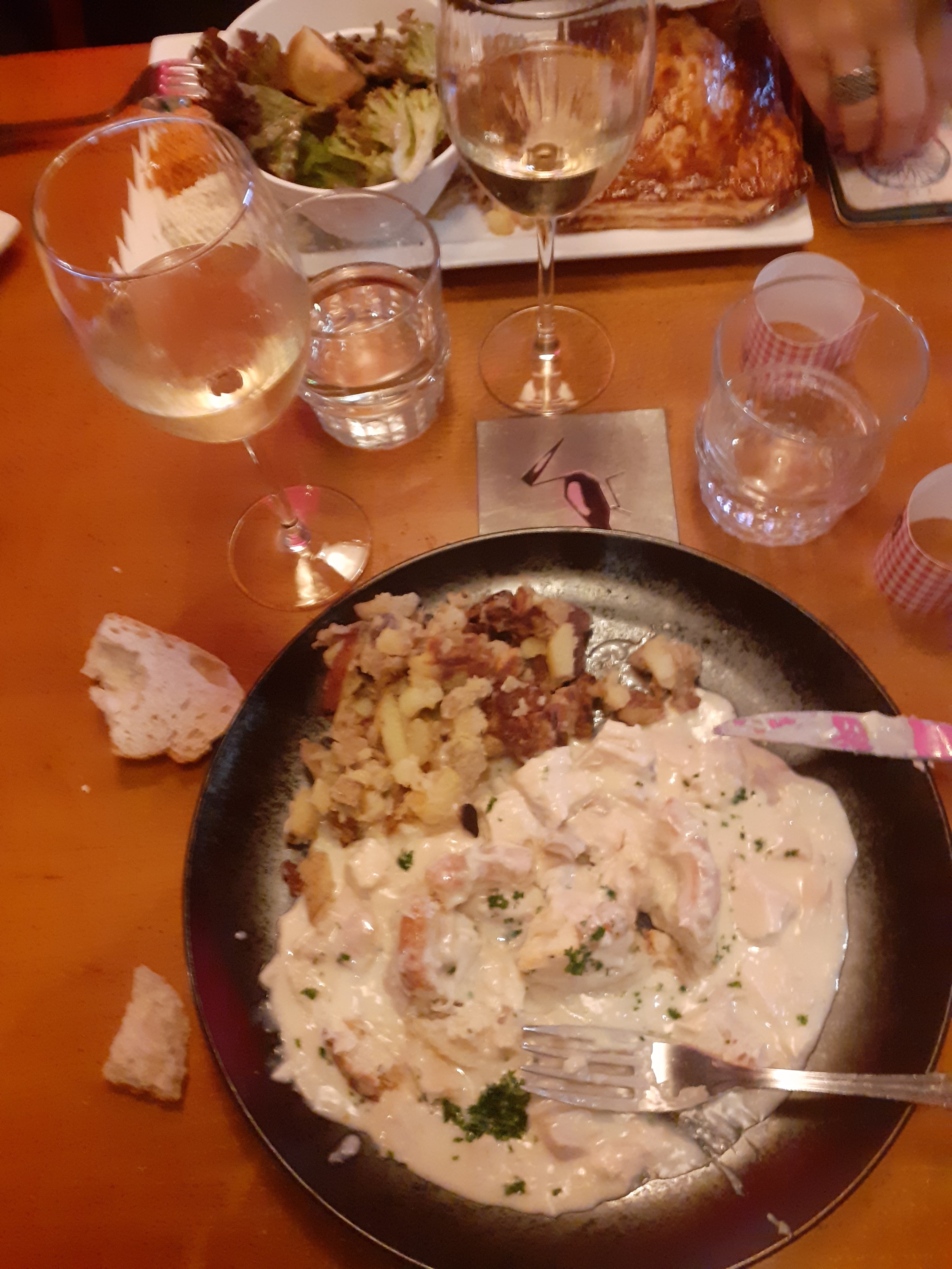 Très bon repas moi c’est rognons patates rôties ,comme d’habitude,j’adore ça ,j’ai eu l’occasion d’en manger dans des restaurants différents,mais jamais aussi bons,,juste pour information,en apéro j’avais demandé un verre de black papillon ,apparemment inconnu,,donc c’est un vin blanc alsacien wolfberger qui tient son nom rappelant la coiffe alsacienne,papillon noir voilà l’explication ,histoire à raconter aux clients
