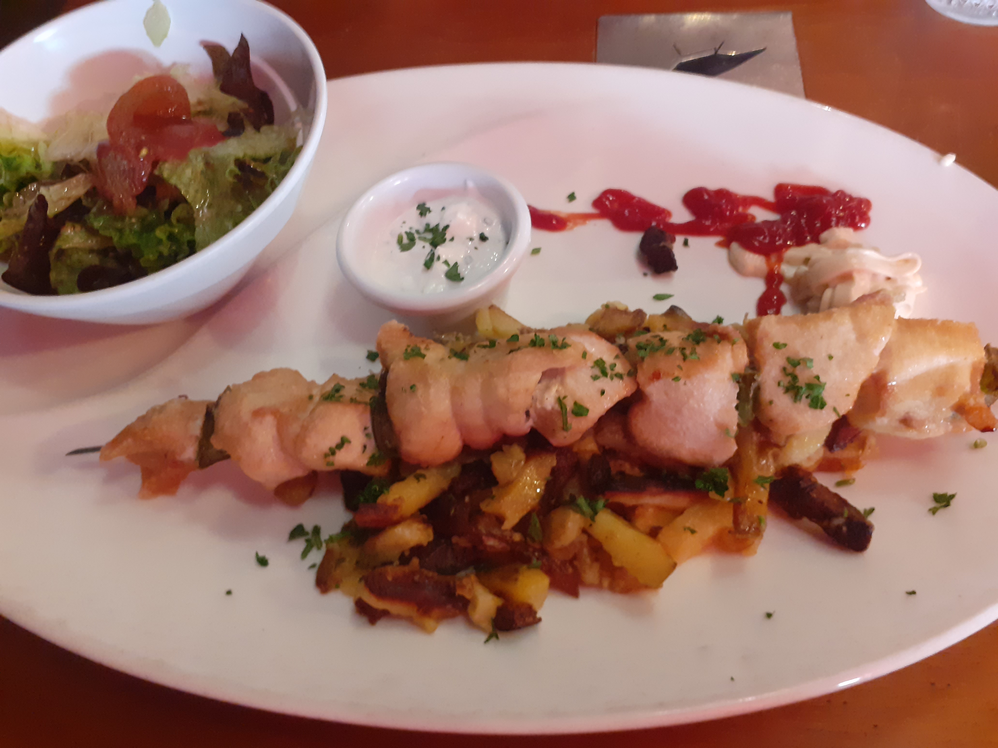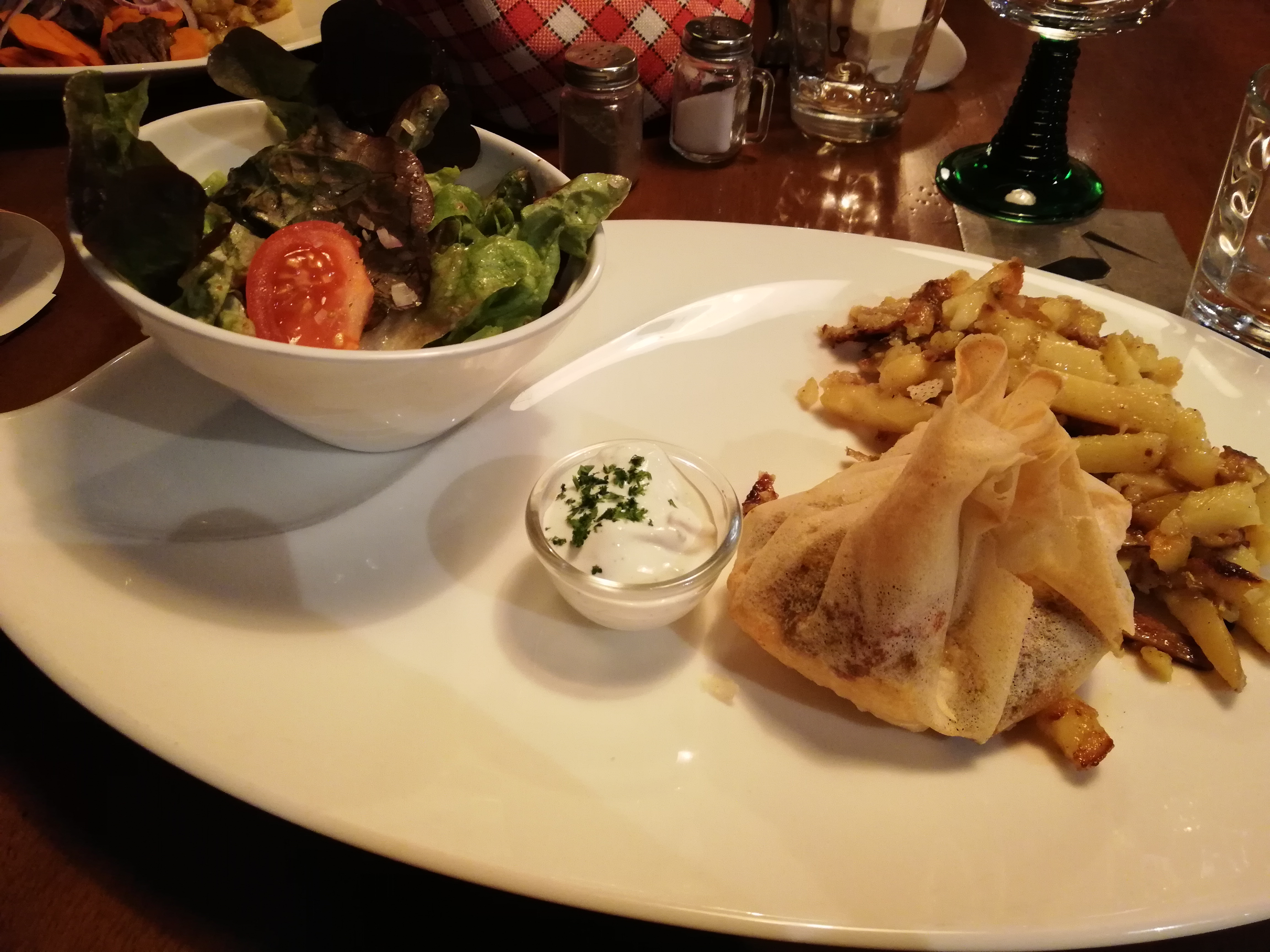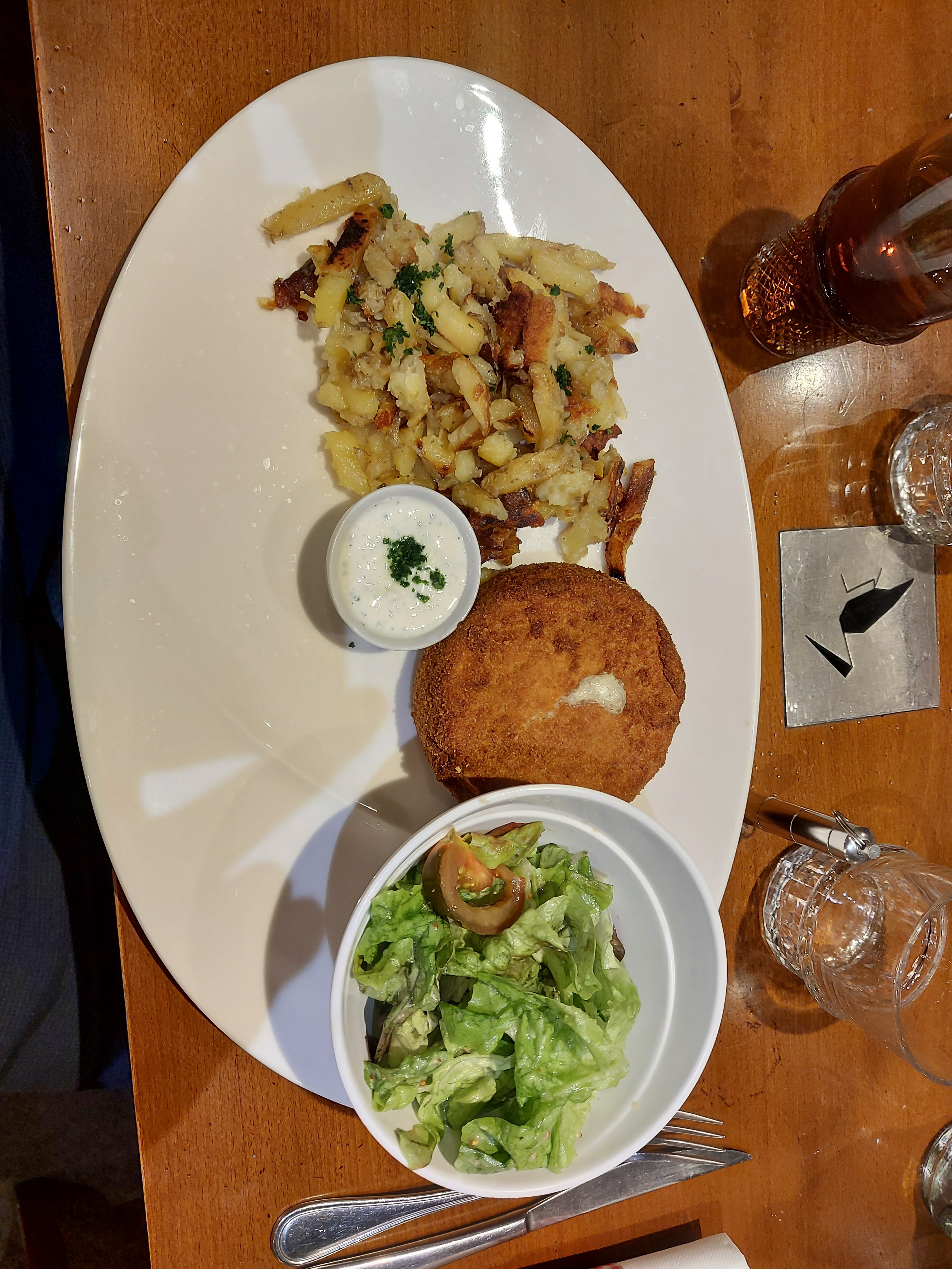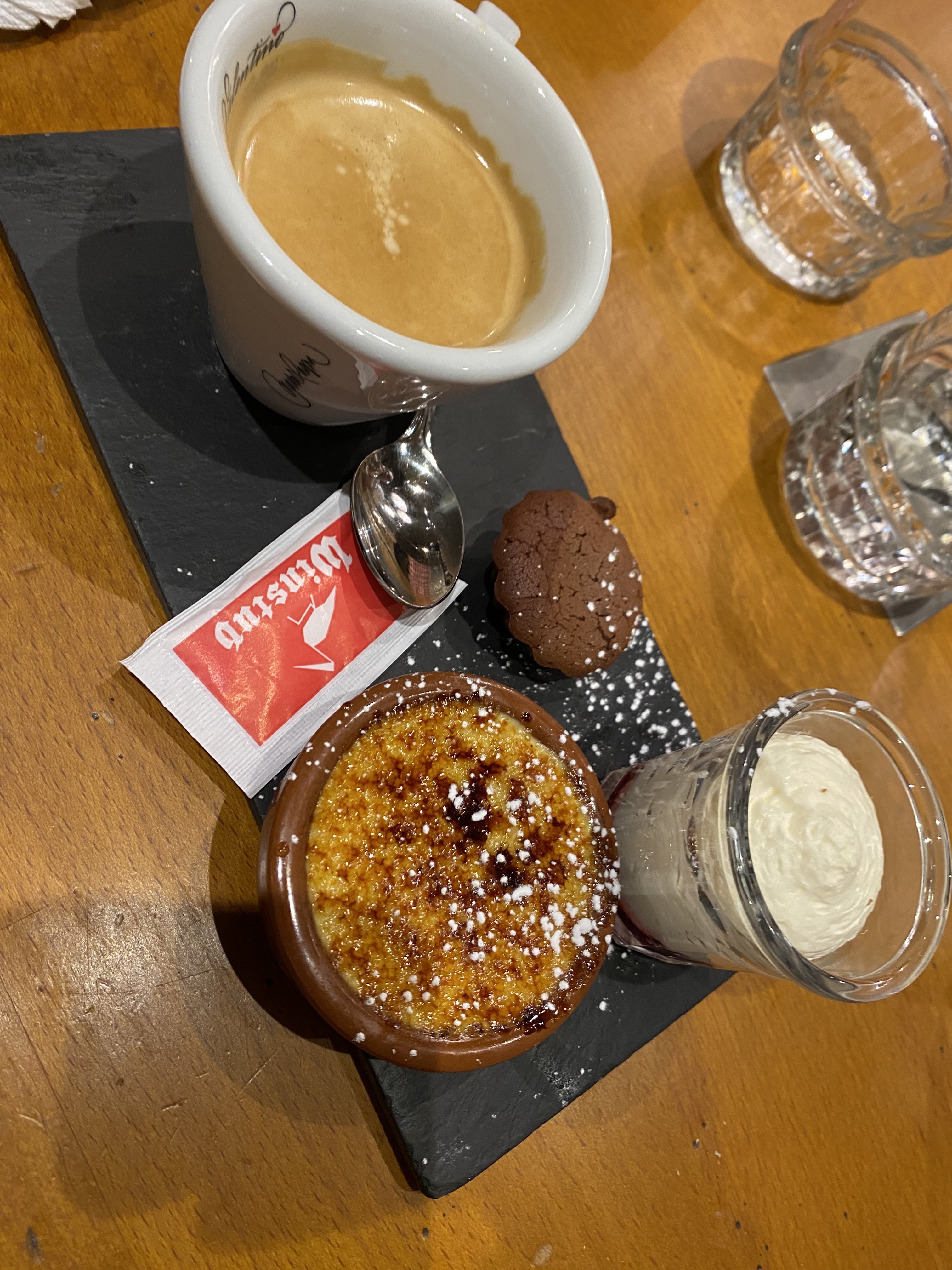 Très bon repas moi c’est rognons patates rôties ,comme d’habitude,j’adore ça ,j’ai eu l’occasion d’en manger dans des restaurants différents,mais jamais aussi bons,,juste pour information,en apéro j’avais demandé un verre de black papillon ,apparemment inconnu,,donc c’est un vin blanc alsacien wolfberger qui tient son nom rappelant la coiffe alsacienne,papillon noir voilà l’explication ,histoire à raconter aux clients