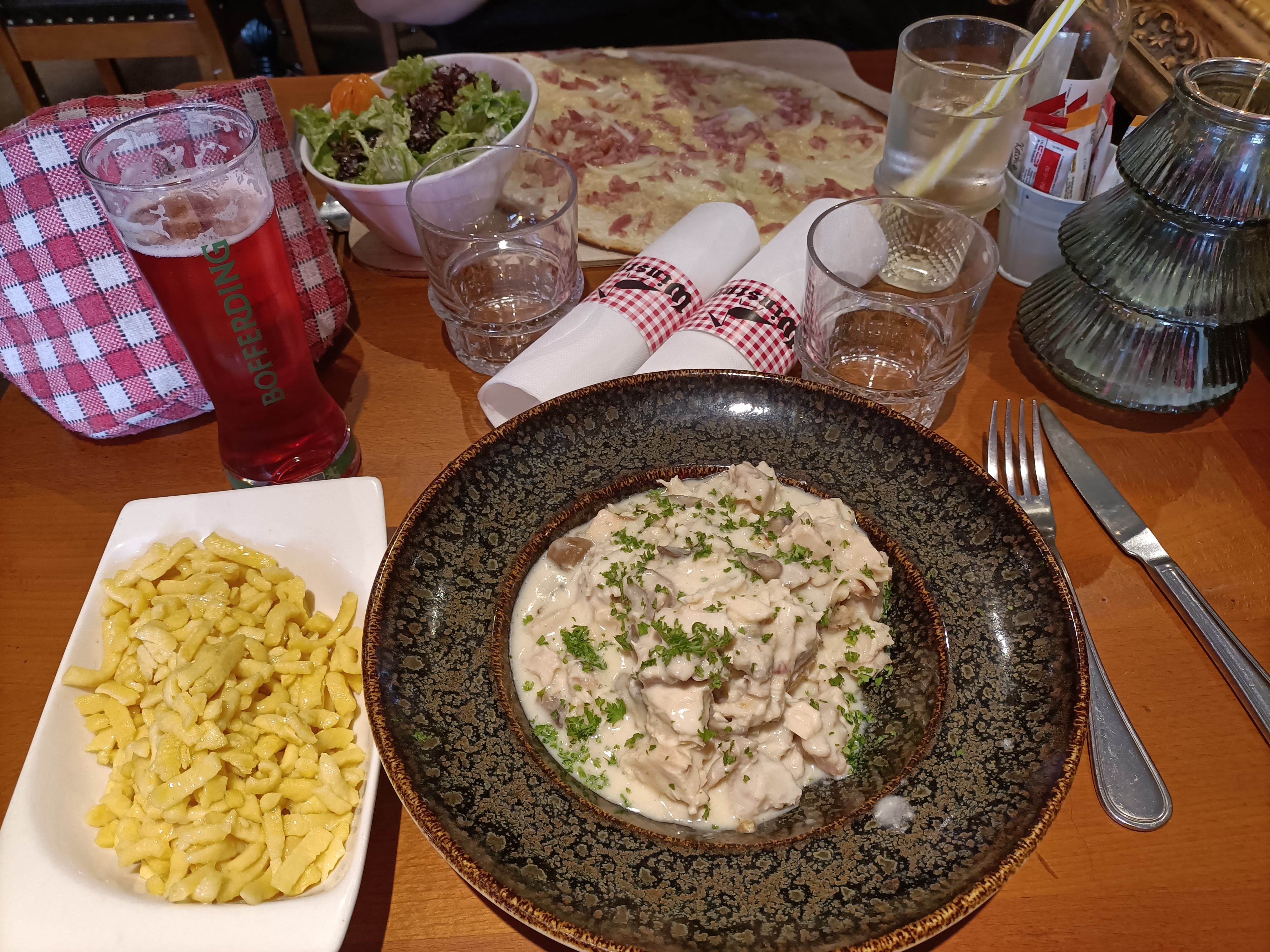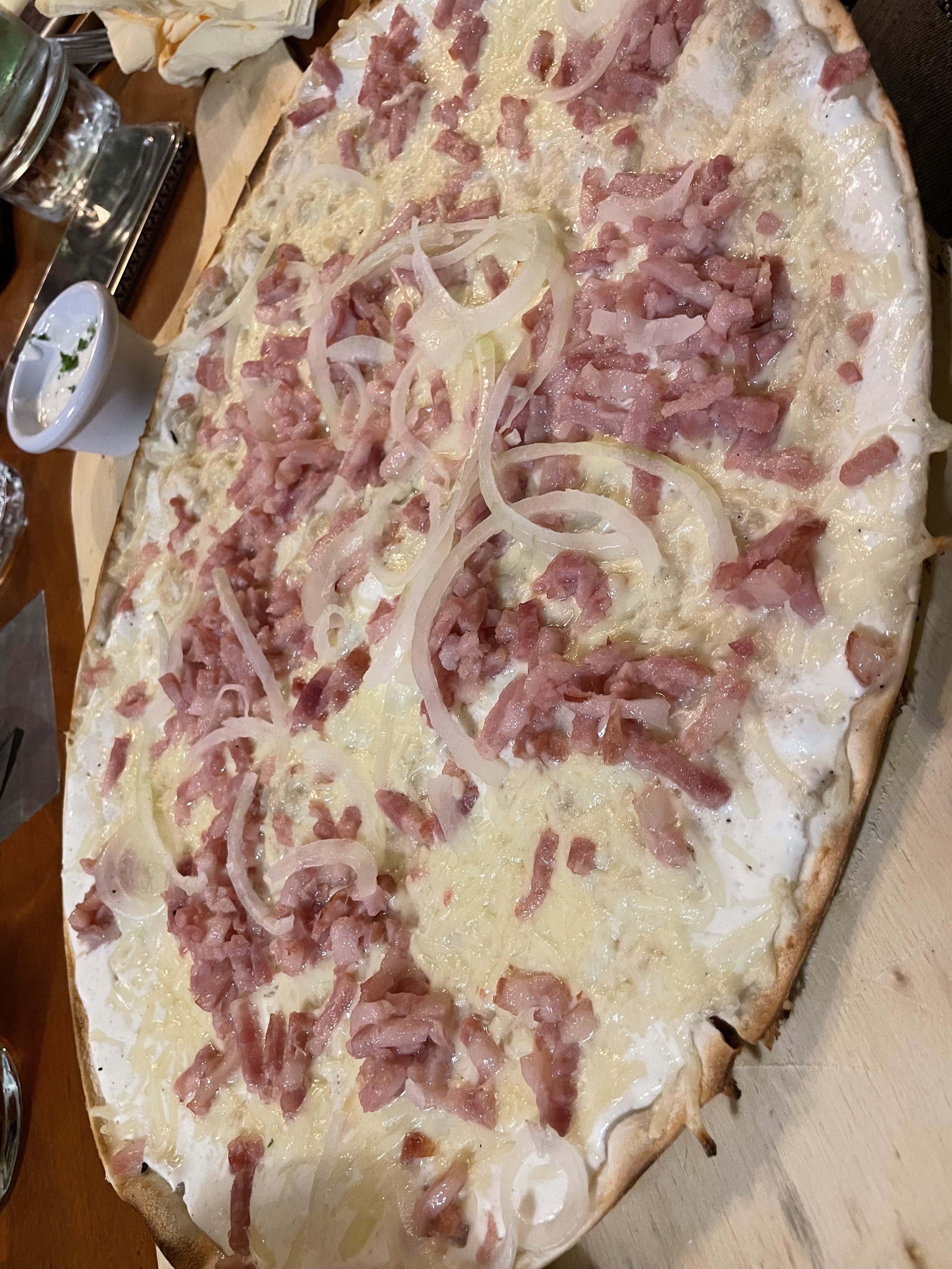 Une étoile pour la tarte flambée sinon l’escalope de veau, pomme de terre l’huile canard, le steak fade, pas de goût, biberkäs horrible. Les plats chauds pré préparé et mis dans le four??? Toutes les viandes dures à mastiquer. Extrêmement déçu, nous avons (5personnes) fait 1 hr de route pour ce restau qu’on avait bien mangé avant la pandémie. Dommage