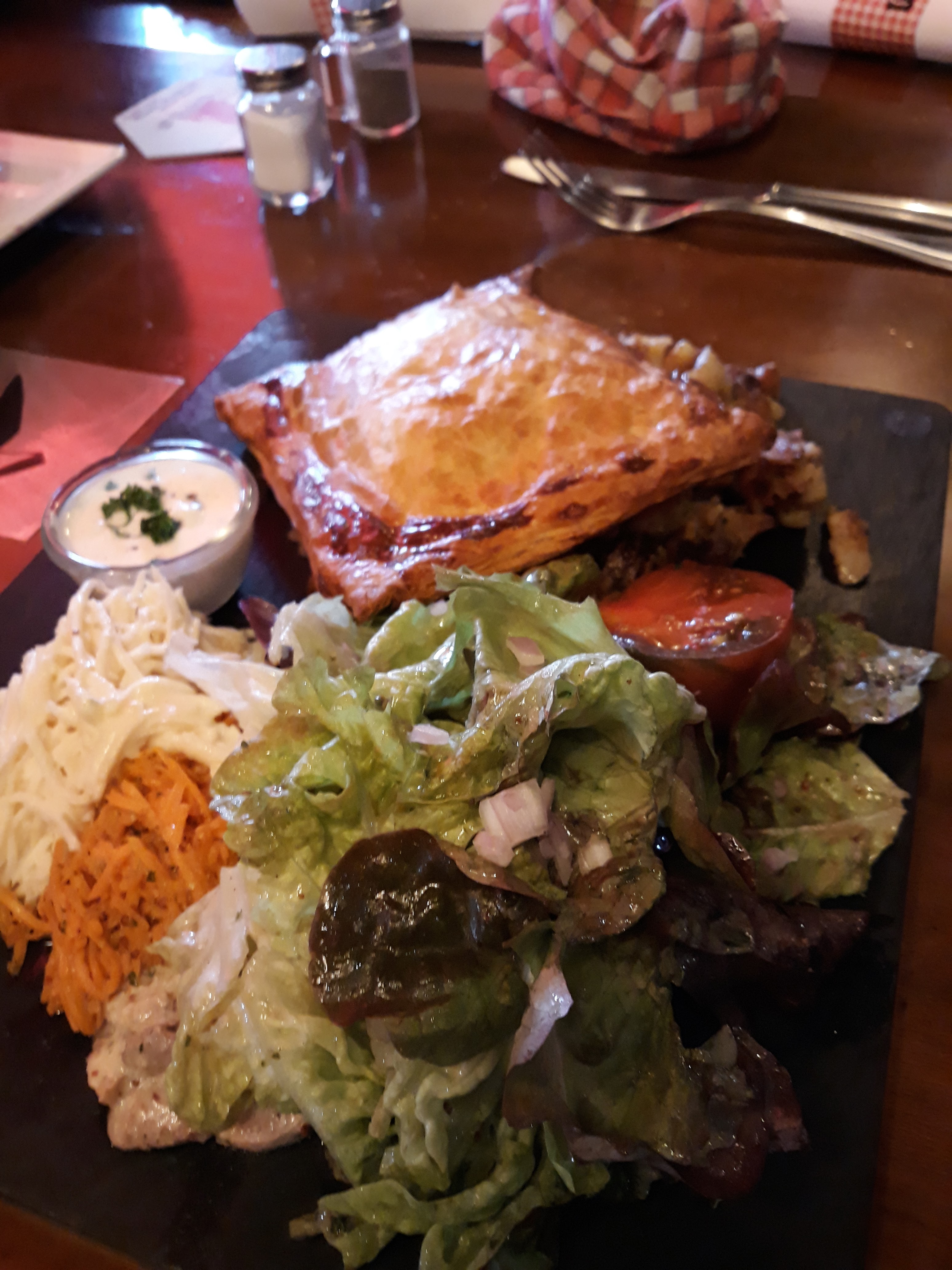 Très bon accueil commander un pâte en croûte. La croûte même pas cuite et la viande pas trop non plus. J ai réclamé la serveuse ma répondu que chez eux il faisait comme ça. En conpensation on m'a offert le café je n y retournerai plus. En plus cher pour se que nous avions prit
