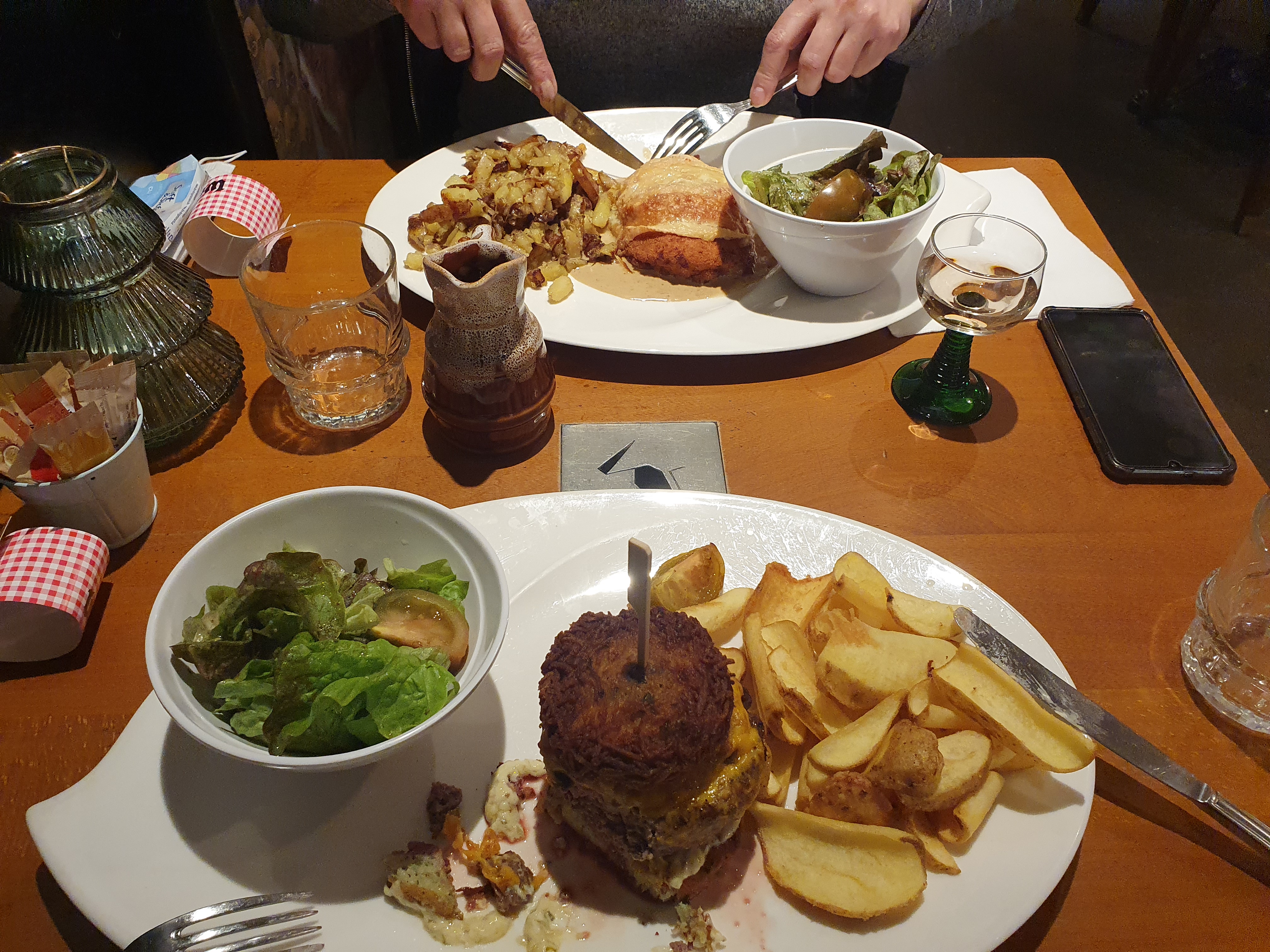réservation L’après-midi à 16h pour 20h30 2 personnes sans problème. Après un apéritif envoyer champagne et picon bière citron. Nous avons commander un Winstub Burger saignant entre deux galettes de pomme de terre, cheddar, oignons caramélisé , frite maison, salade et une joue de bœuf, oignons rouge, pomme de terre rôtie, salade..Ils aura fallu attendre seulement quinze minutes pour nous servir. Résultat le steak haché de 250gr saignant à point avec le cheddar, les oignons et la sauce maison une bouchée, les galettes croustillante à l'extérieur et moelleuse à l'intérieur, les frites maison croquante et non grasse, enfin une salade qui trempe pas dans la vinaigrette. Quand à la joue tendre fondante et pas de gras avec les oignons rouge cela passe tout seul, les pommes de terre rôtie bonne mais dommage trop servi avec l'huile de friture. Enfin mon péché mignon une dame blanche, pas servi avec le chocolat fondu et un peu trop de chantilly à mon gout. Pour cela que je ne peux mettre l'excellence. Ambiance feutré mais si trop de monde cela peux devenir exigu. Personnel souriant et sympathique, pour ma part j'ai aimé.
