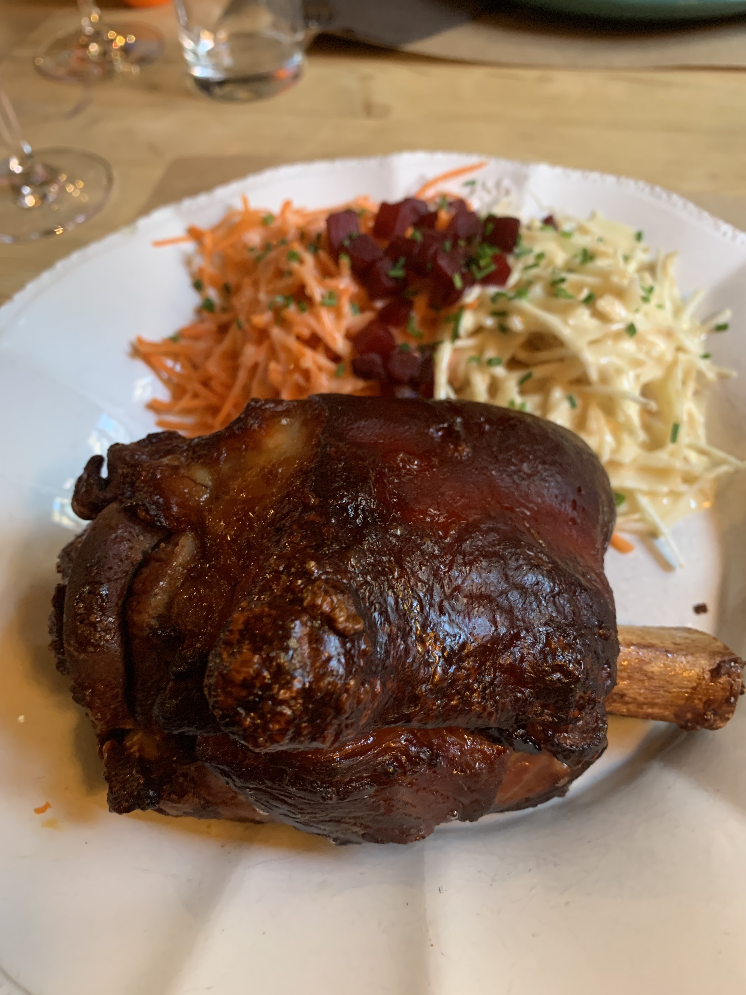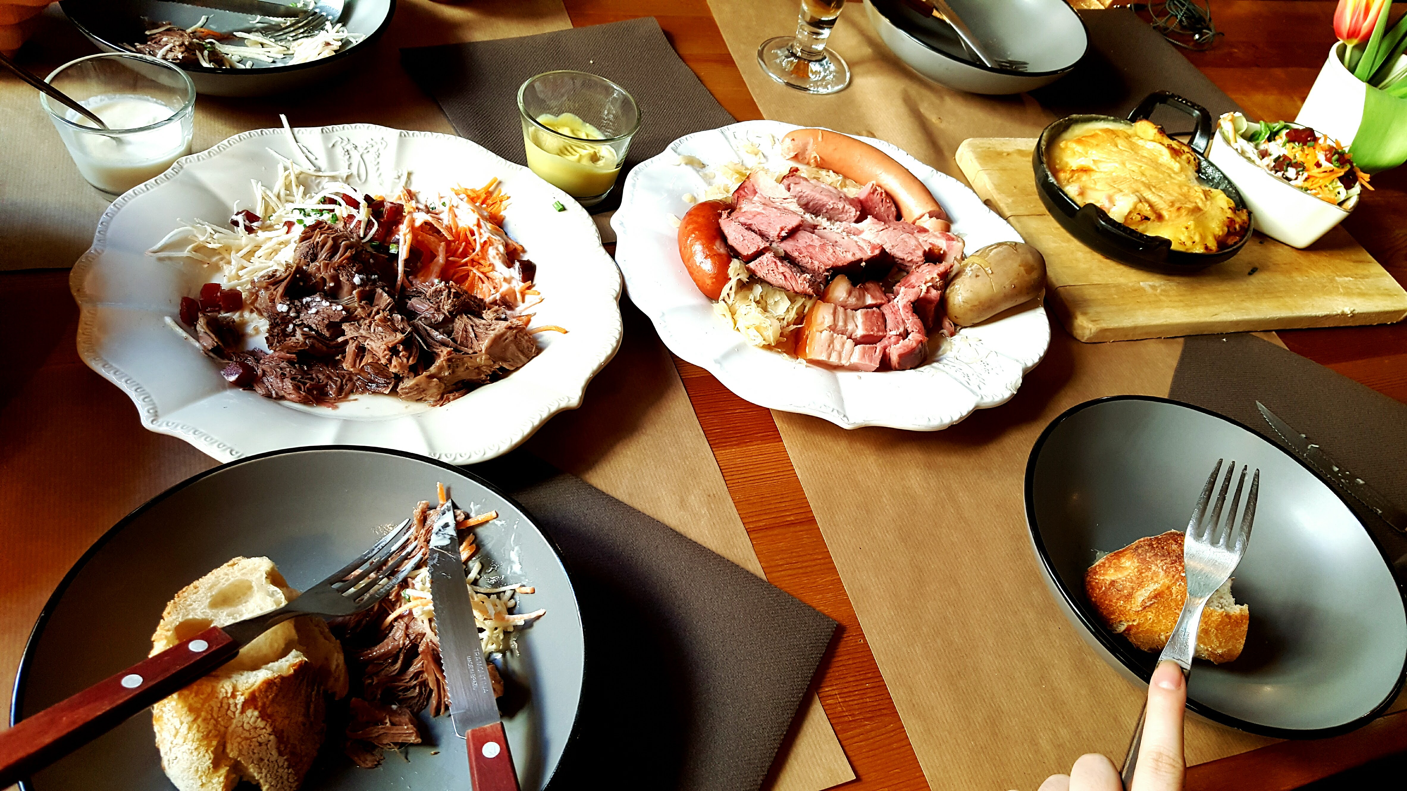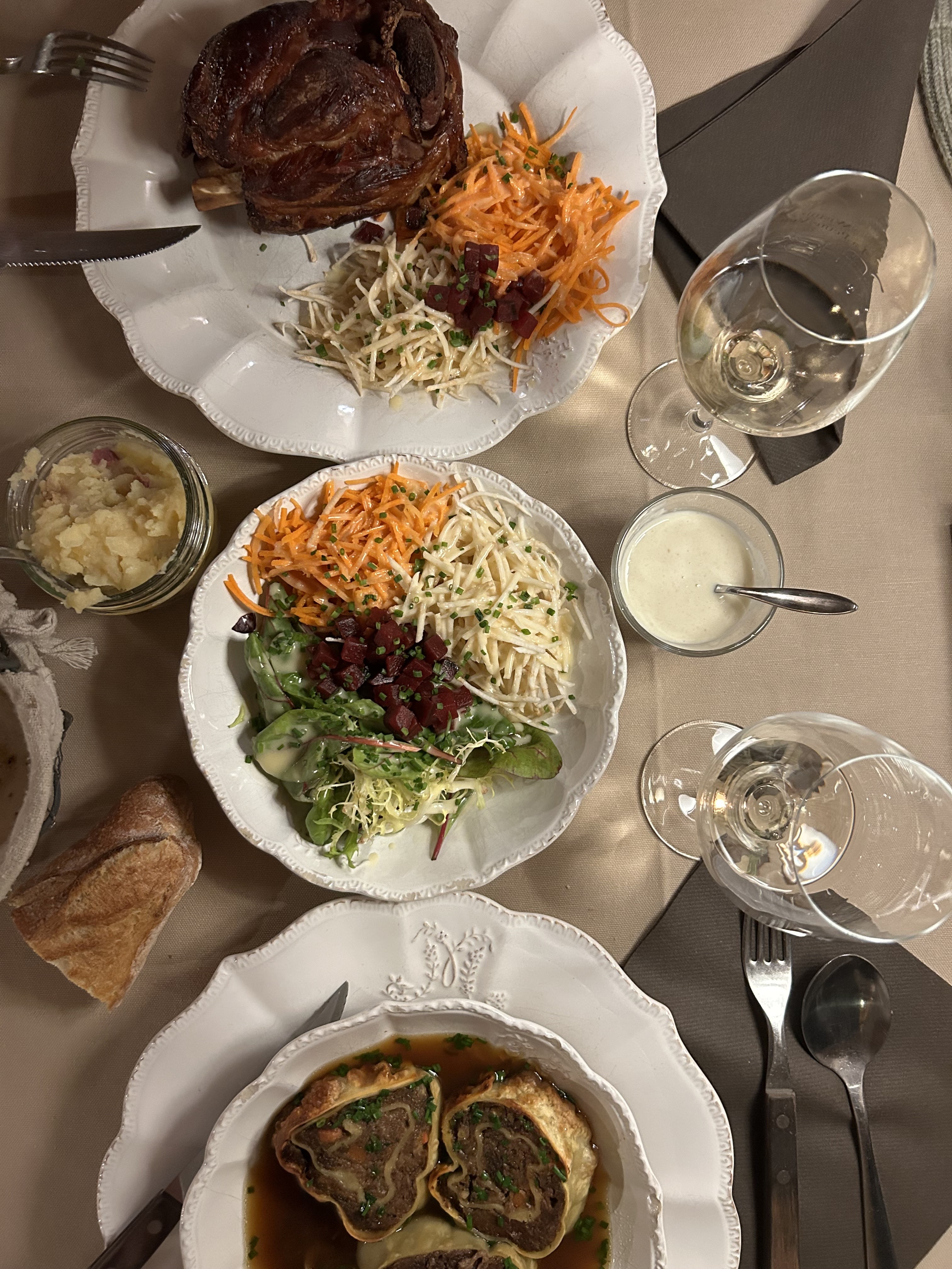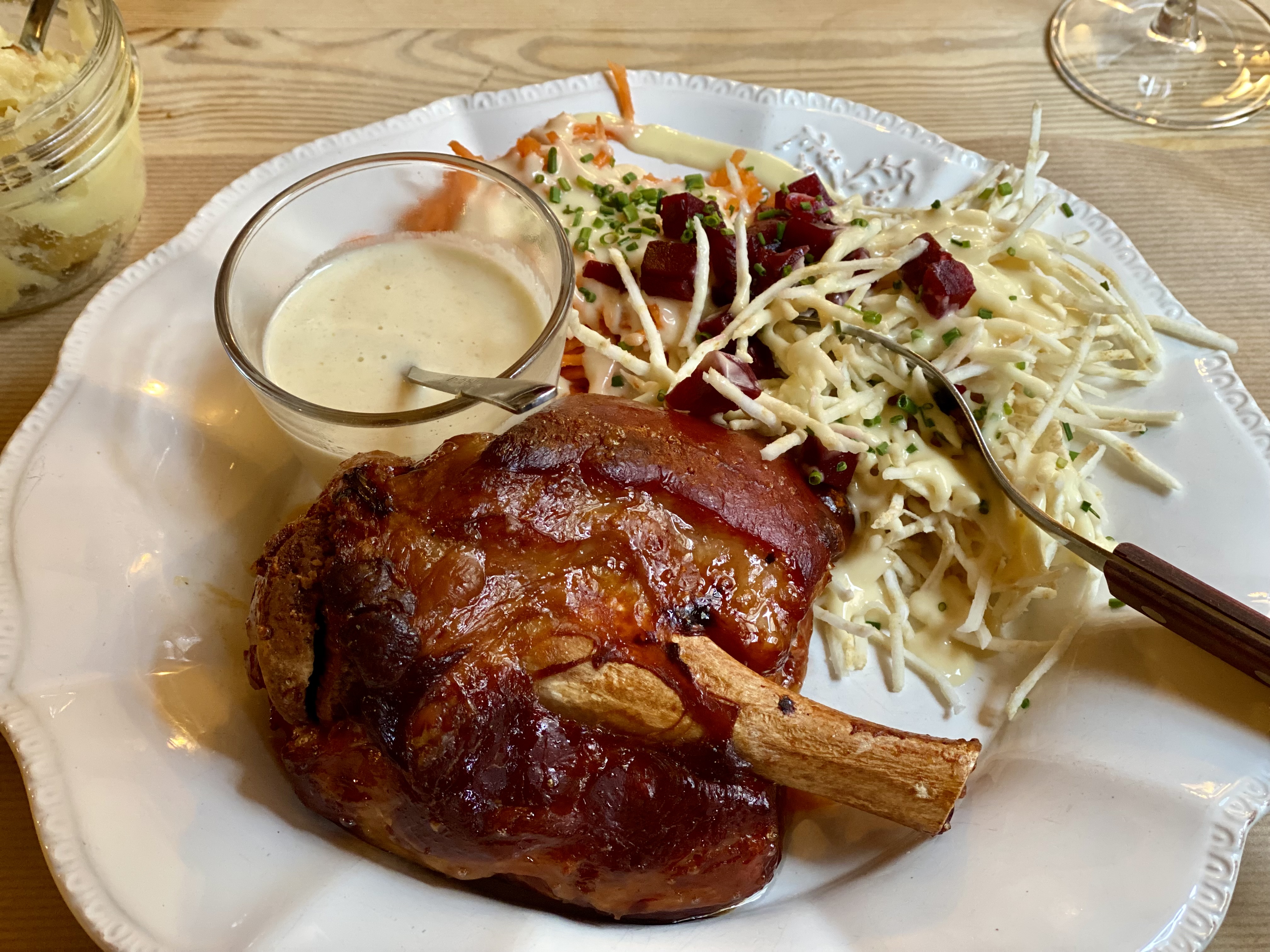 Personnel souriant et sympathique, le jambonneau braisé, pommes de terre, céleri, carottes sauce raifort très bon, nous avons bien mangé.