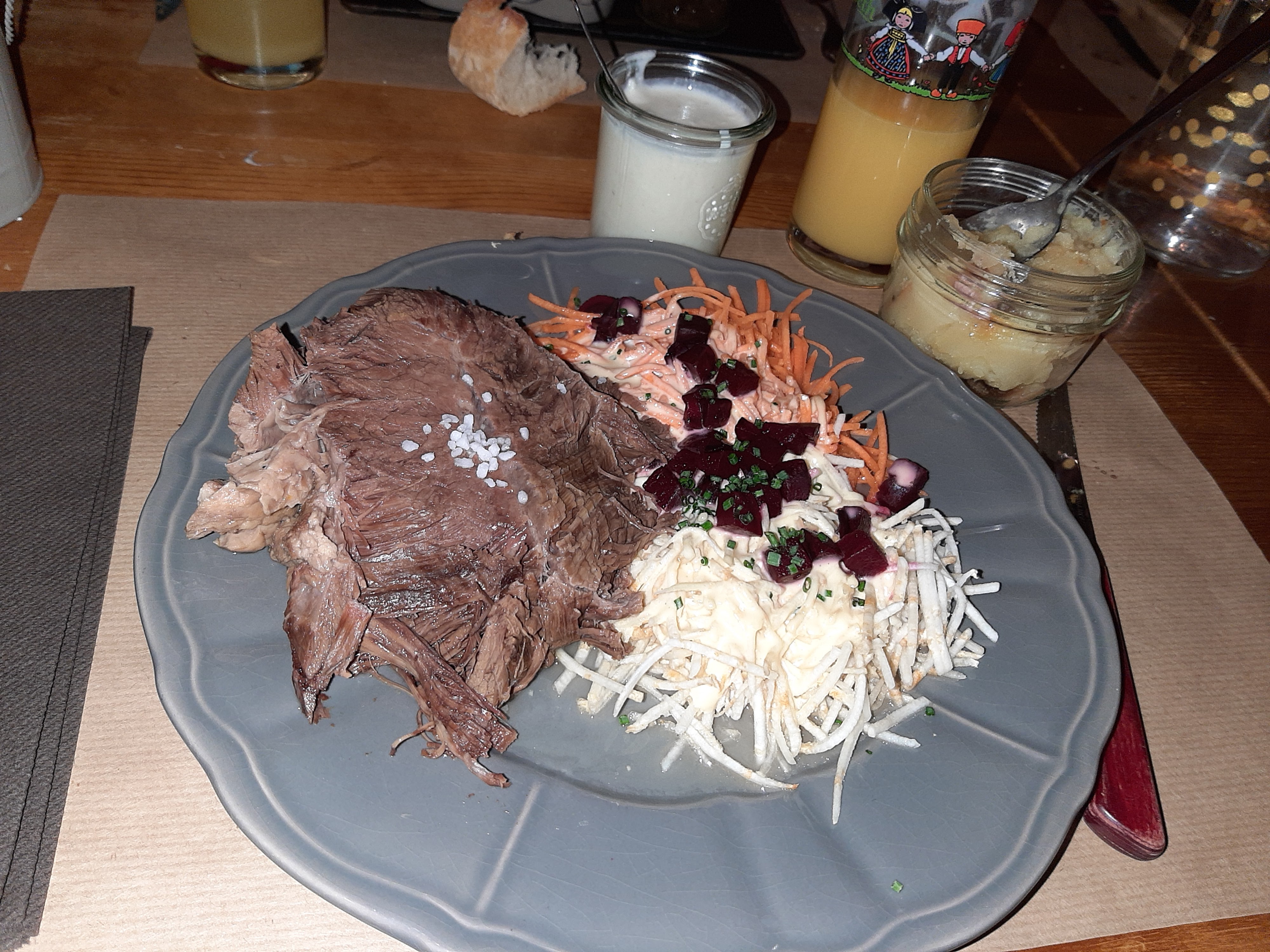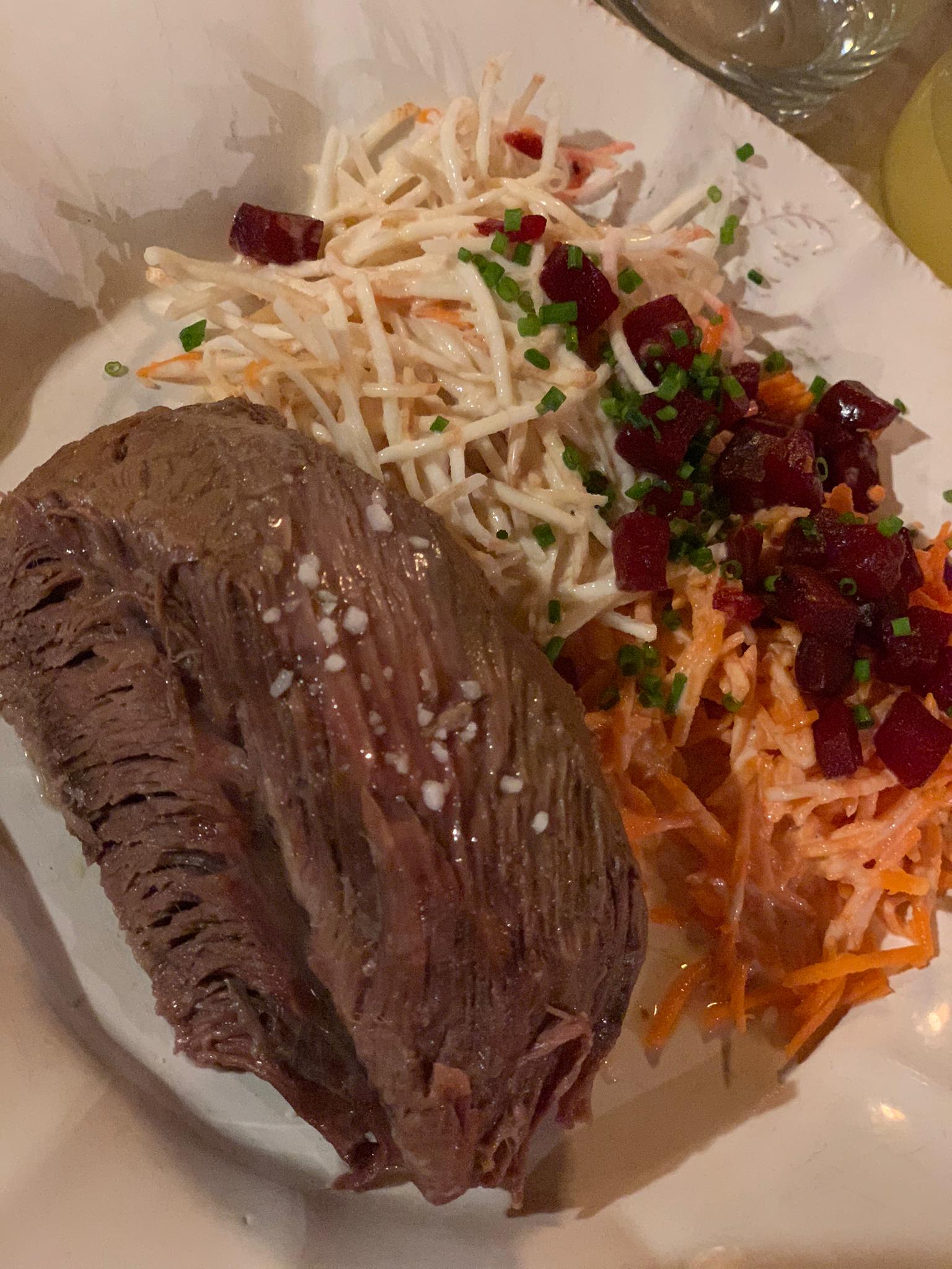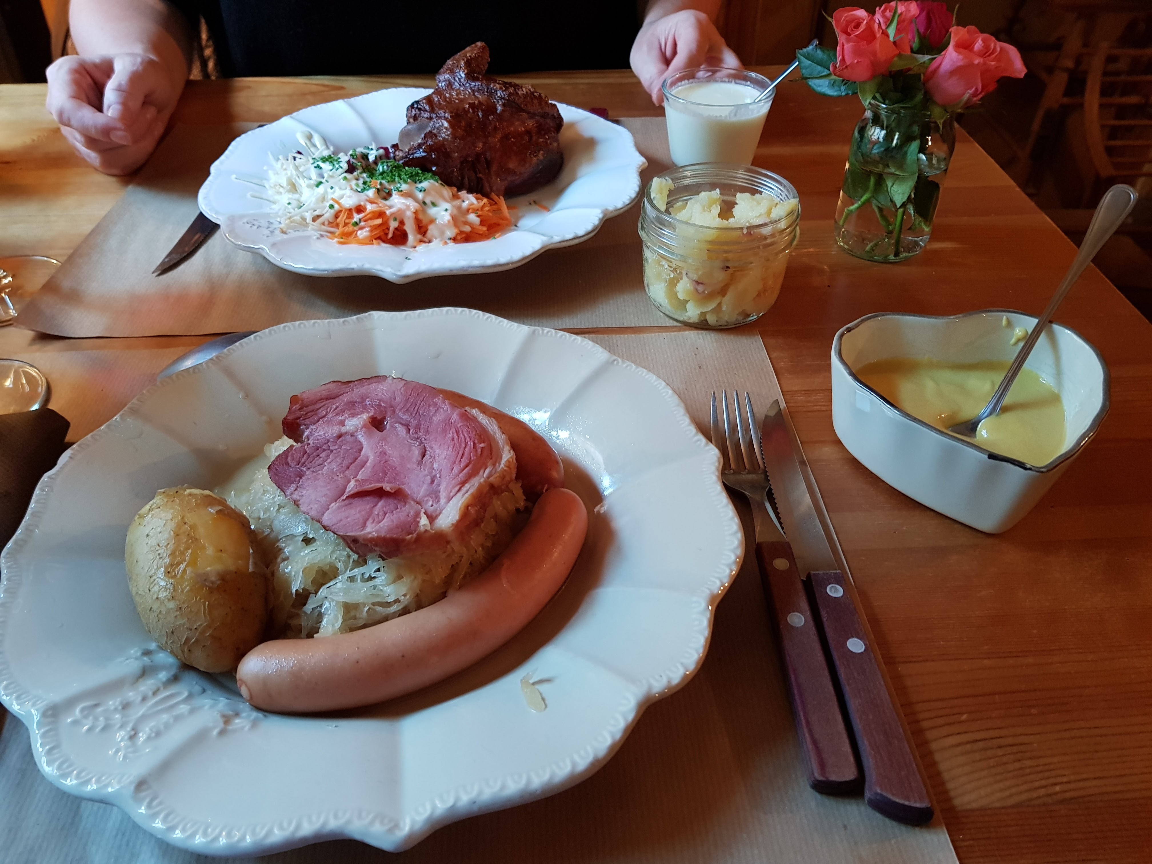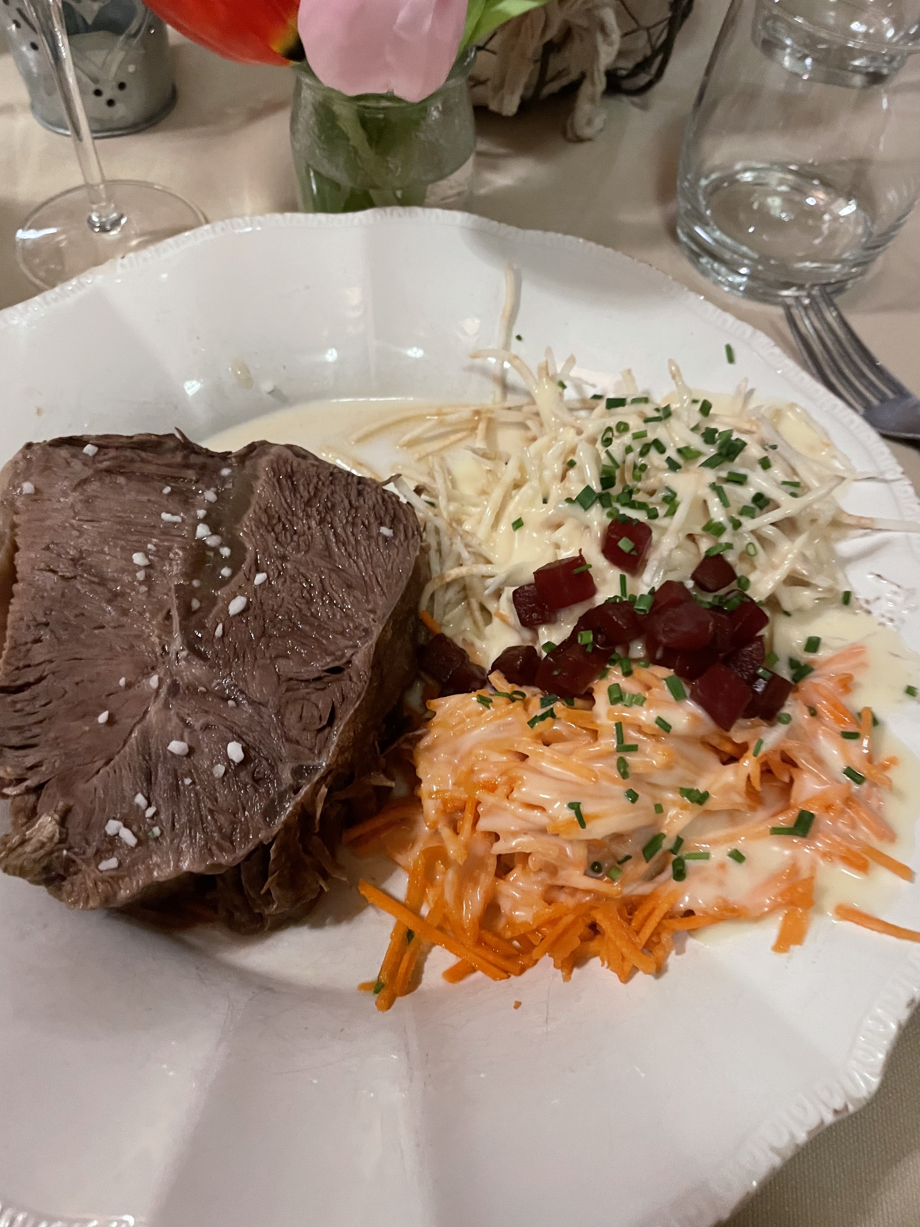 Personnel souriant et sympathique, le jambonneau braisé, pommes de terre, céleri, carottes sauce raifort très bon, nous avons bien mangé.