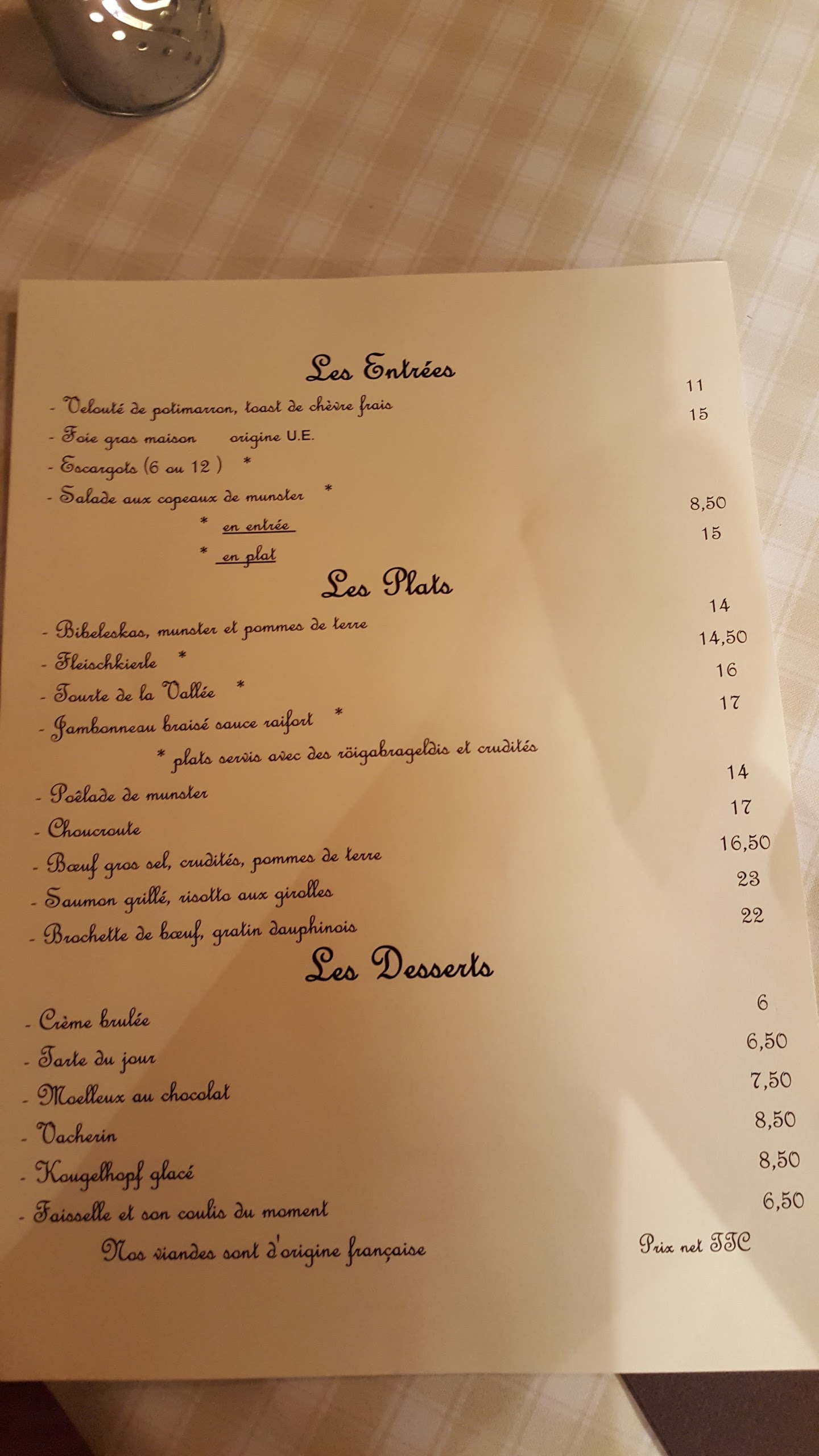 Très bonne adresse dans un joli cadre, une terrasse aurait été un plus. Le personnel était souriant et agréable, les plats étaient très bons,pour ma part une poelade au munster servie bien chaude dans son poêlon qui maintient la chaleur très longtemps. Un ami avait choisi un jambonneau et dit n avoir jamais mangé un aussi bon jambonneau avec une cuisson parfaite, ce qui est très rare selon lui. En dessert la tarte du jour à la rhubarbe meringuée, peut être trop de meringues et pas assez de rhubarbe dommage. Le seul bémol est qu il faut réserver et qu il n'y a que 2 horaires proposées 19h et 21h, ça peut faire un peu trop tôt ou trop tard et au téléphone la personne qui a réservé notre table a bien fait comprendre qu il fallait arriver à l heure sinon la table serait donnée à quelqu un d autre. Nous avions réservés pour 19h, tout est fait pour que le 1er service ait fini de manger pour 20h45, service rapide ce qui nous a permis quand même de manger tranquillement ! Adresse à recommander !