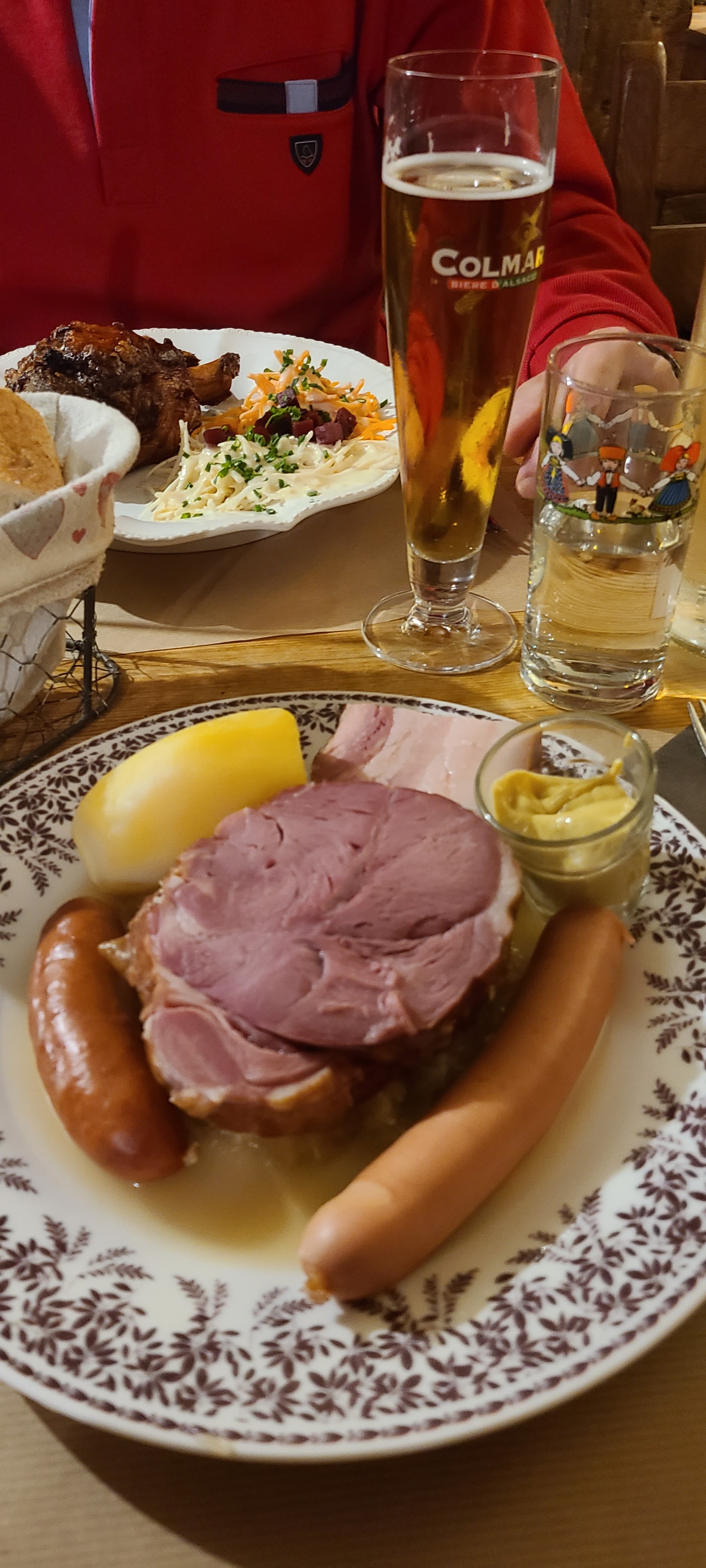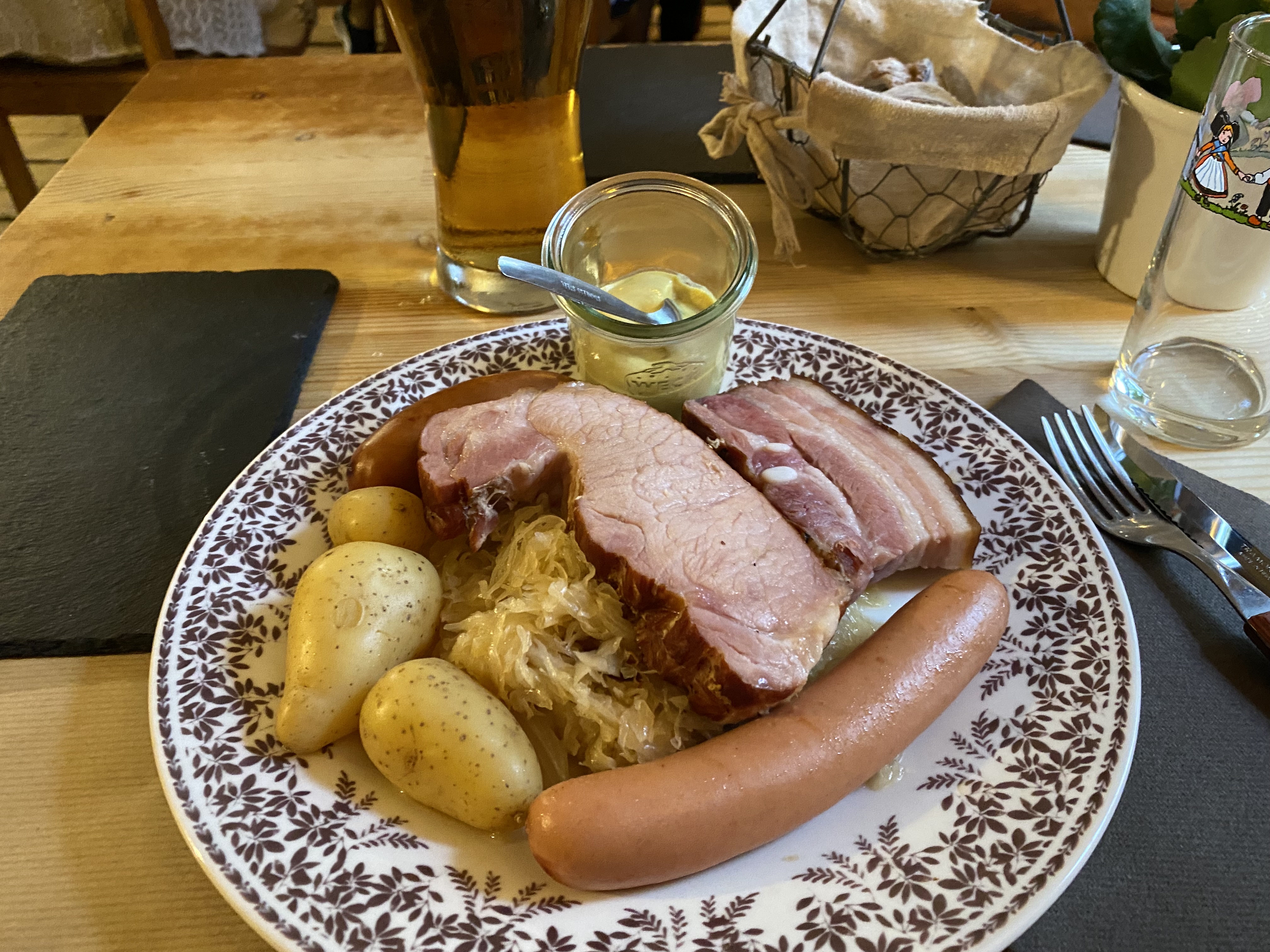 De belles spécialités alsaciennes, servies copieusement. Nous avons commandé un bibeleskas, avec munster et pommes de terre, et un jambonneau grillé. C'était excellent ! Restaurant climatisé bien agréable en cette fin juillet 2024.