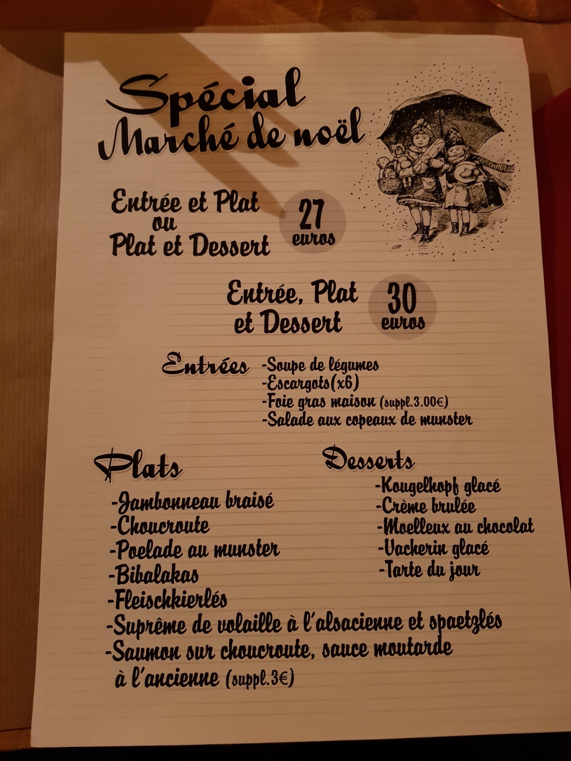 Restaurant avec des spécialités alsaciennes, nous nous sommes régalés. Nous y sommes allés à 18h20 pour le service de 19h sans avoir de réservation et nous n’avons pas été déçus. Les plats sont copieux et bons. Il est dommage cependant qu’il n’y ait pas de possibilité de prendre un plat « à la carte » pendant le marché de Noël car on doit prendre à minima entrée/plat ou plat/dessert pour un montant de 41€. Cela représente donc un certain budget.