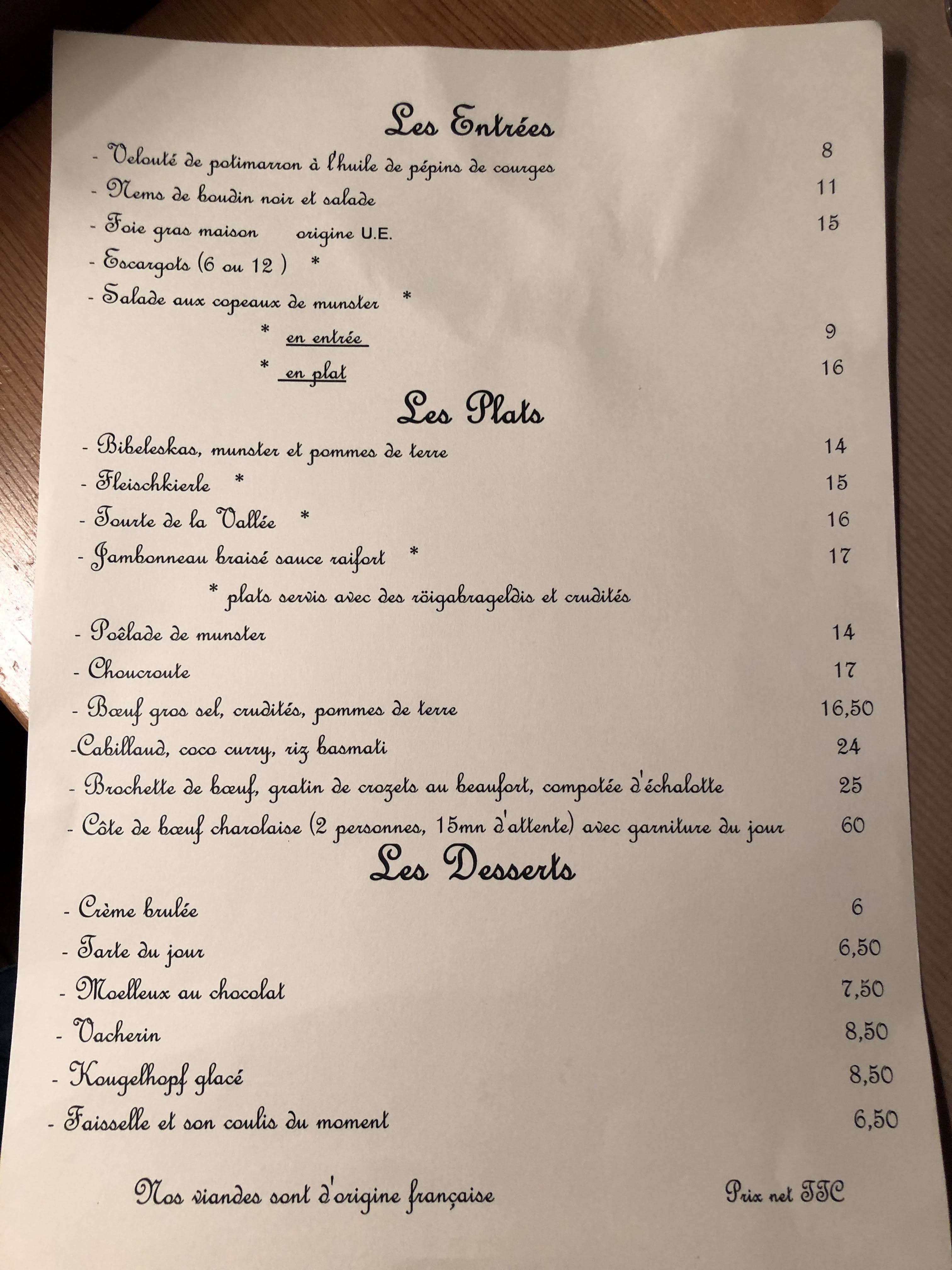 Excellente expérience. Le jeune personnel est à votre écoute pour une cuisine traditionnelle de qualité et à un prix raisonnable. La Tourte de la Vallée et le Jambonneau braisé étaient fameux. La cadre est très joli au rdc (nous n'avons pas vu le premier étage). Il y a deux services, l'un à 19h, l'autre à 21h, la réservation est fortement recommandée.
