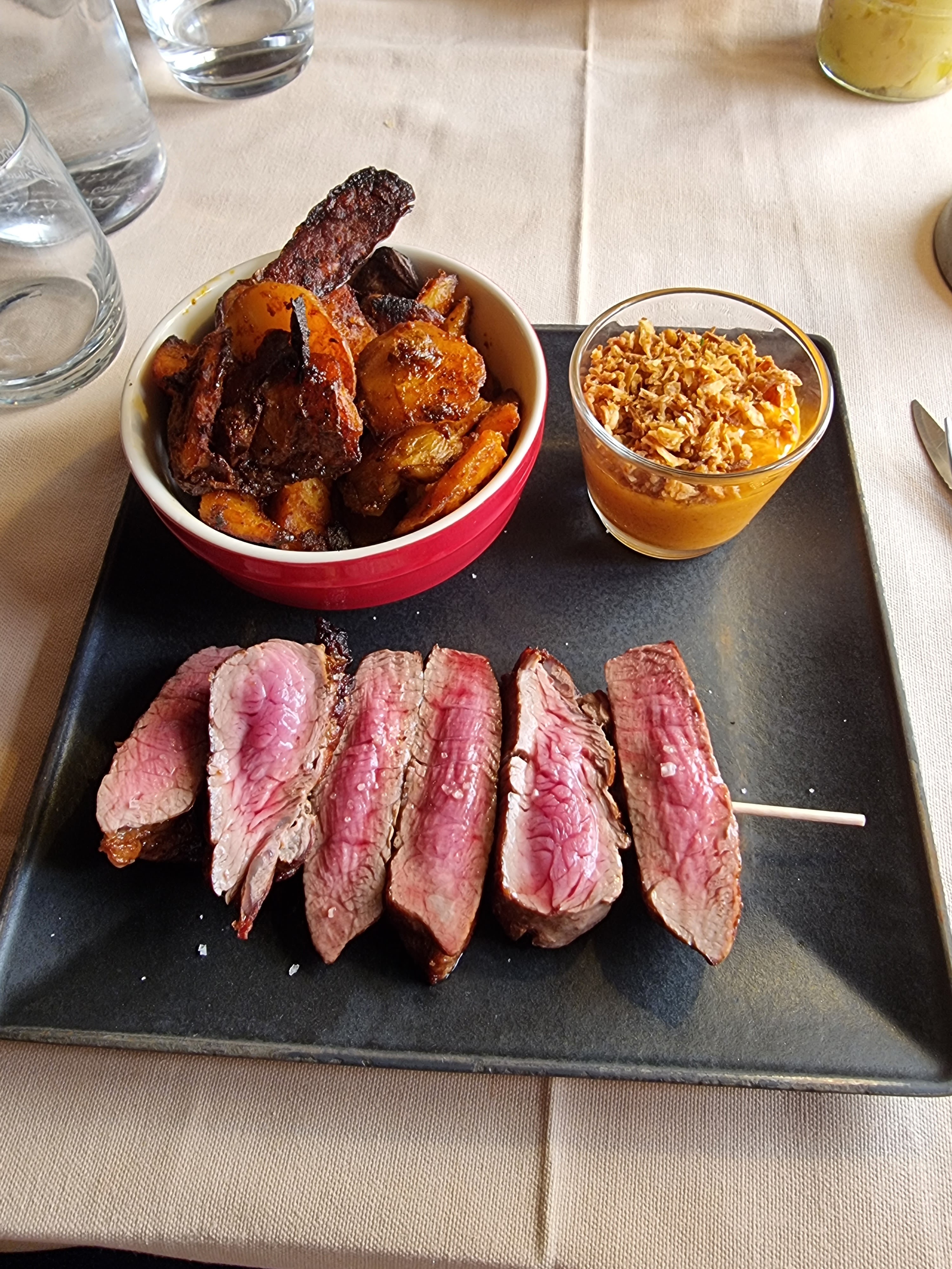 Nous sommes allés avec nos 2 enfants, un service impeccable, a l écoute et au petit soin pour les enfants. Le repas était excellent, une viande cuite a la perfection. Merci pour cette agreable soirée qui clôturait nos vacances.