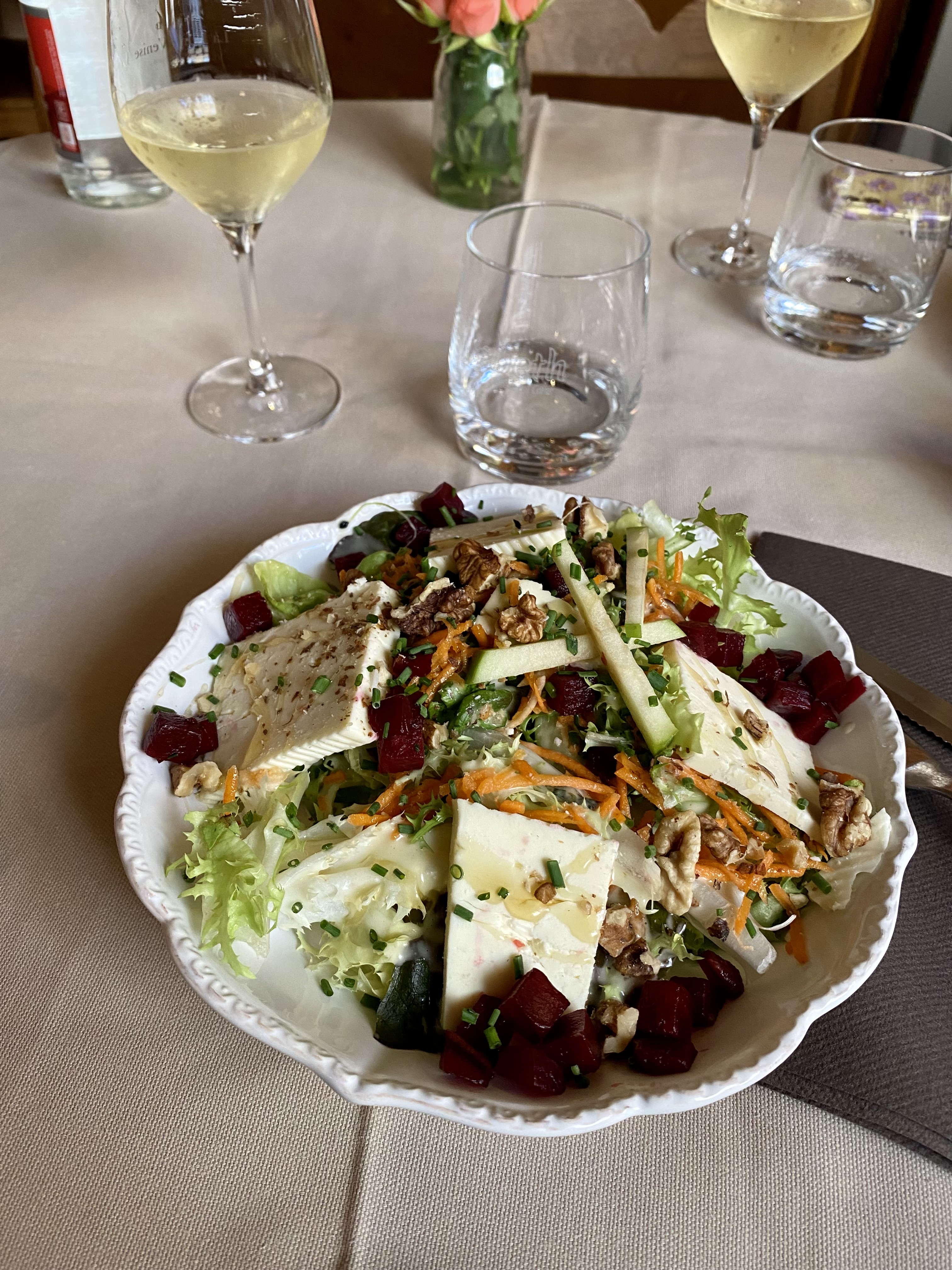 Repas correct sans plus vin blanc au verre bonne qualité. Ce restaurant a eu le Michelin en 2019 2021 pas a ce niveau en 2023 attention mlle la serveuse ne pas dire/ils sont insupportables les clients dans la salle de restaurant