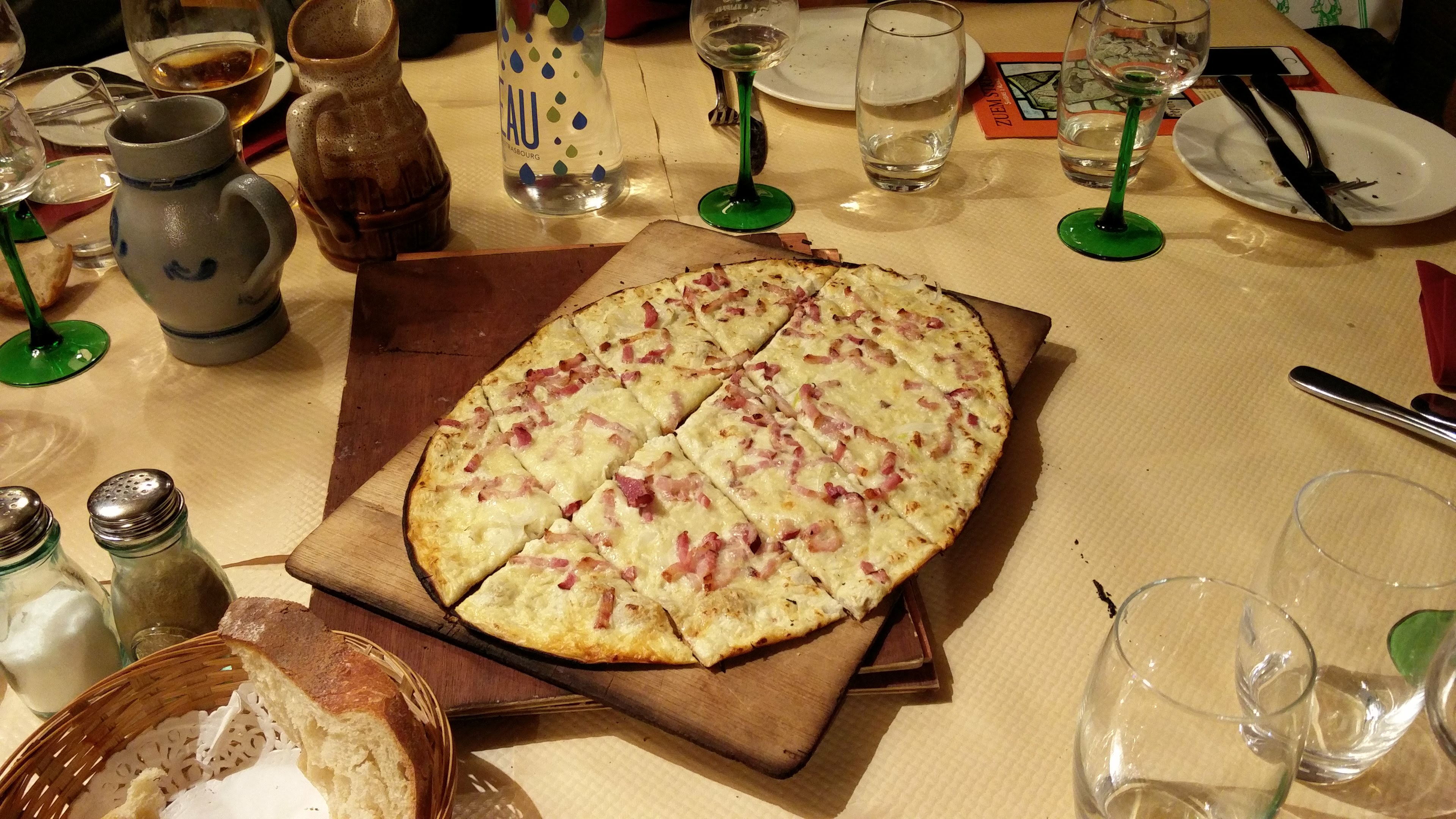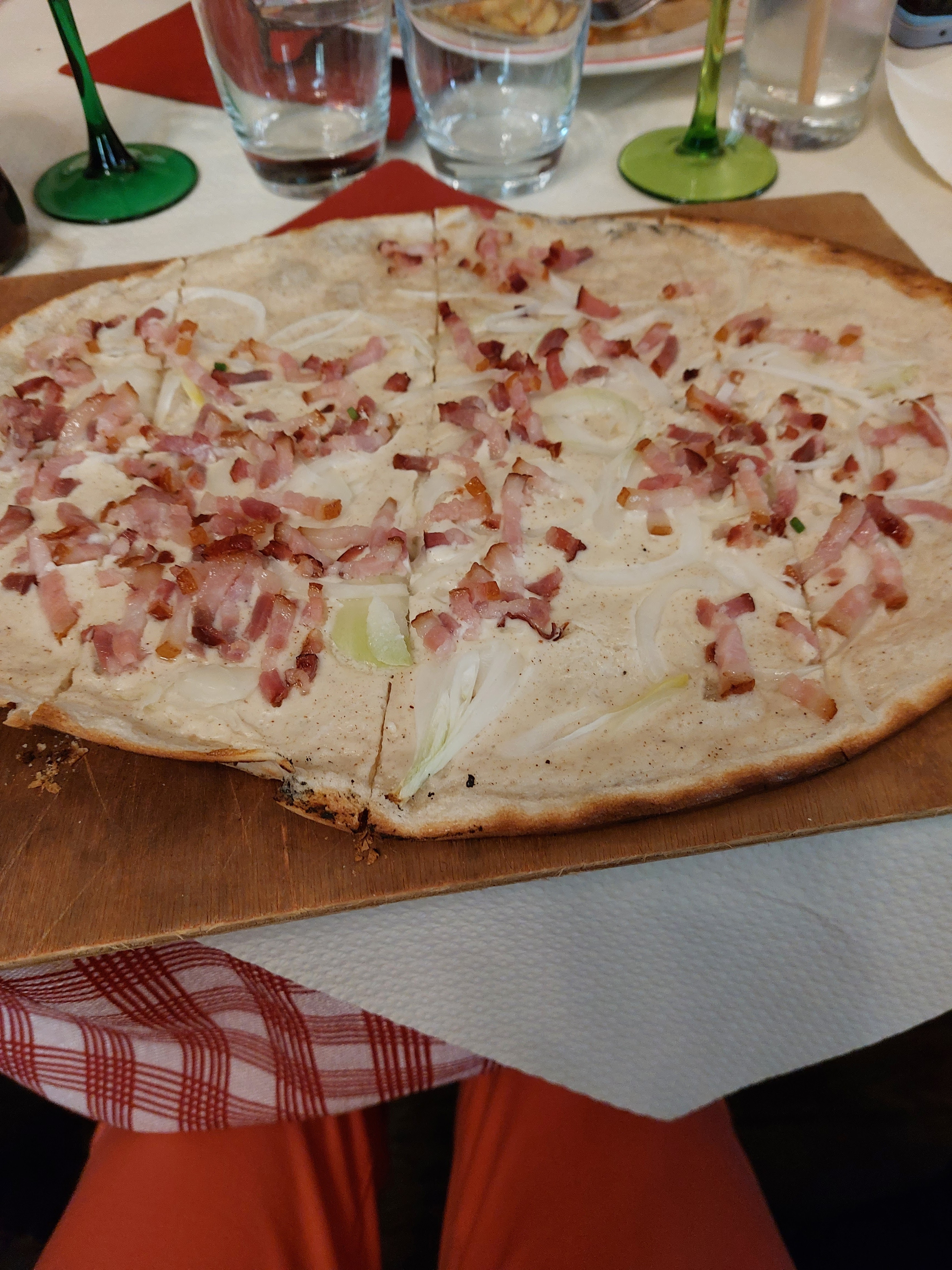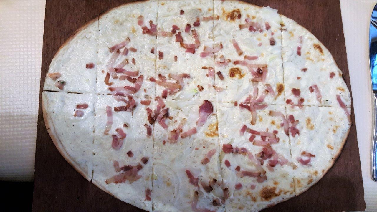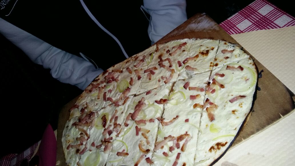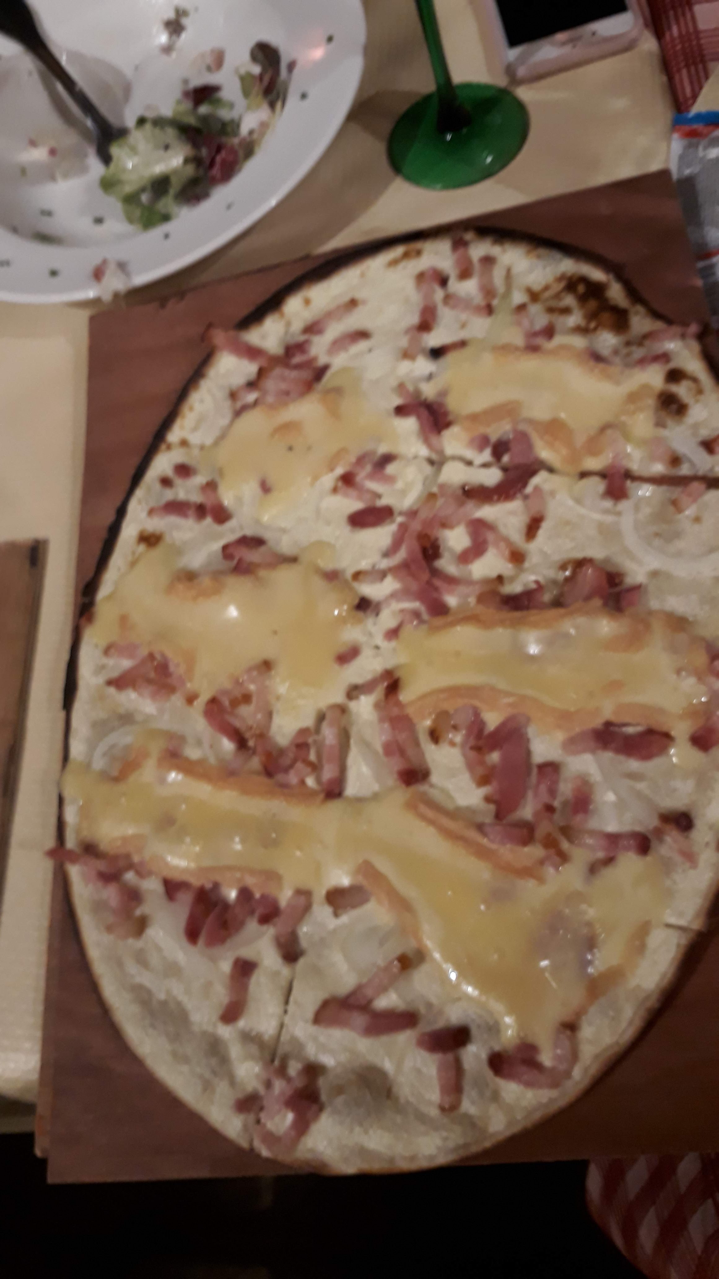Je n'ai pas du tout aimé cette flammekueche au Munster, servi sur une vulgaire planche de contreplaqué de 5mm d'un magasin de bricolage, qui plus est, déjà bien entamé par les nombreux coups de couteau. Enfin, la garniture avait une telle abondance de crème pour quelques morceaux de munster et sans aucun oignon dans la garniture que c'en était écoeurant et sans saveur pour un prix pas du tout en rapport. Sinon, l'endroit est agréable et assez typique, le service est correct.