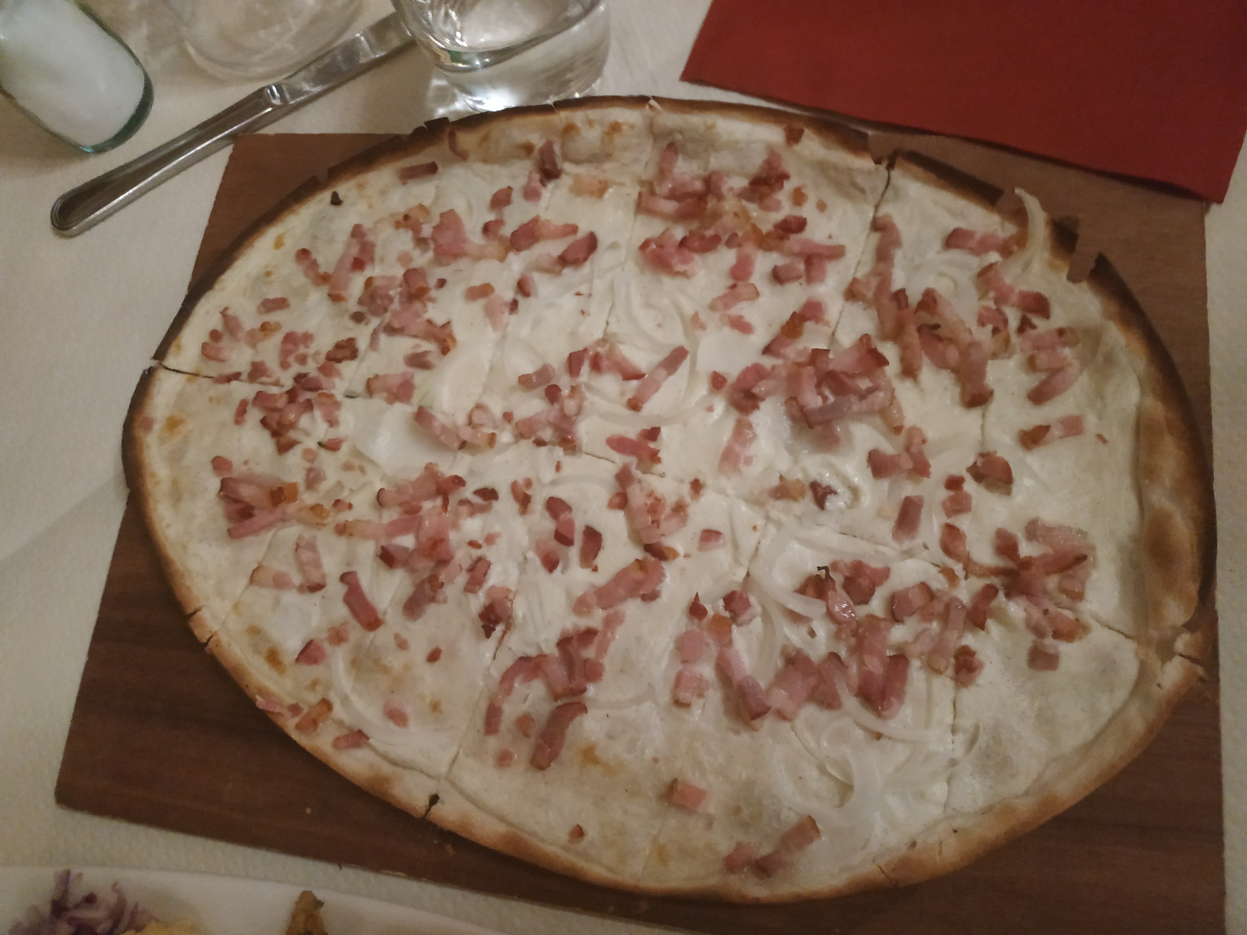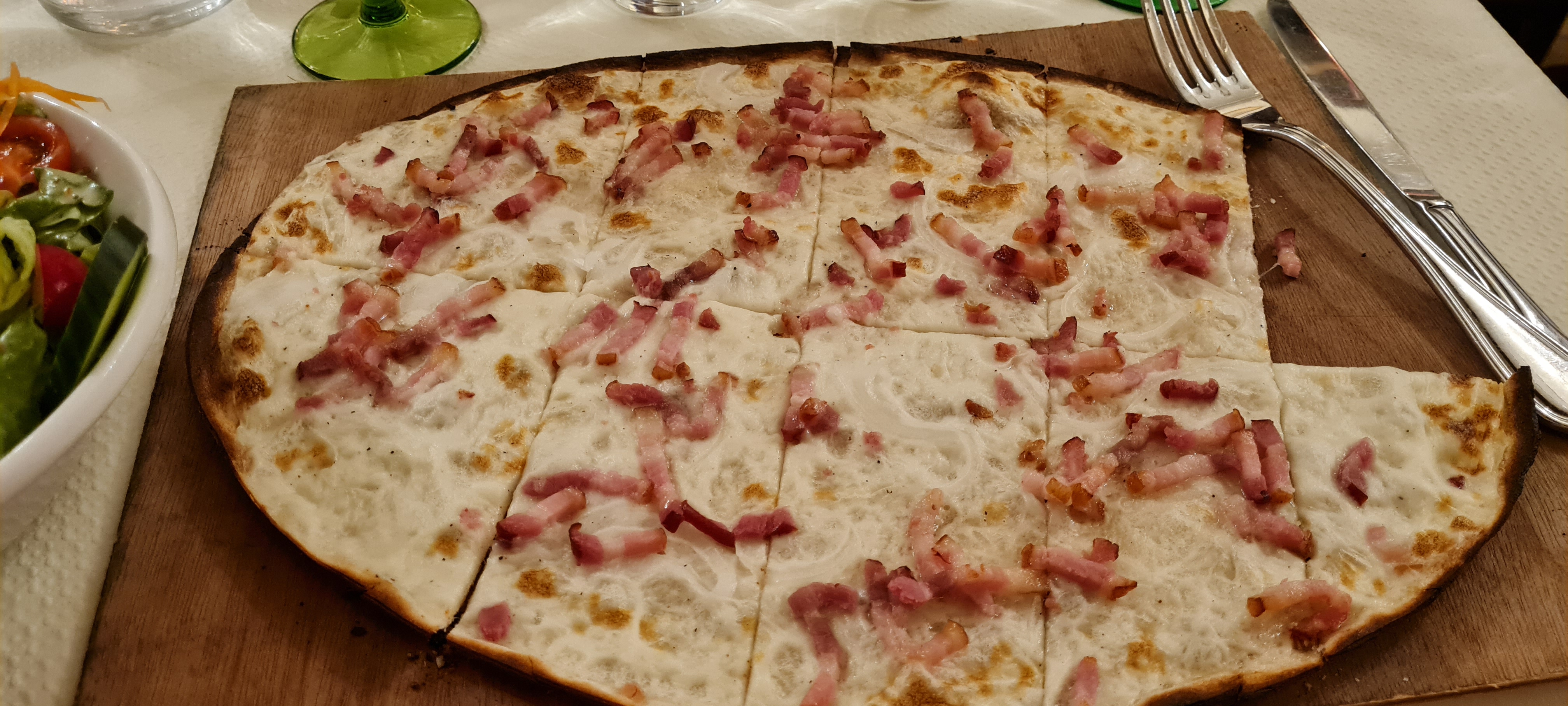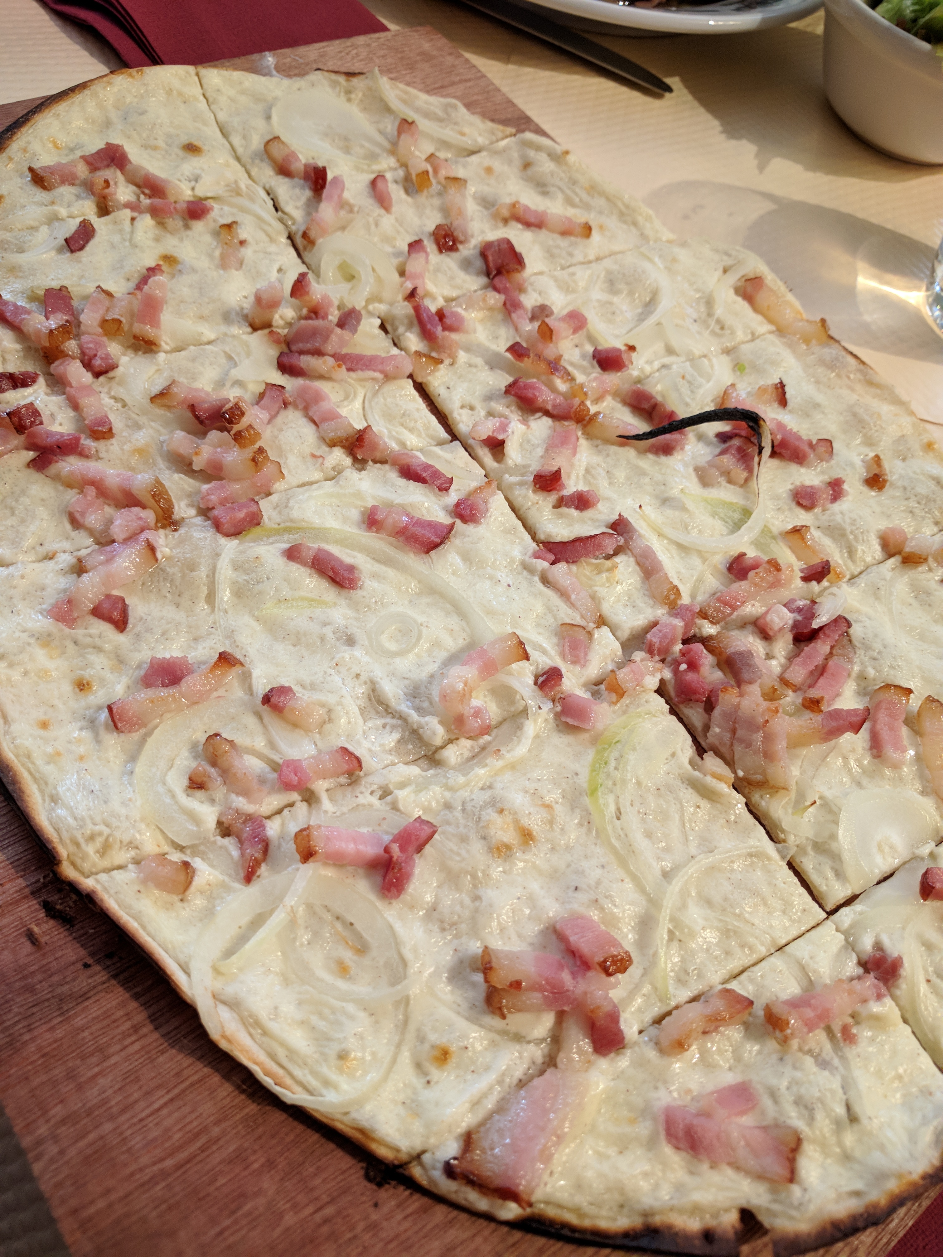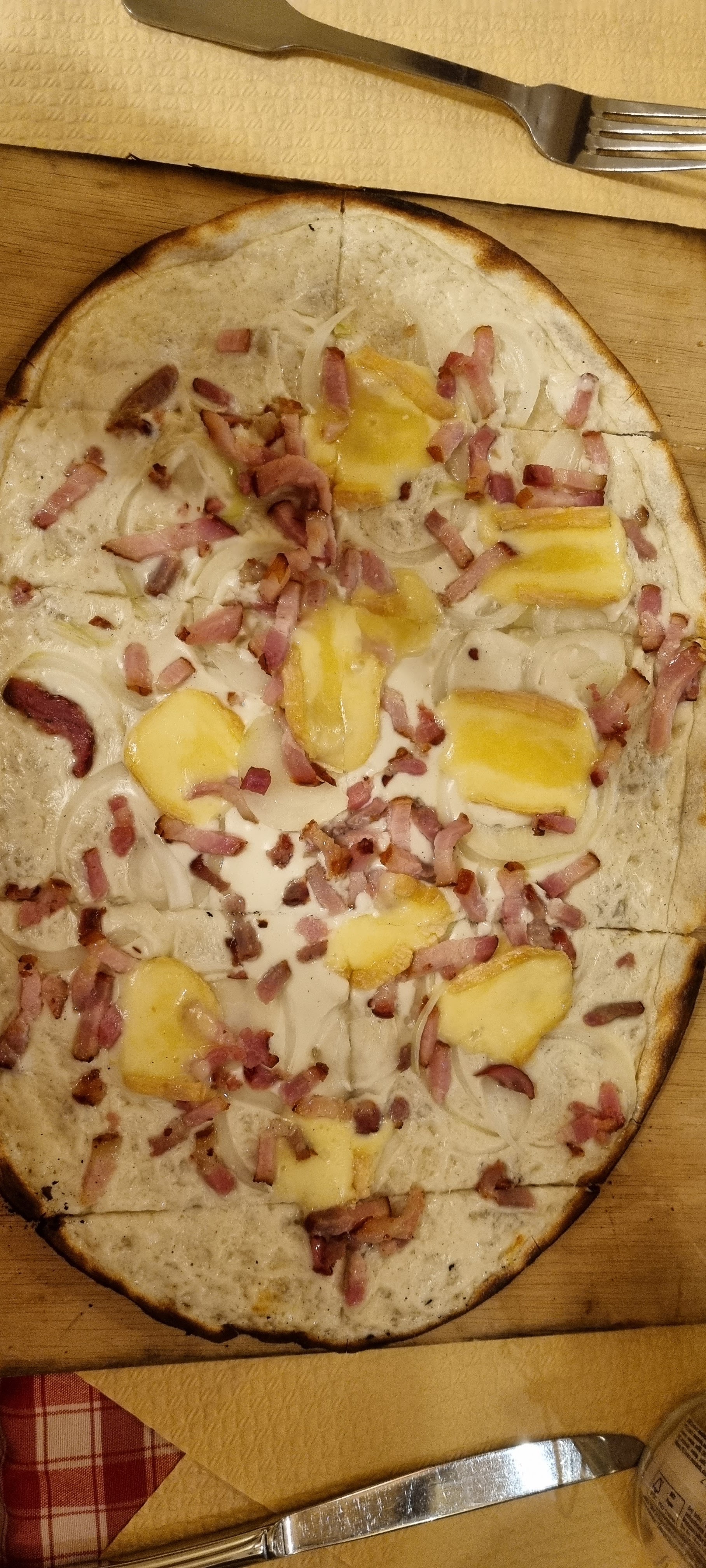 Je n'ai pas du tout aimé cette flammekueche au Munster, servi sur une vulgaire planche de contreplaqué de 5mm d'un magasin de bricolage, qui plus est, déjà bien entamé par les nombreux coups de couteau. Enfin, la garniture avait une telle abondance de crème pour quelques morceaux de munster et sans aucun oignon dans la garniture que c'en était écoeurant et sans saveur pour un prix pas du tout en rapport. Sinon, l'endroit est agréable et assez typique, le service est correct.