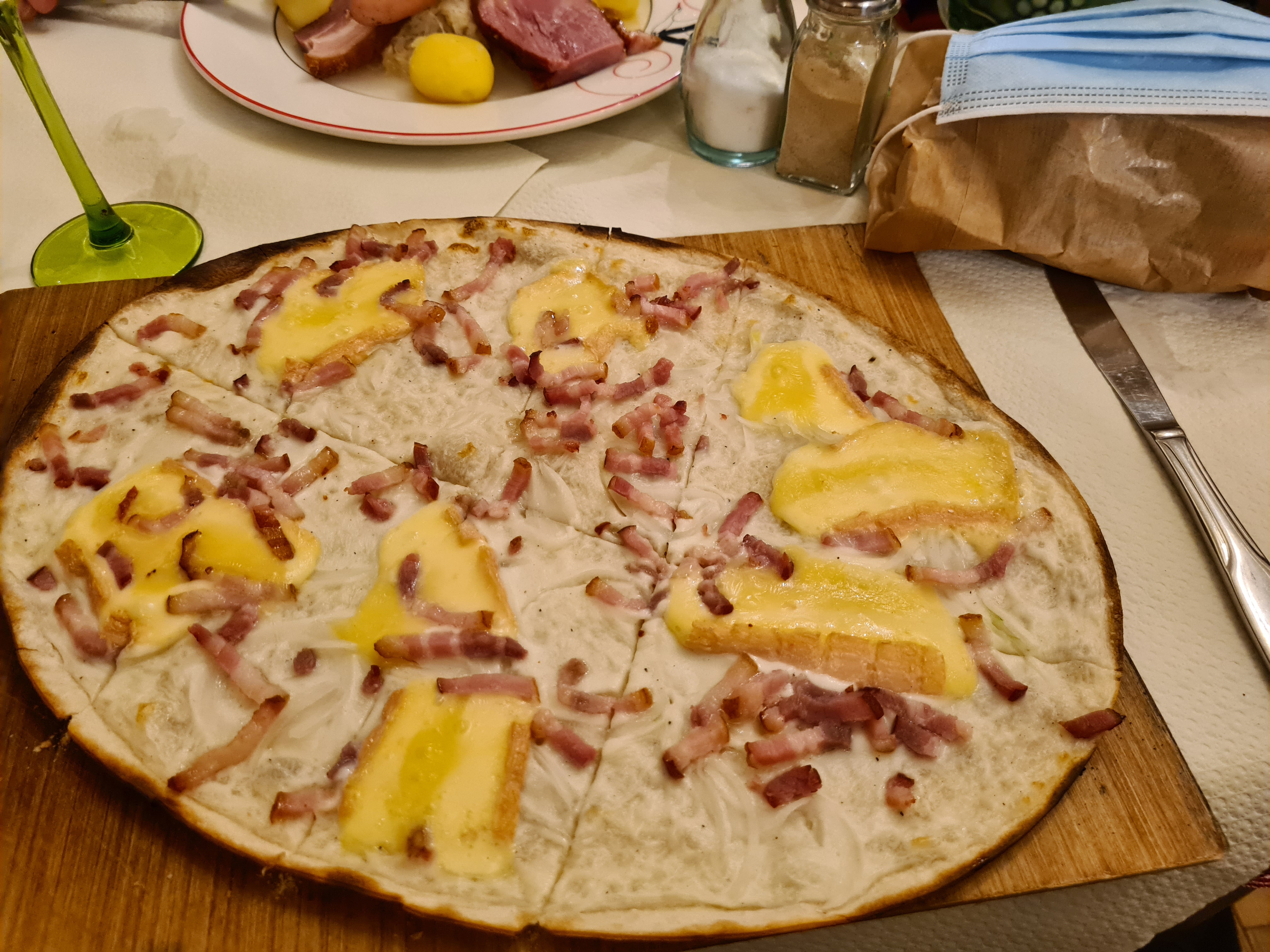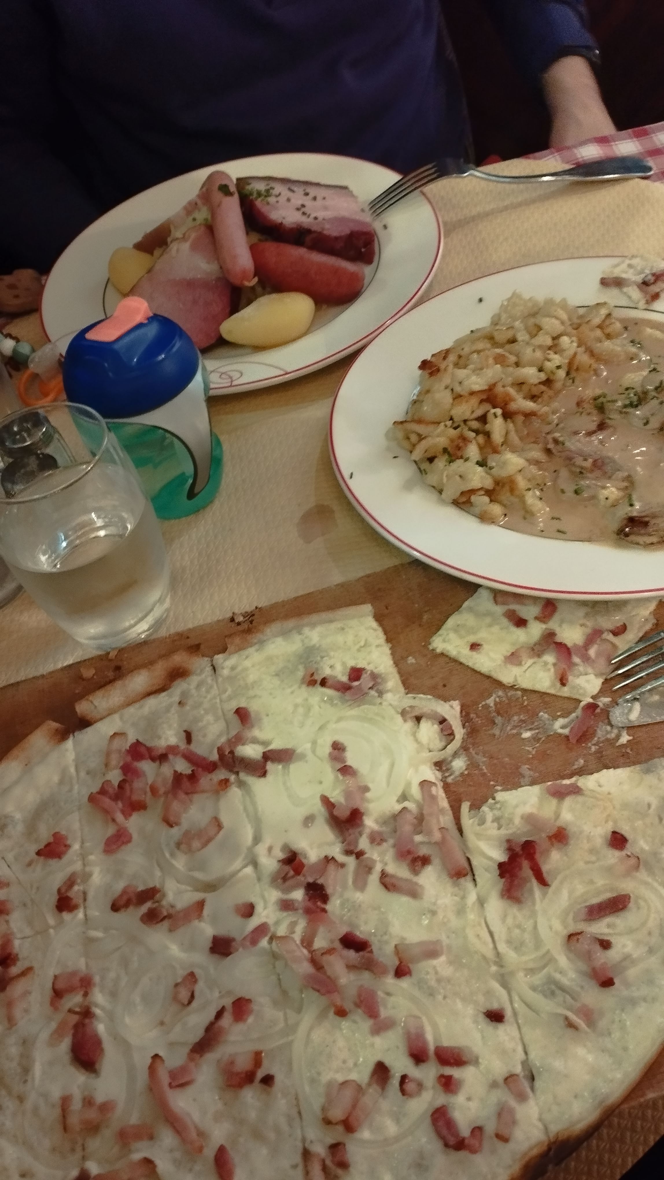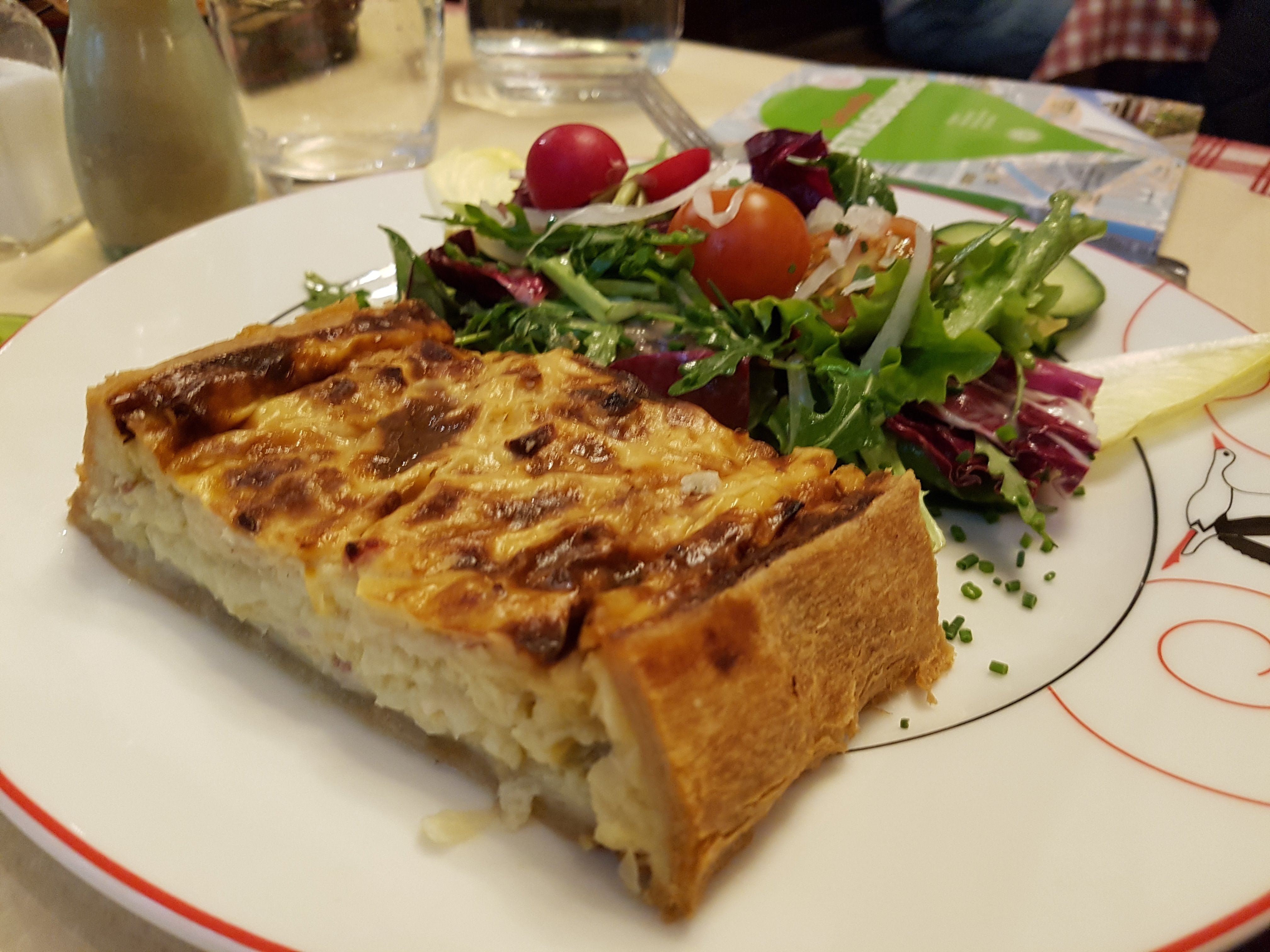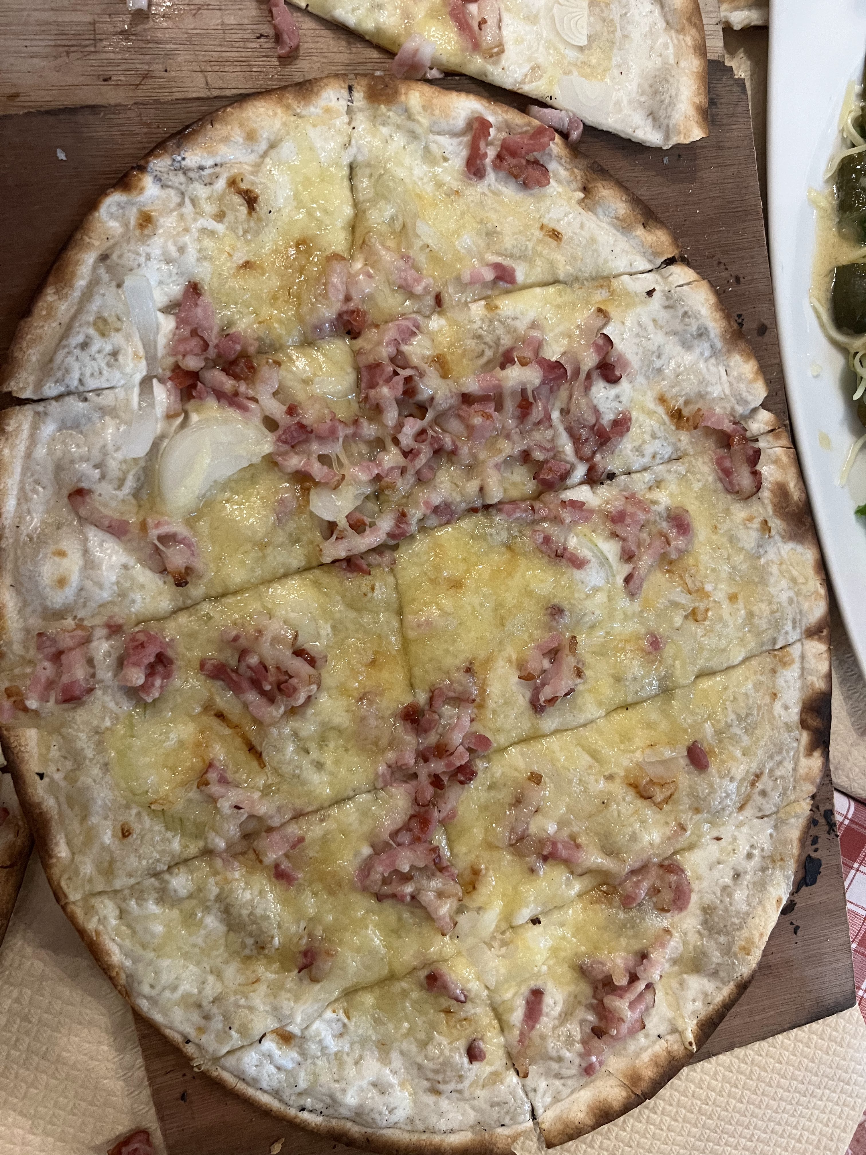 Je n'ai pas du tout aimé cette flammekueche au Munster, servi sur une vulgaire planche de contreplaqué de 5mm d'un magasin de bricolage, qui plus est, déjà bien entamé par les nombreux coups de couteau. Enfin, la garniture avait une telle abondance de crème pour quelques morceaux de munster et sans aucun oignon dans la garniture que c'en était écoeurant et sans saveur pour un prix pas du tout en rapport. Sinon, l'endroit est agréable et assez typique, le service est correct.