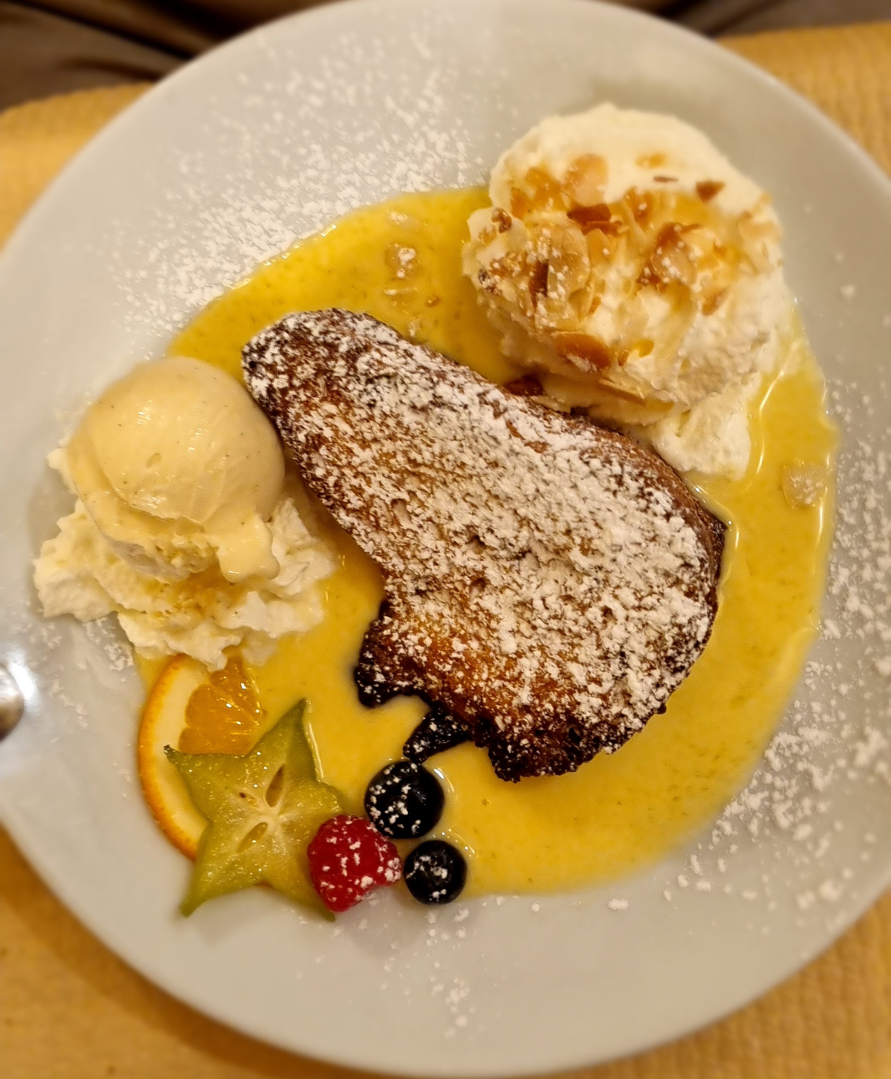 Arrêtés aux hasard dans ce restaurant pour déjeuner, nous avons eu une bonne surprise ! Tarte flambée très goûtues, serveur agréable et kouglof façon pain perdu absolument délicieux !
